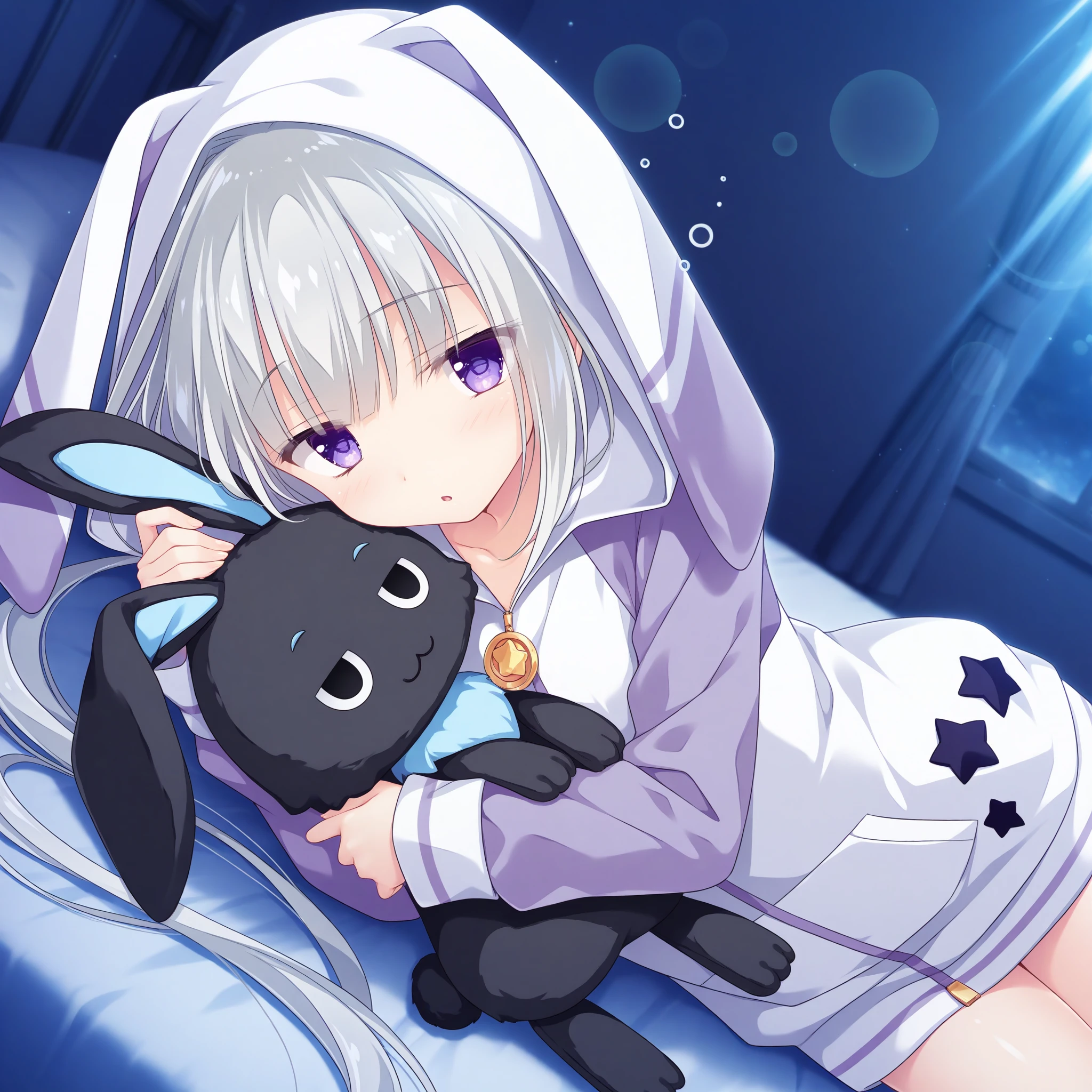 hood up,rabbit hood,hooded pajamas,long sleeves,white pajamas,purple sleeves,white sleeve cuffs,zipper pull tab,star print,————————————