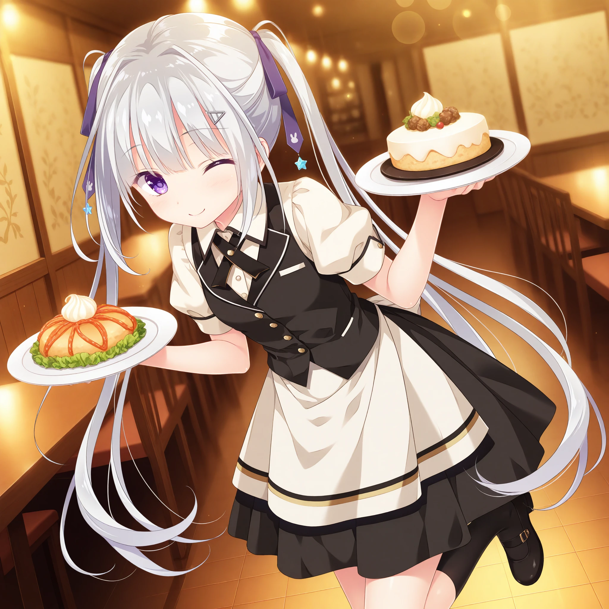 hairclip,hair ribbon,purple ribbon,star ornament,waitress,kneehighs,black socks,black vest,high-waist skirt,white skirt,black skirt,pleated skirt,layered skirt,long skirt,collared shirt,white shirt,puffy short sleeves,collared vest,buttons,waist apron,wing collar,neck ribbon,black ribbon,睡衣帽衫 (pajamas hoodie)