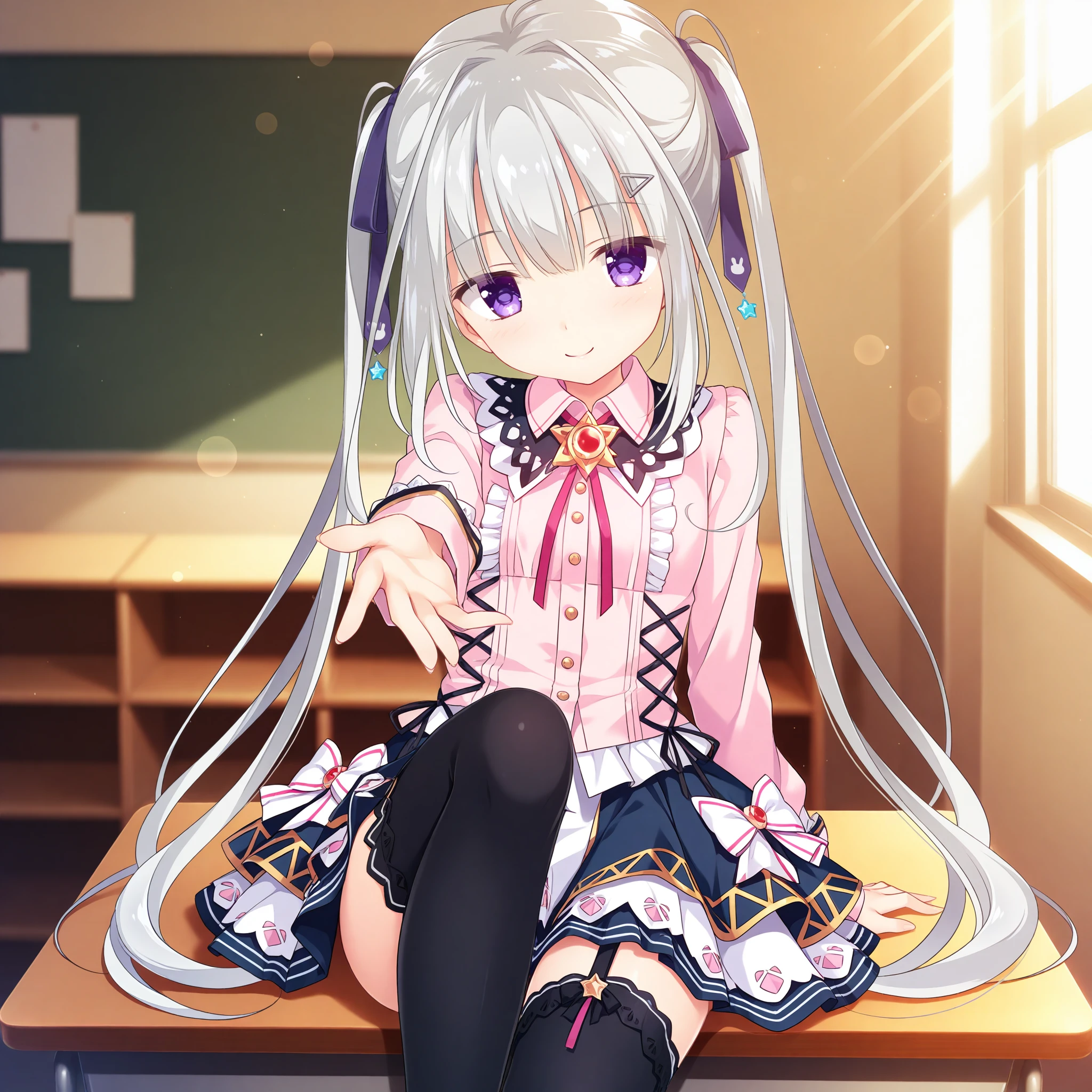 hairclip,hair ribbon,purple ribbon,school uniform,black thighhighs,long sleeves,pink shirt,collared shirt,center frills,frilled shirt,white frills,buttons,neck ribbon,pink ribbon,pink sleeve cuffs,frilled sleeve cuffs,red brooch,gold brooch,layered skirt,white skirt,skirt bow,white bow,dark blue skirt,pleated skirt,gold trim,ribbon-trimmed shirt,dark blue ribbon,miniskirt,lace-trimmed thighhighs,服务员 (waitress)