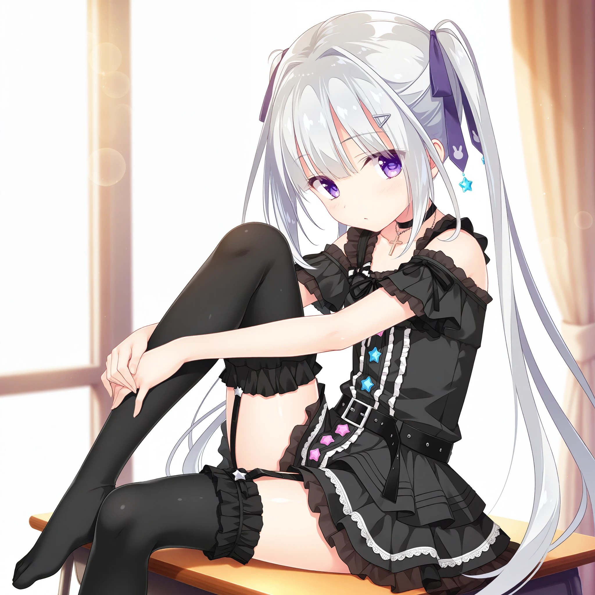 hairclip,hair ribbon,purple ribbon,casual,black dress,garter straps,black choker,frilled dress,white frills,black frills,off-shoulder dress,black straps,frilled straps,dress ribbon,black ribbon,star button,buttons,black sleeves,short sleeves,frilled sleeves,detached sleeves,black belt,belt buckle,cross necklace,layered dress,black thighhighs,frilled thighhighs,校服 (school uniform)