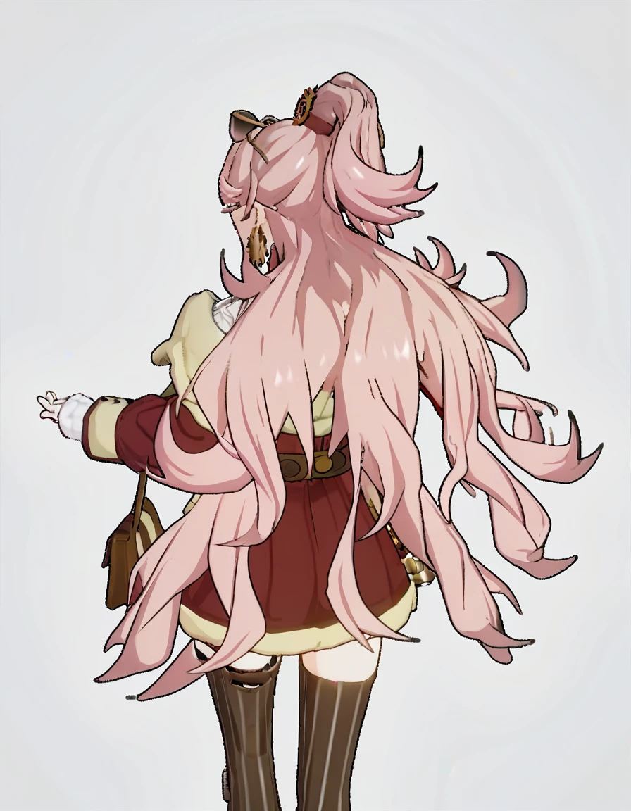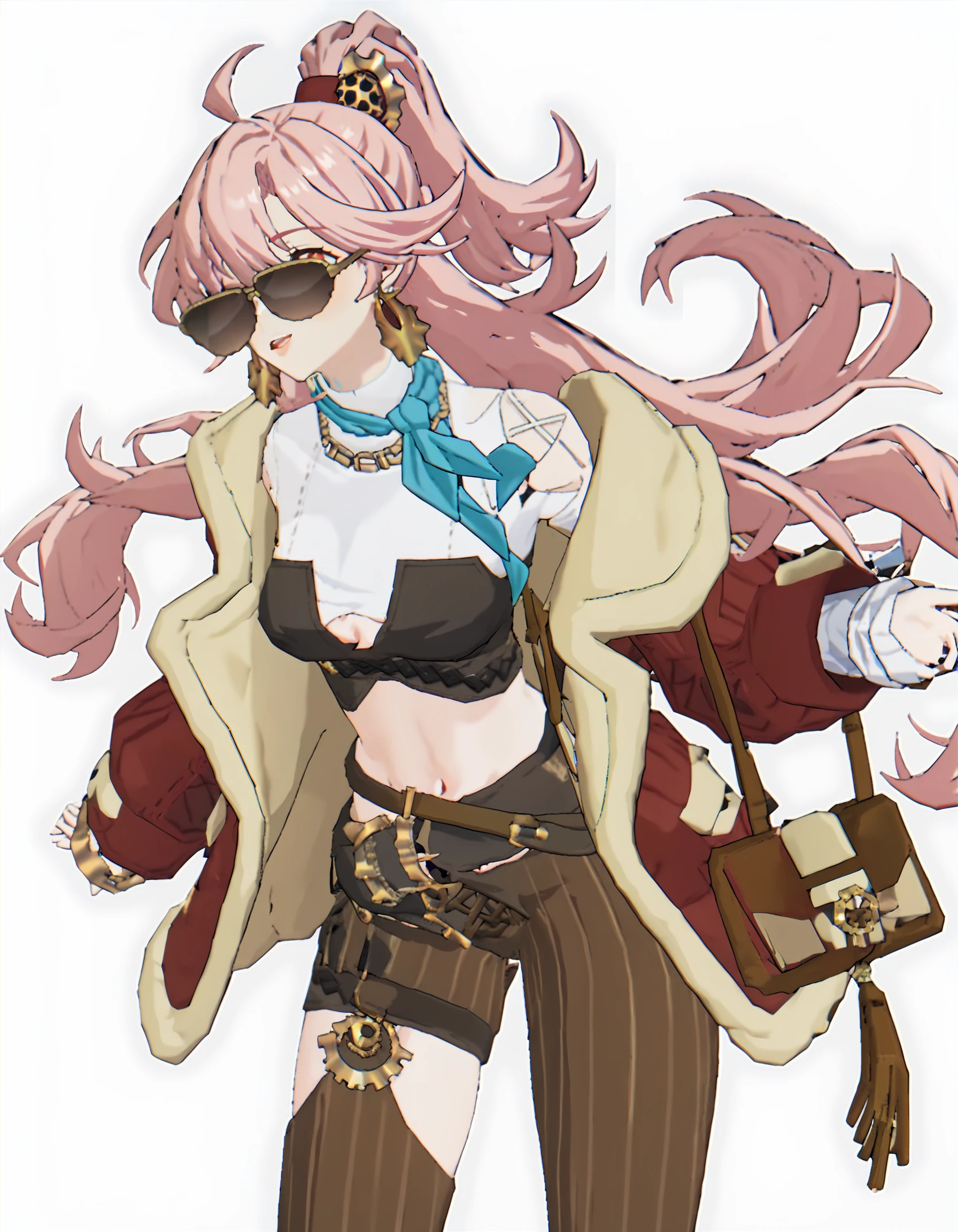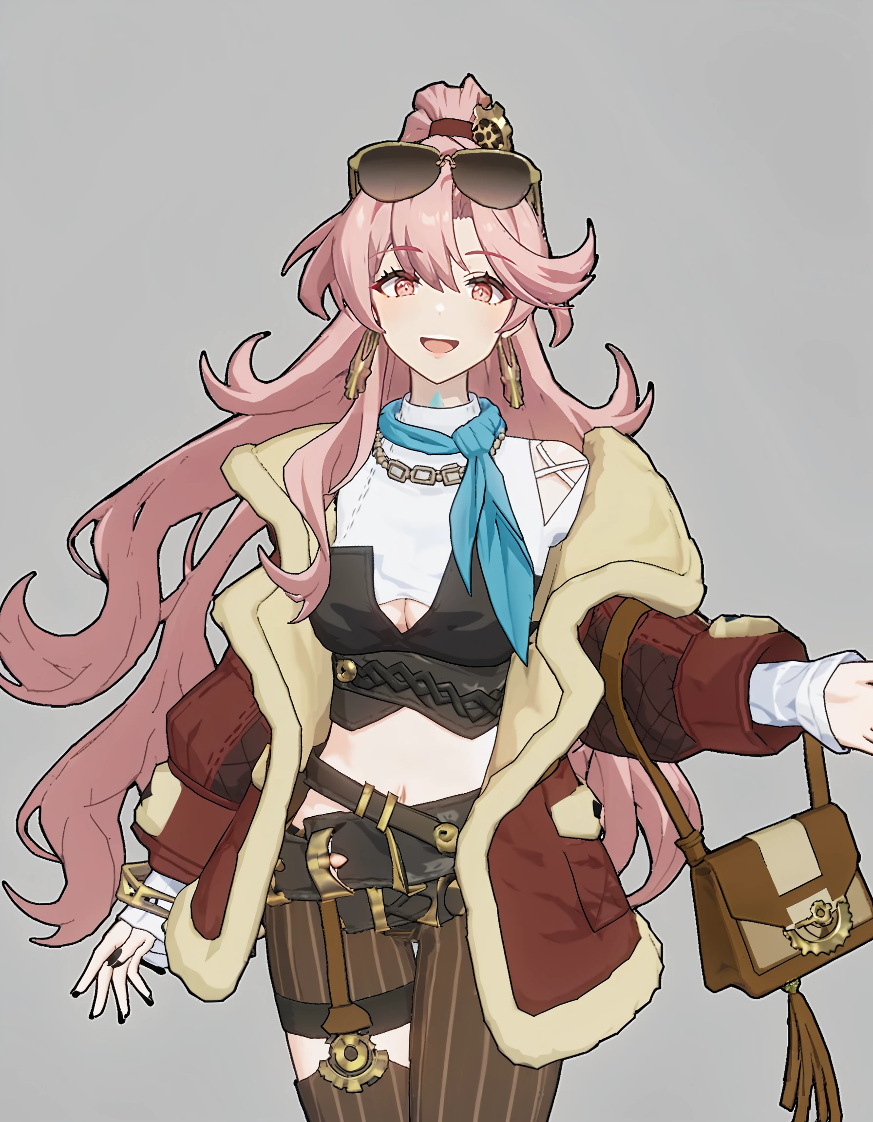 jialifu,1girl,solo,eyewear on head,long hair,pink hair,sunglasses,jewelry,earrings,navel,bag,belt,long sleeves,red eyes,fur trim,bangs,striped,ponytail,midriff,jacket,hair between eyes,可选风格 强调建模画风: