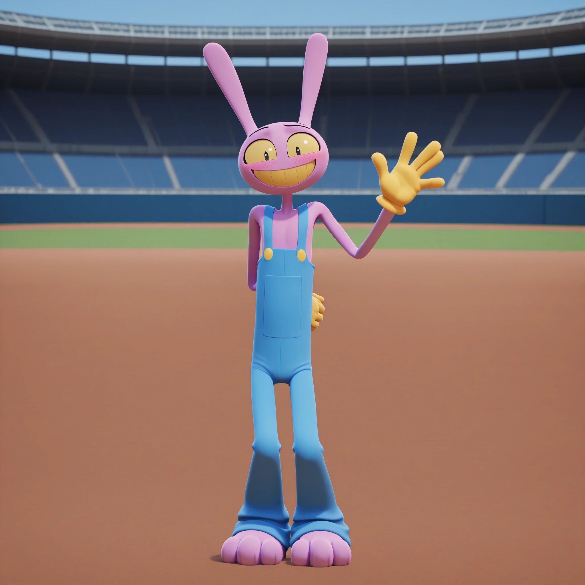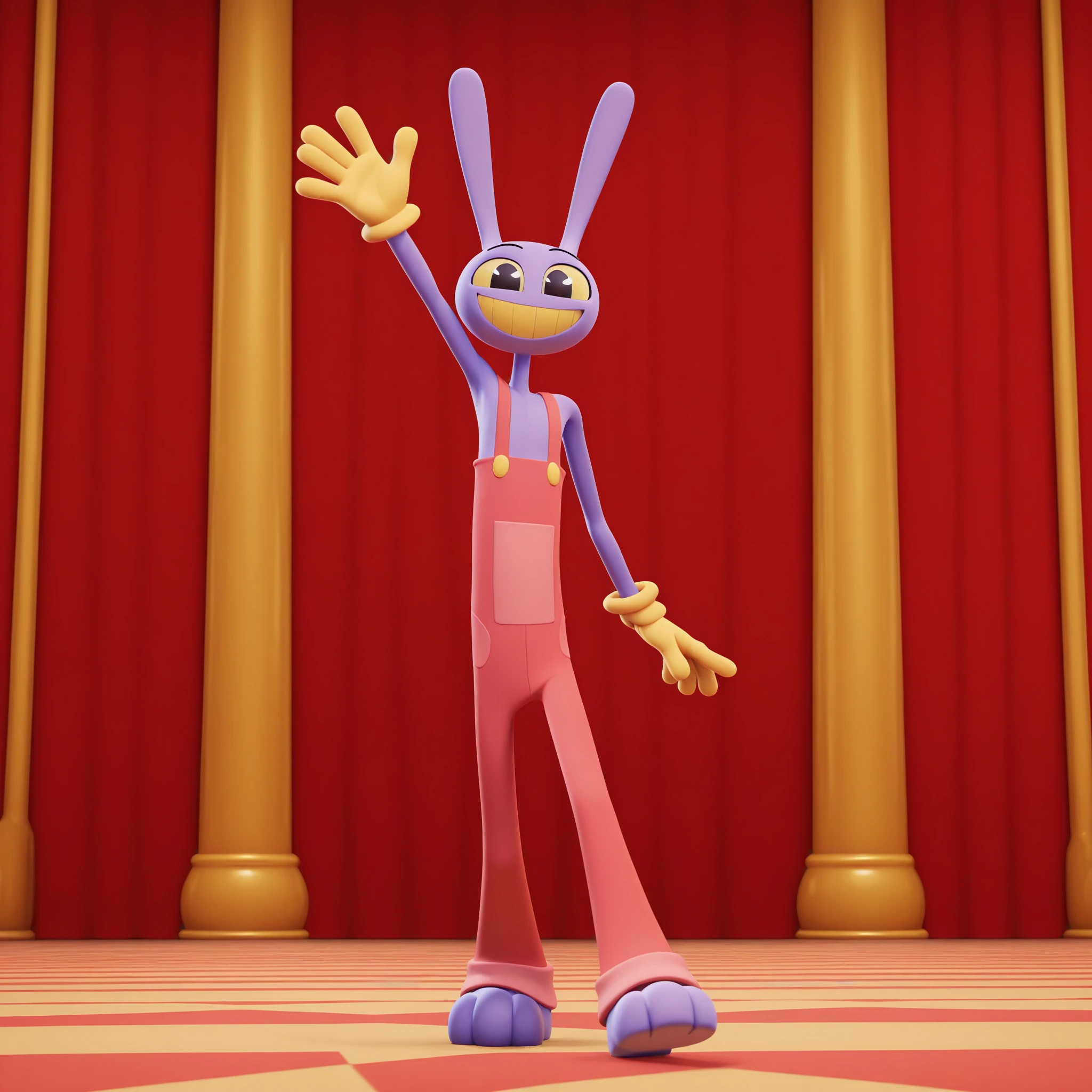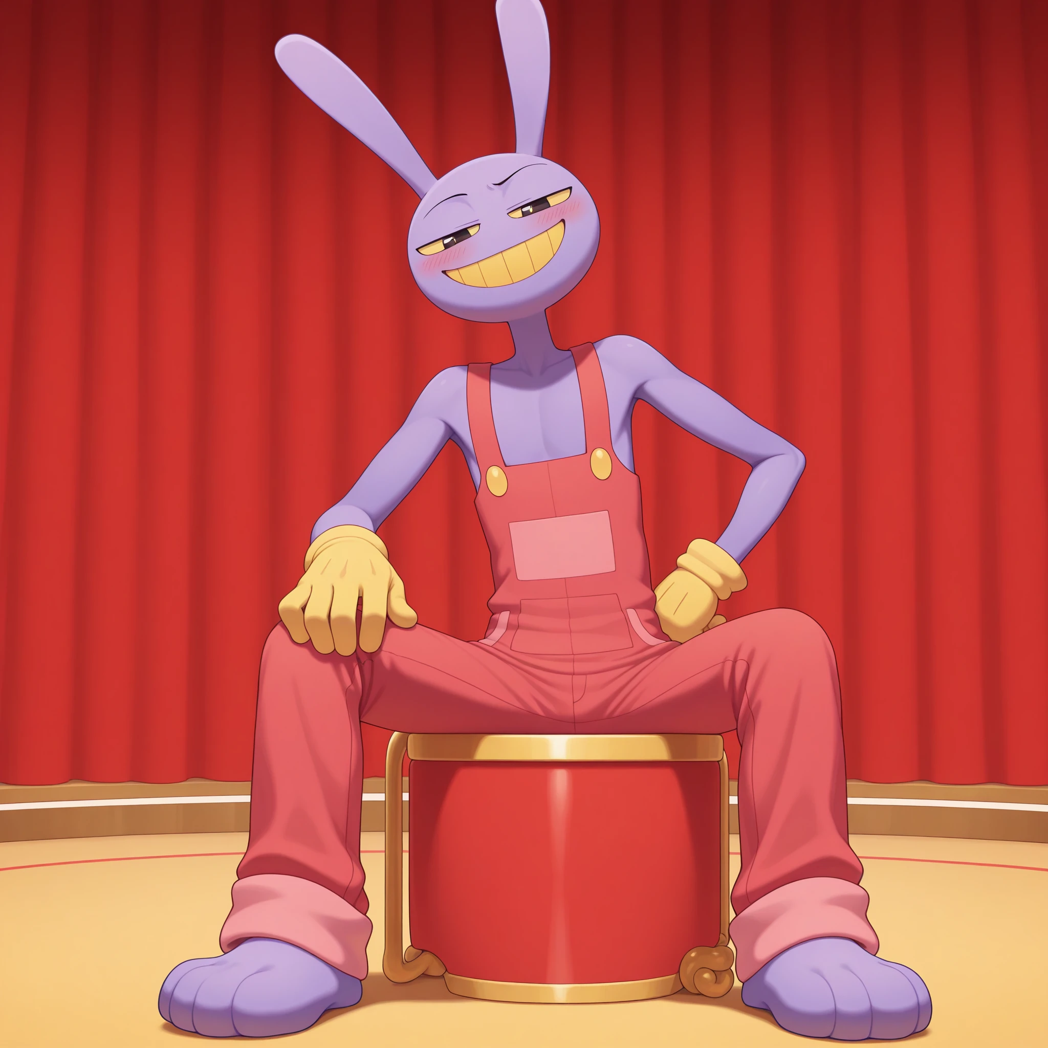 Regular Outfit: jaxtadc, jax (the amazing digital circus), rabbit boy, yellow sclera, purple skin, rabbit ears, parted lips, yellow teeth, yellow gloves, red overalls