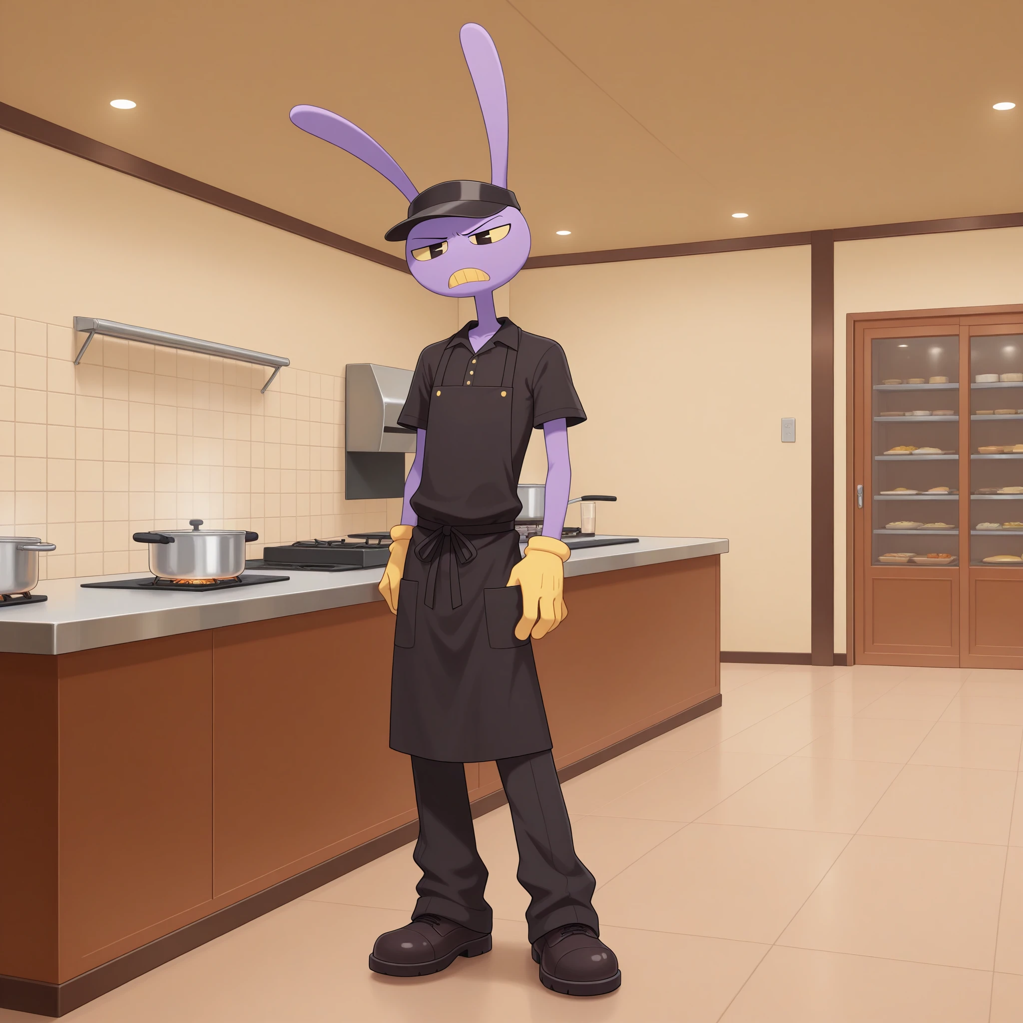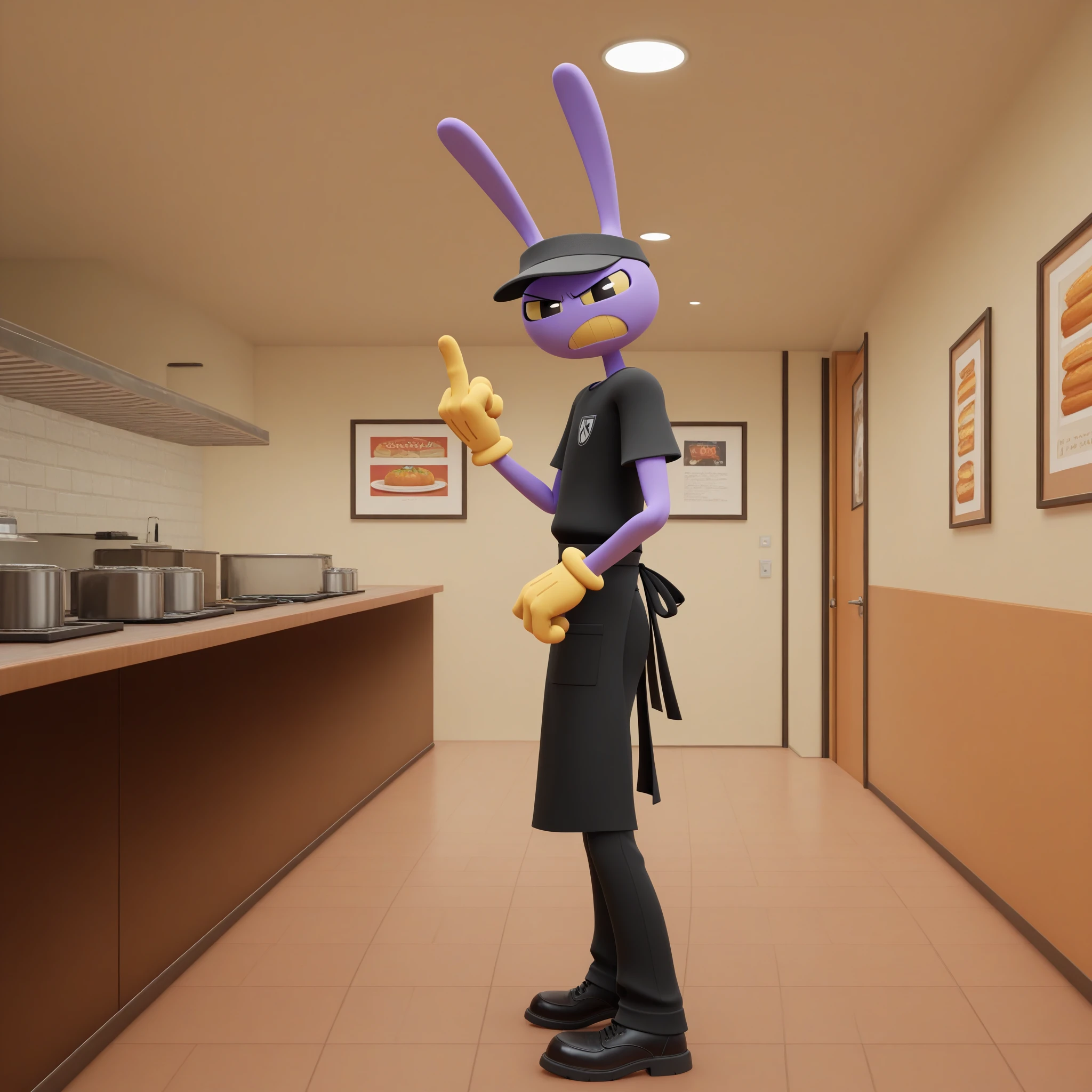 Fast Food Outfit: jaxtadc, jax (the amazing digital circus), rabbit boy, yellow sclera, purple skin, rabbit ears, parted lips, yellow teeth, yellow gloves, black visor cap, black shirt, black apron, black pants, black oxfords