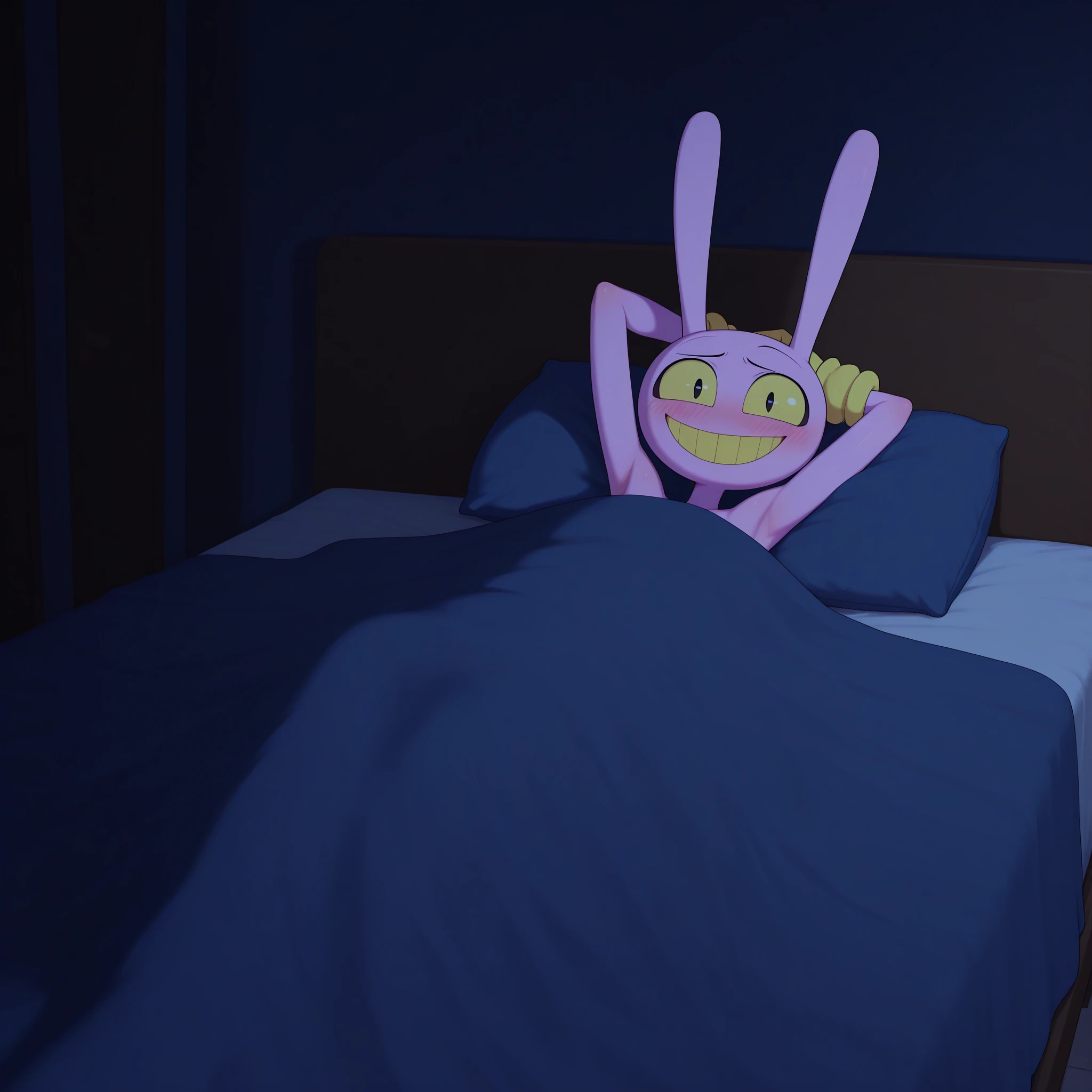 "Evil" Jax: jaxtadc, jax (the amazing digital circus), rabbit boy, yellow sclera, pink skin, rabbit ears, parted lips, yellow teeth, yellow gloves, blue overalls, shy, constricted pupils