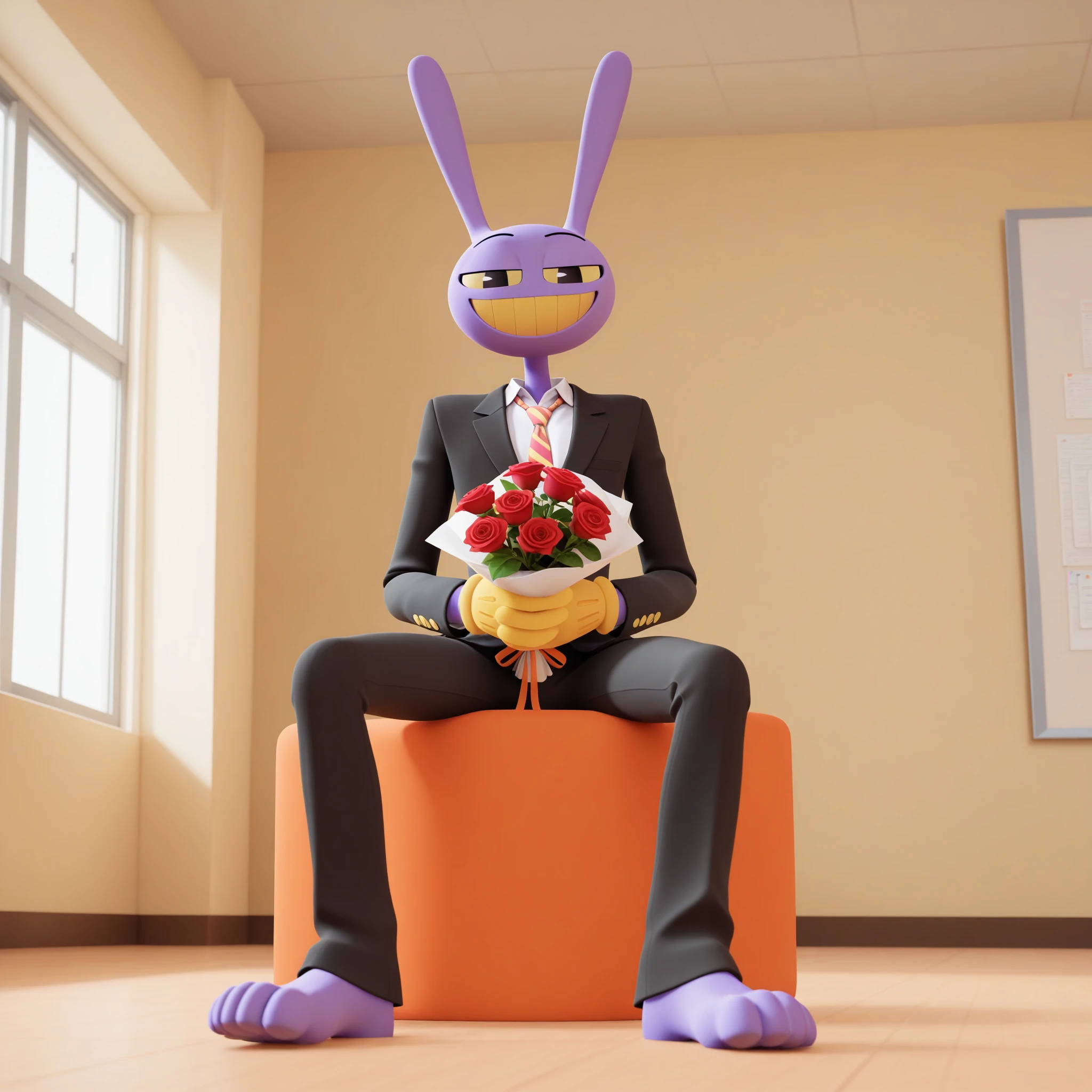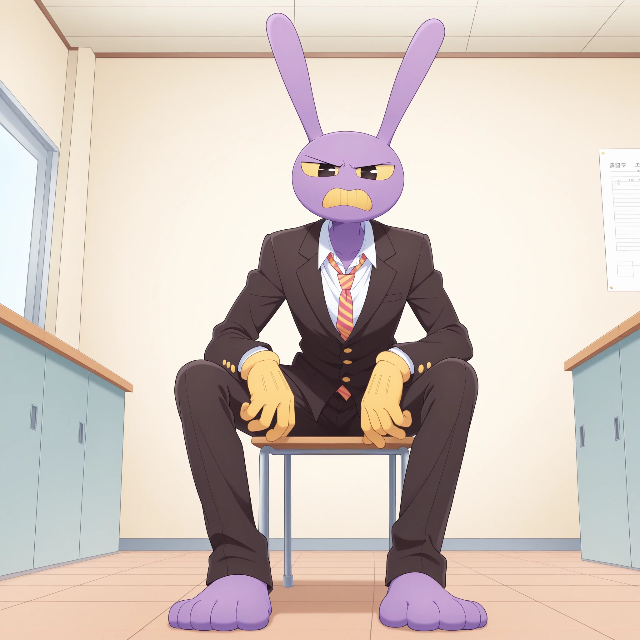 Student Outfit: jaxtadc, jax (the amazing digital circus), rabbit boy, yellow sclera, purple skin, rabbit ears, parted lips, yellow teeth, yellow gloves, black suit jacket, white dress shirt, striped necktie, black pants