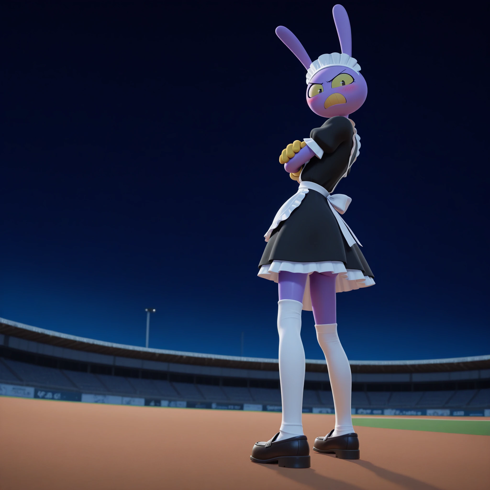 Maid Outfit: jaxtadc, jax (the amazing digital circus), rabbit boy, yellow sclera, eyelashes, purple skin, rabbit ears, parted lips, yellow teeth, yellow gloves, maid, maid headdress, frills, black dress, white waist apron, white over-kneehighs, black loafers