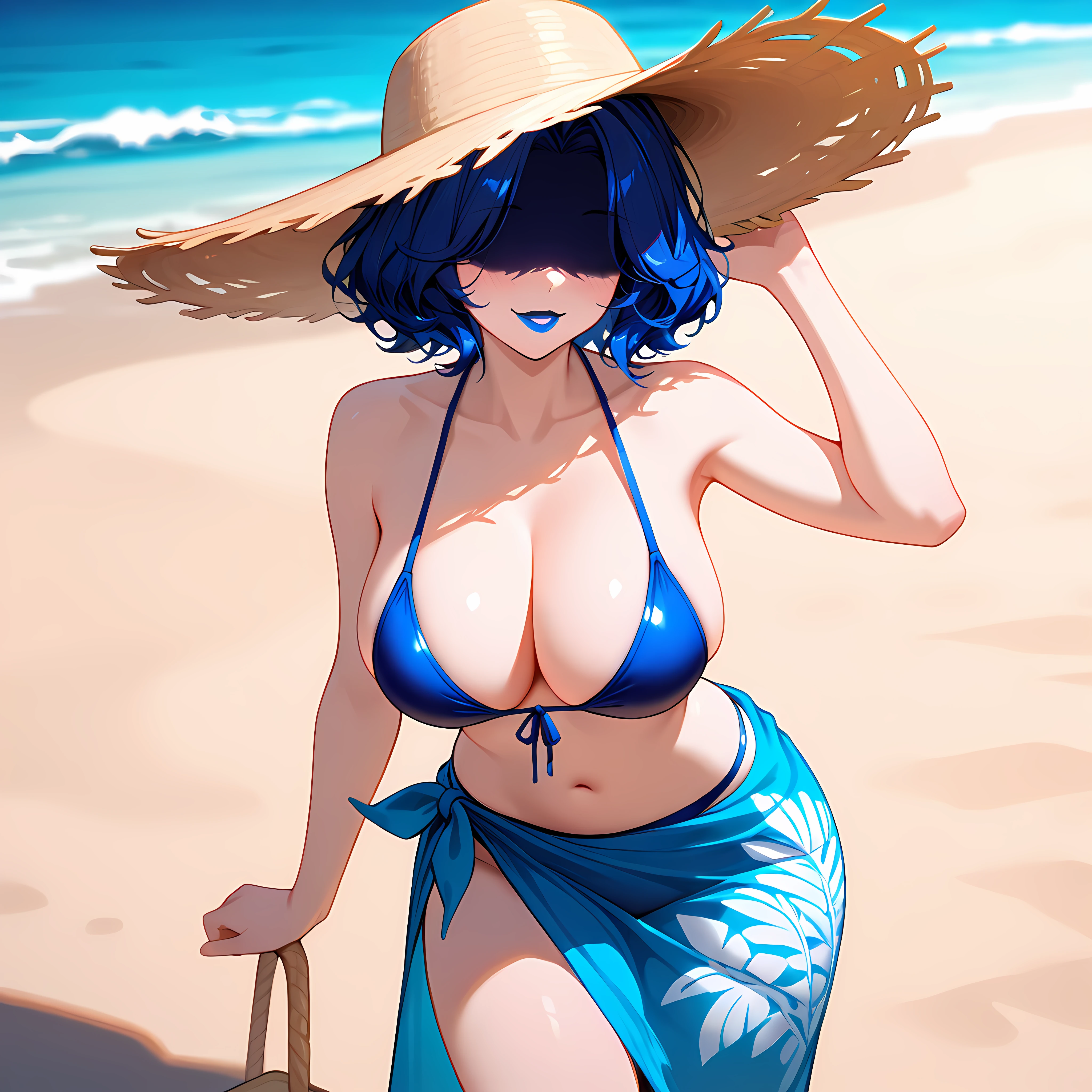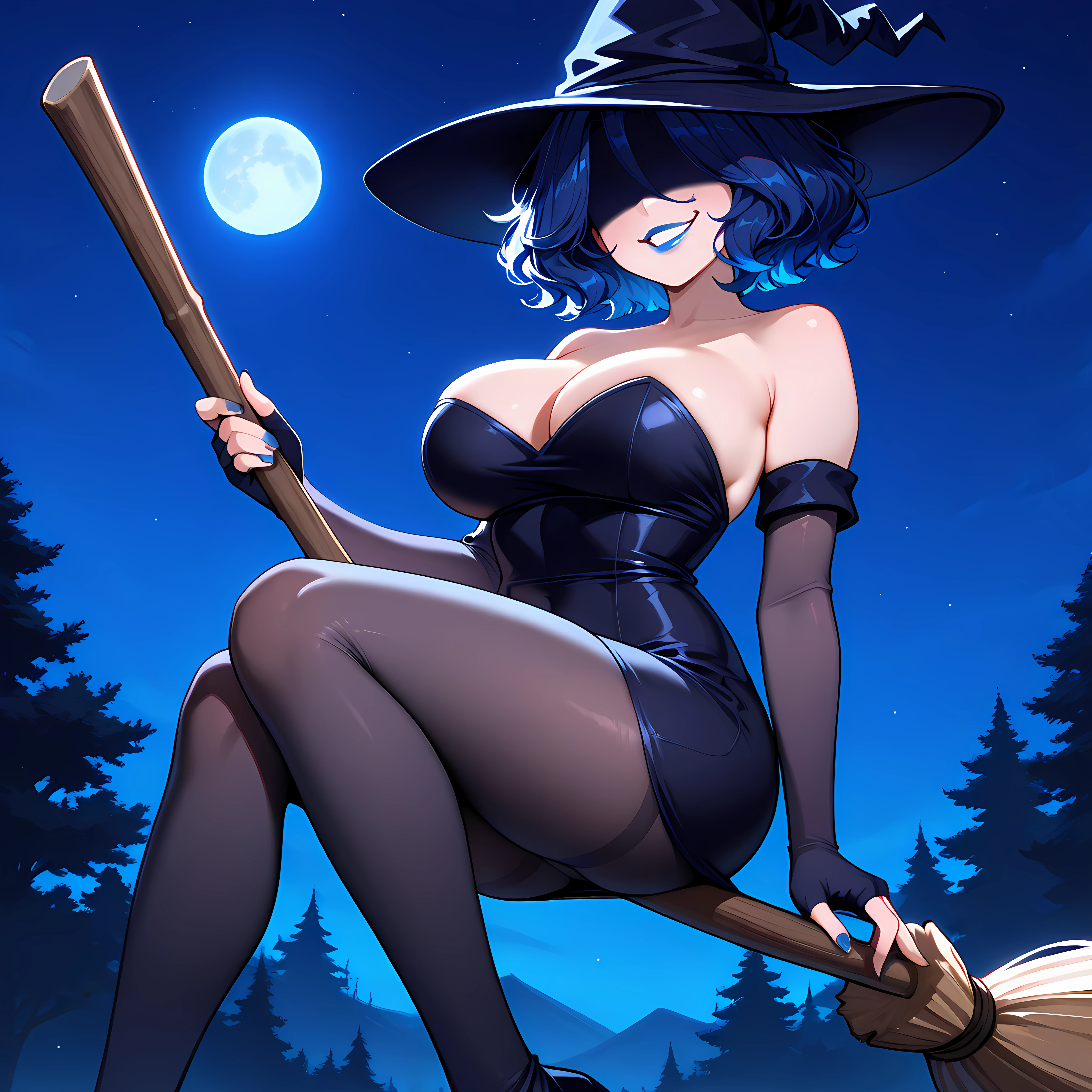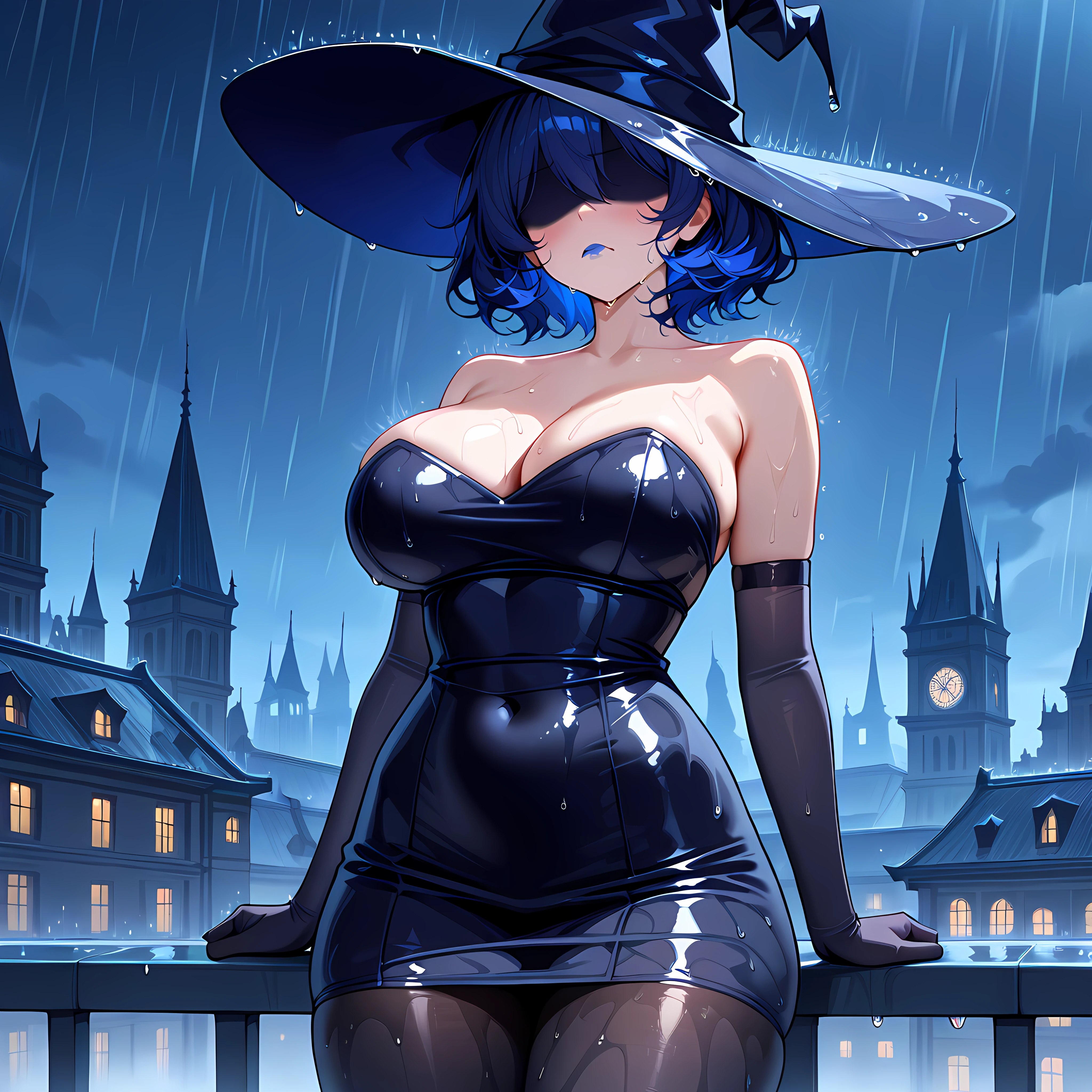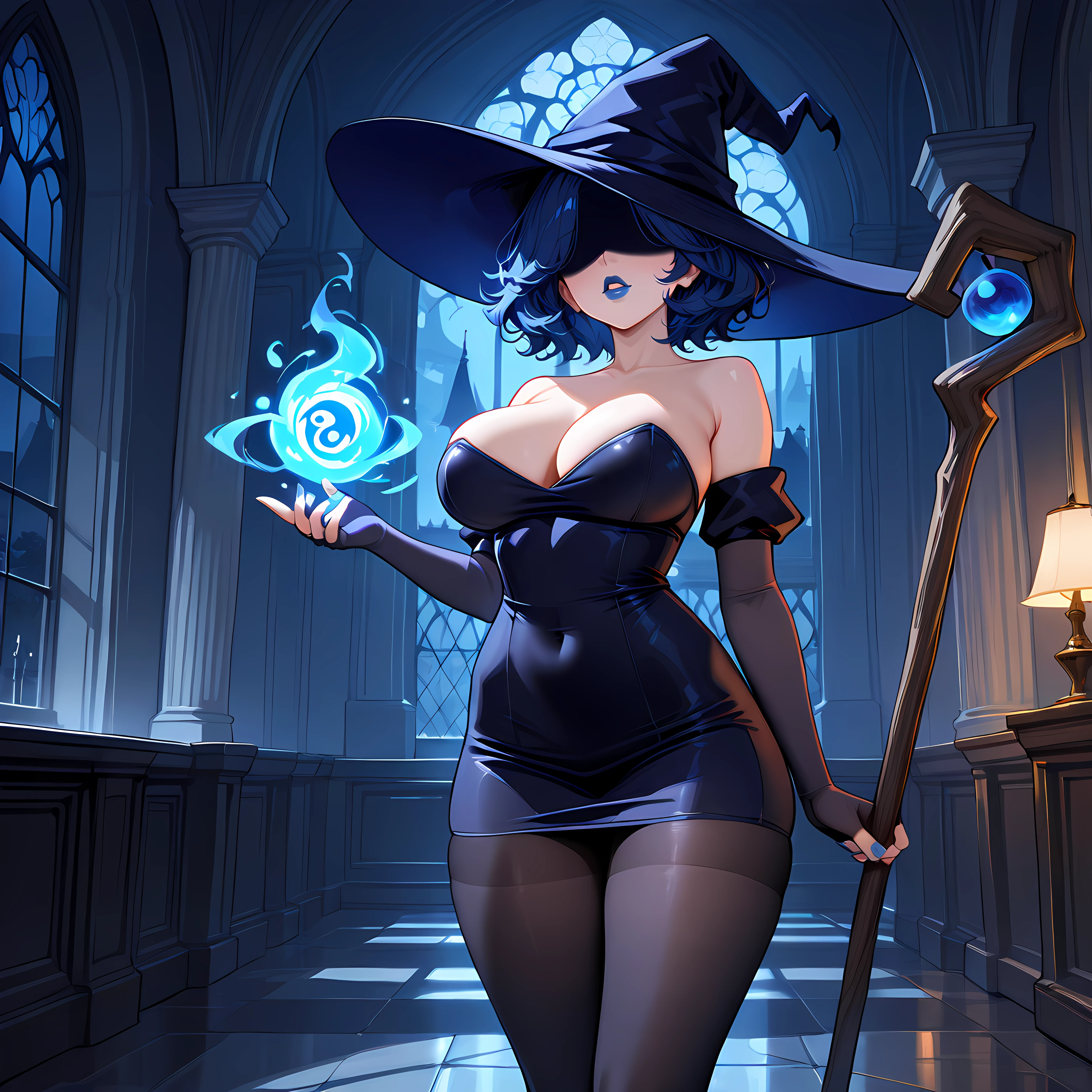 large breasts, no eyes, shadowed eyes, blue hair, blue lipstick, fingerless gloves, elbow gloves, bare shoulders, strapless dress, black dress, witch hat, pantyhose