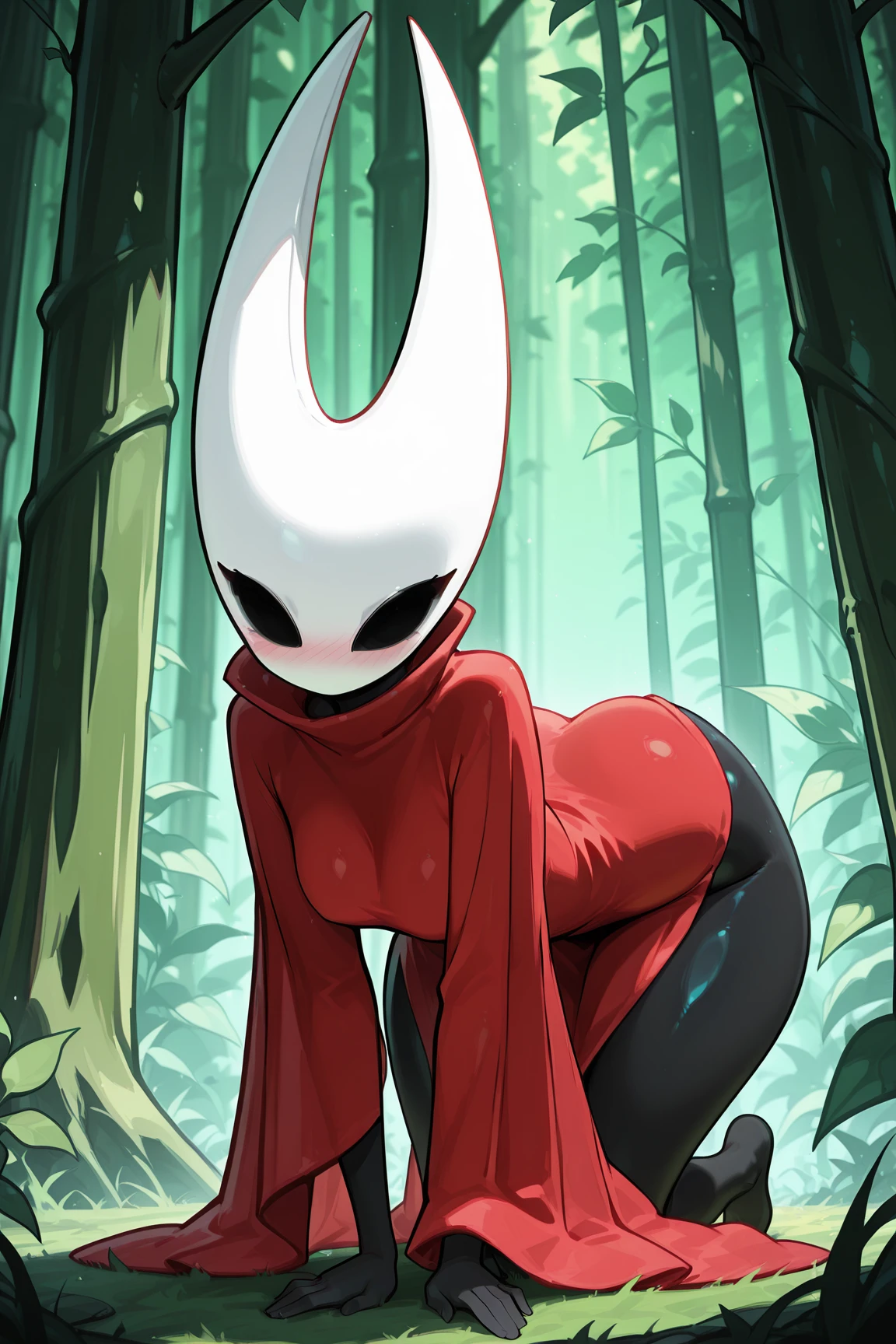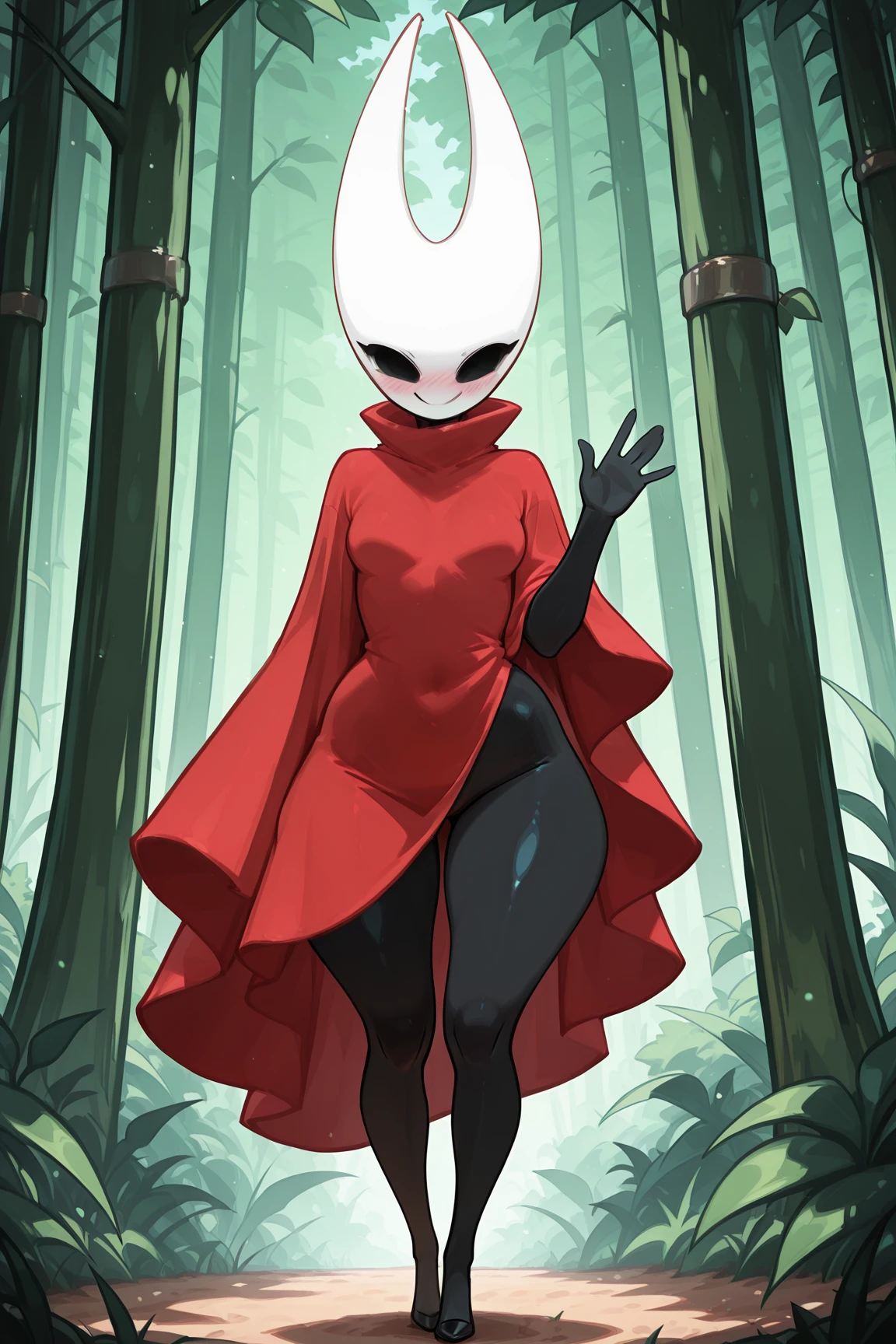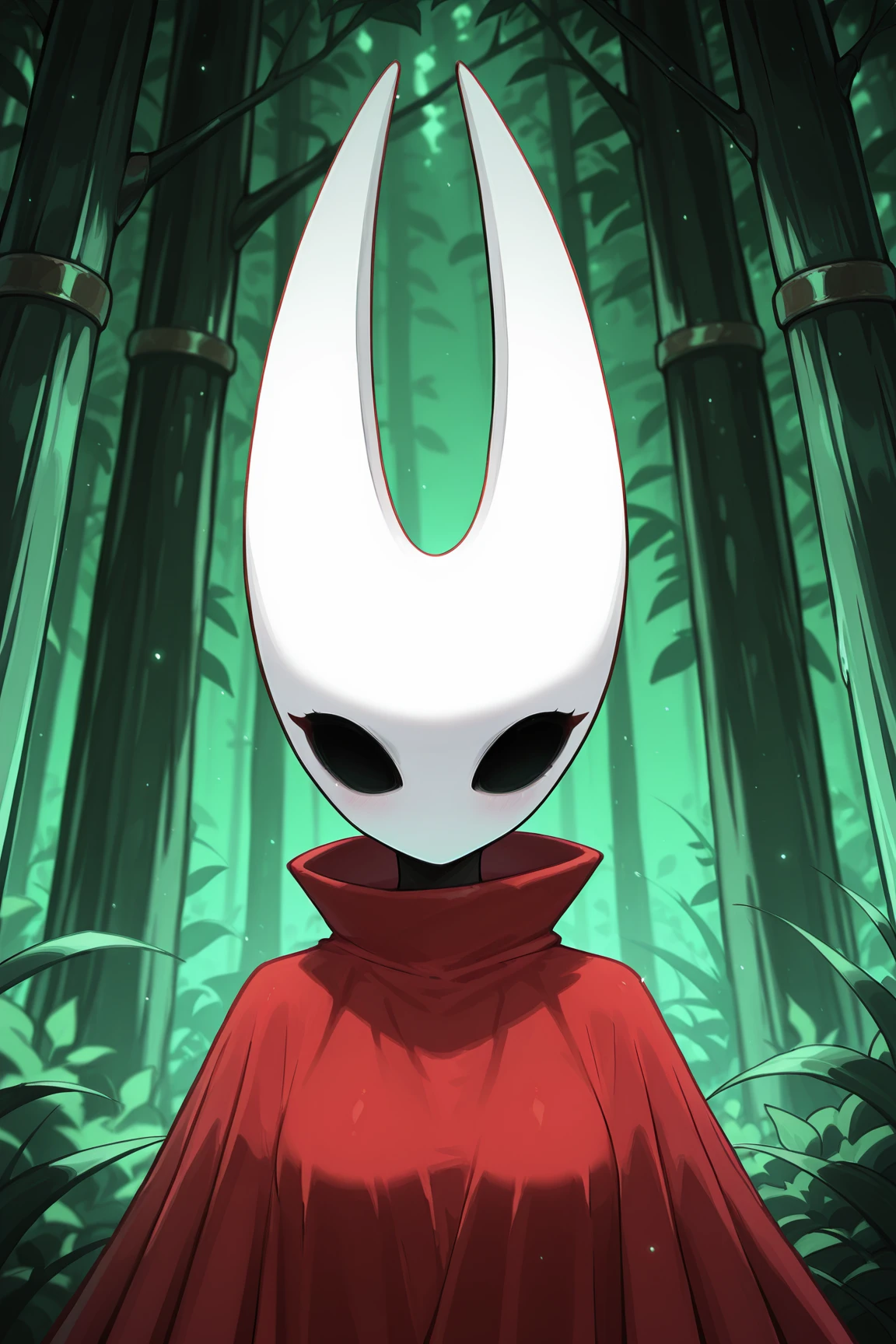HornetHKSILXL, black skin, colored skin, white mask, no mouth, hollow eyes, red cloak
