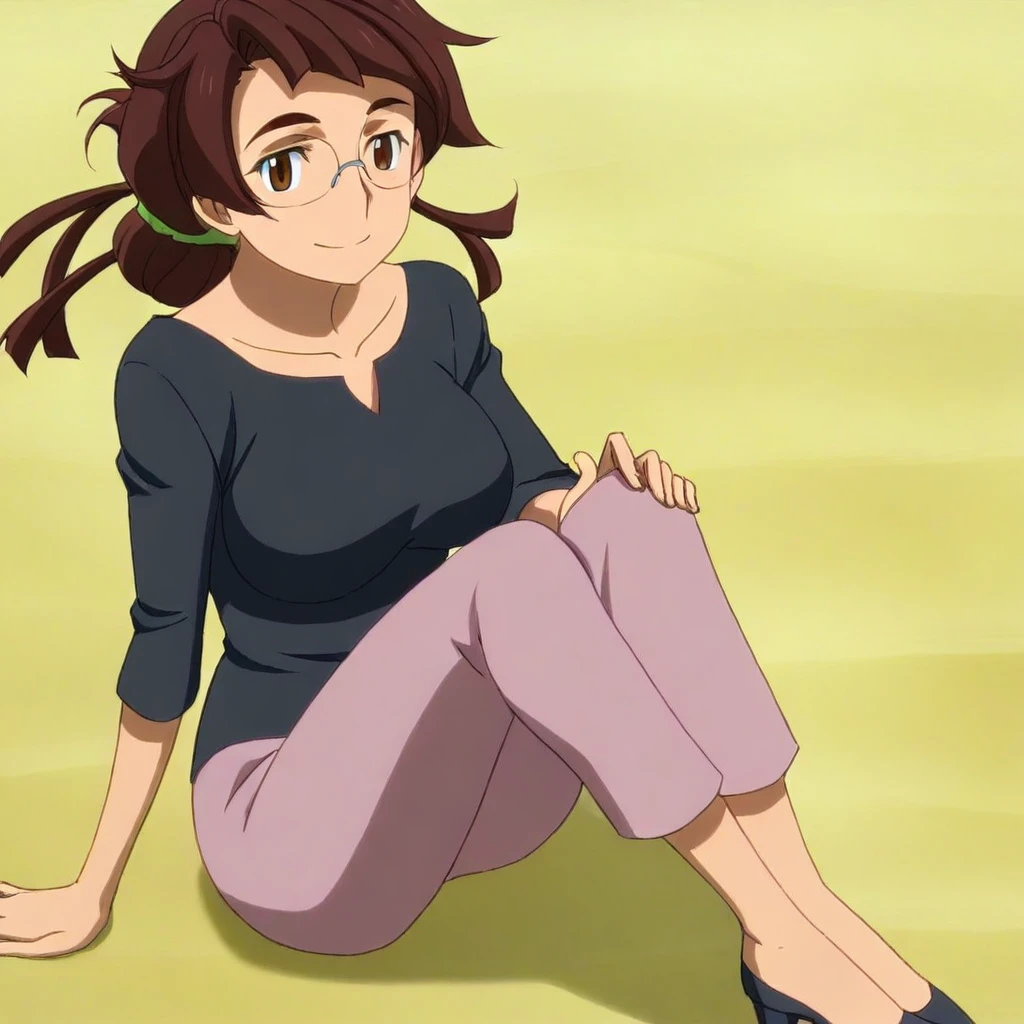 yuriko kuga \(gundam\), dark brown hair, medium hair, folded hair, hairties, brown eyes, eyeglasses, black shirt, strap, pants, heels, , 1girl, solo