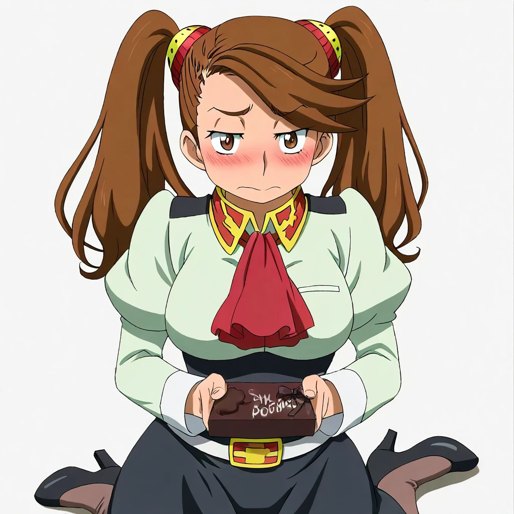 kaoruko sazaki \(gundam\), brown hair, long hair, twintails, hairties, brown eyes, bangs, collar, ascot, school uniform, skirt, belt, pantyhose, heels, , 1girl, solo
