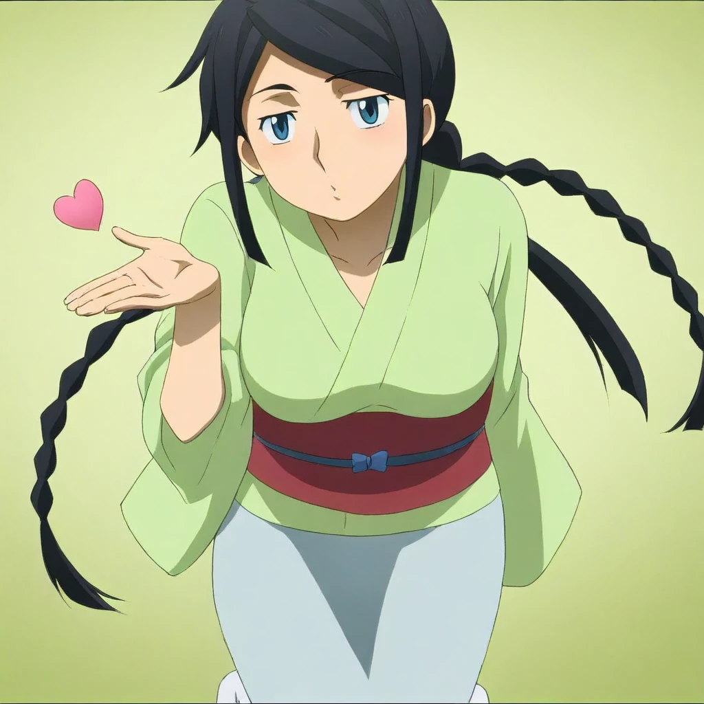 misaki \(gundam\), black hair, long hair, braid, sidelocks, ponytail, blue eyes, japanese clothes, kimono, sash, socks, sandals, , 1girl, solo