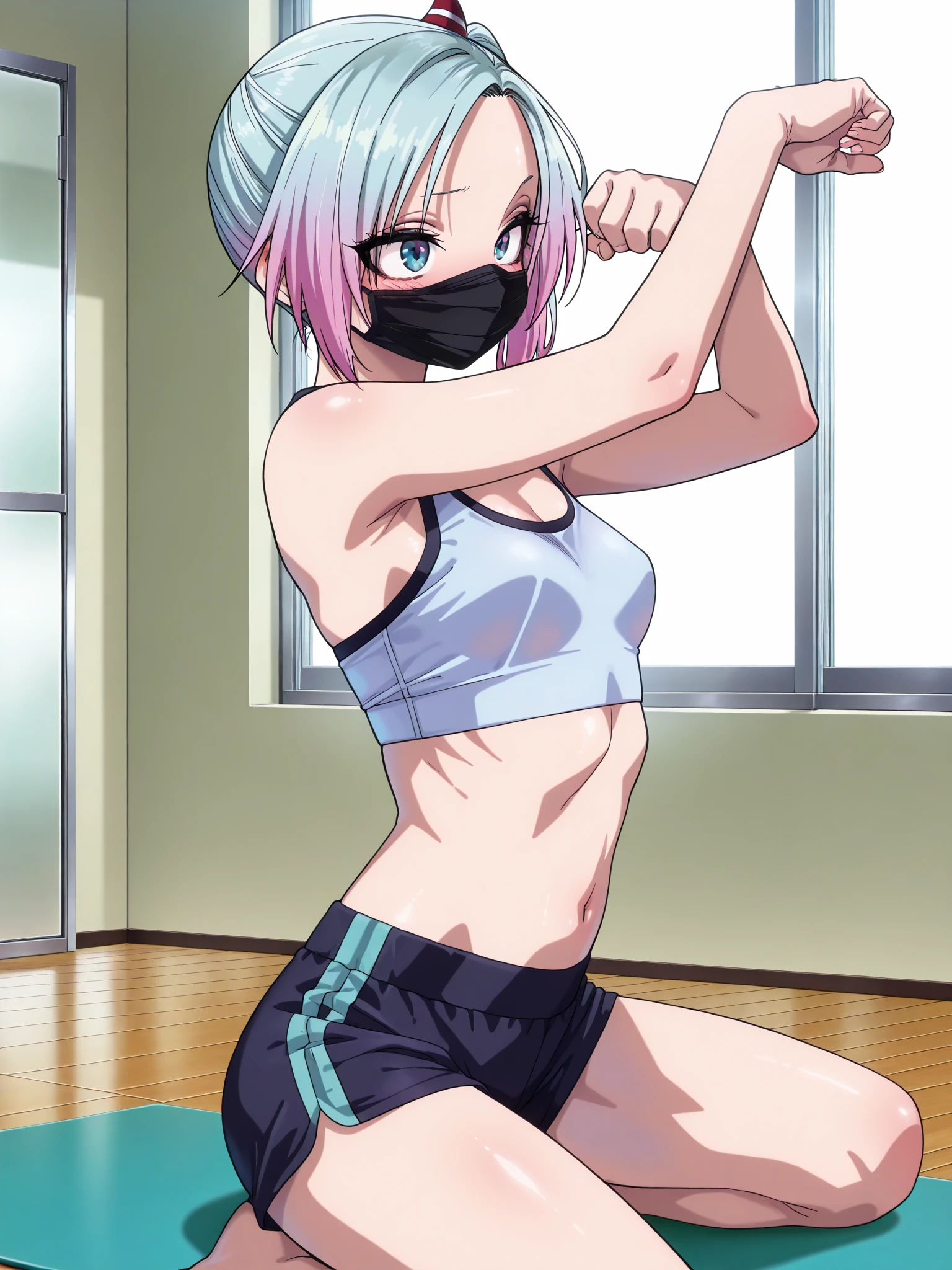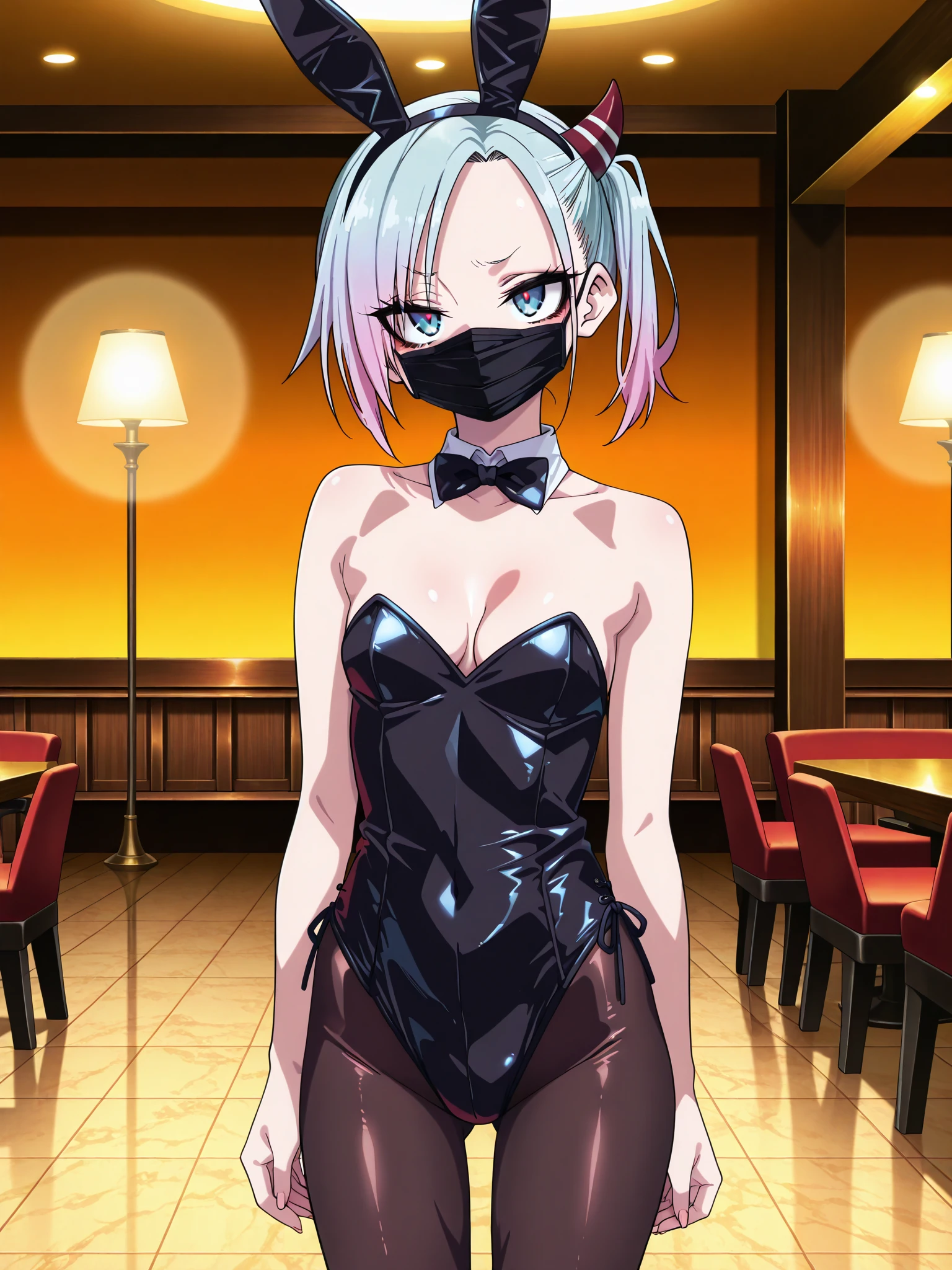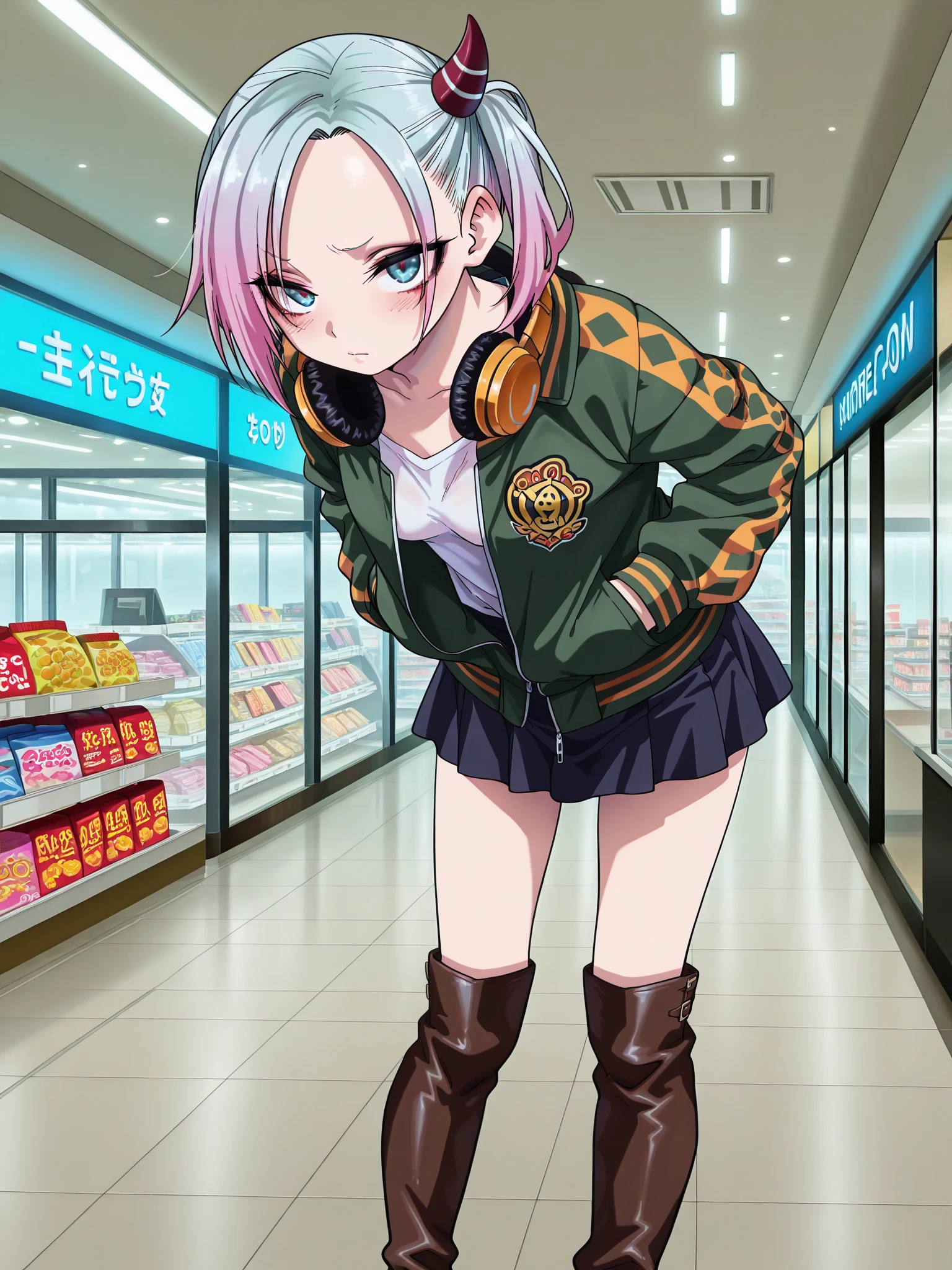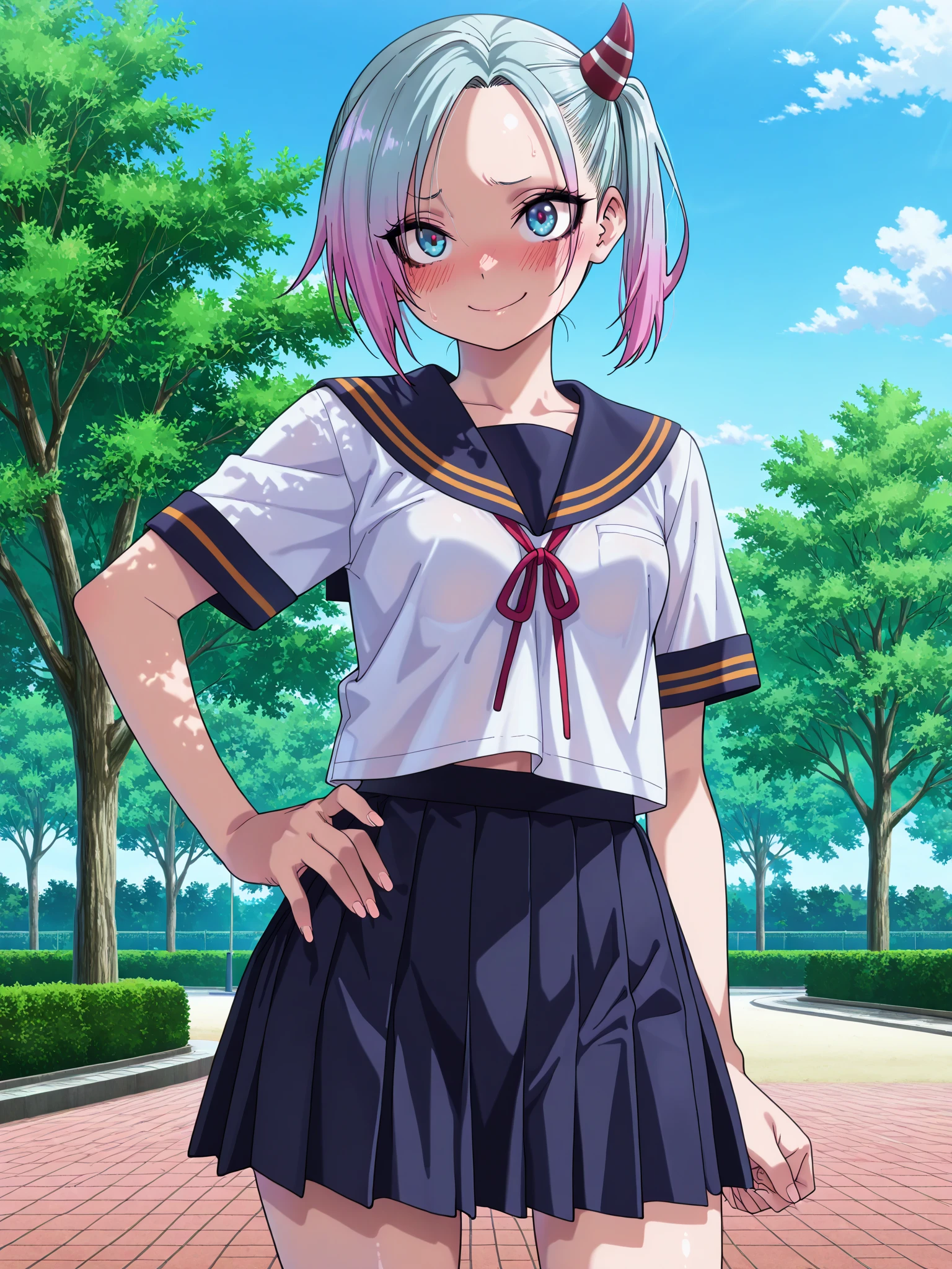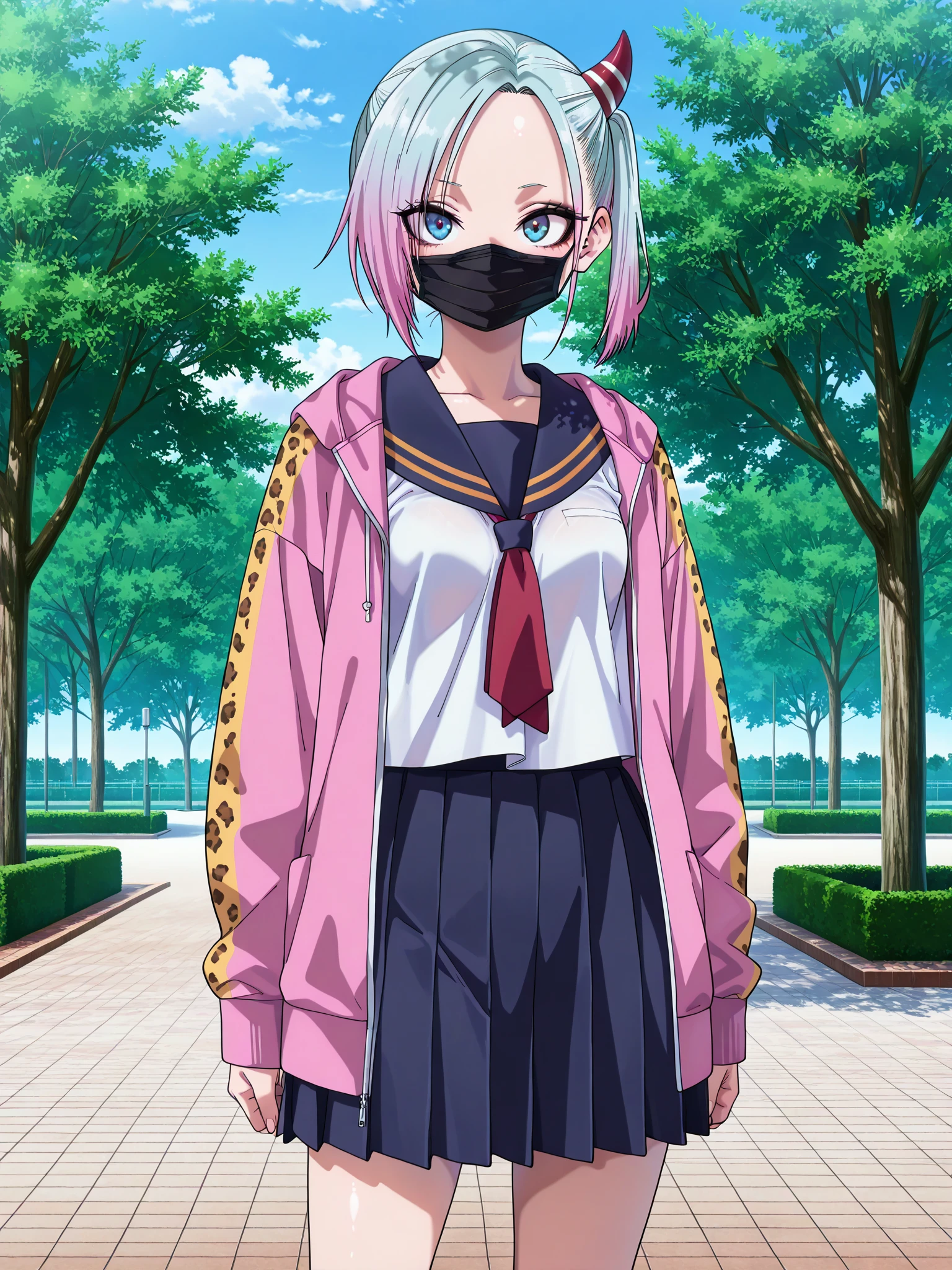 — She stands out with her bold two-tone hair, horn-like accessories, and a rebellious stance that screams “don’t mess with me.” Her layered look—skirt, hoodie, and mask—gives off the vibe of a tough-yet-tsundere youth who’d rather guard her heart than show it. She radiates that classic delinquent energy, but her sharp fangs and flushed cheeks hint at a softer, unexpectedly vulnerable side. A perfect blend of tough and tender, she’s impossible not to notice or forget.