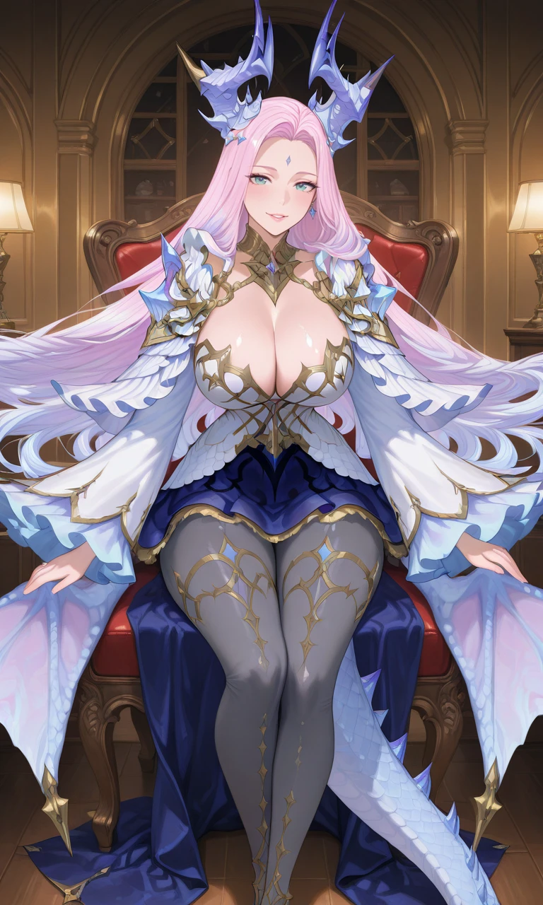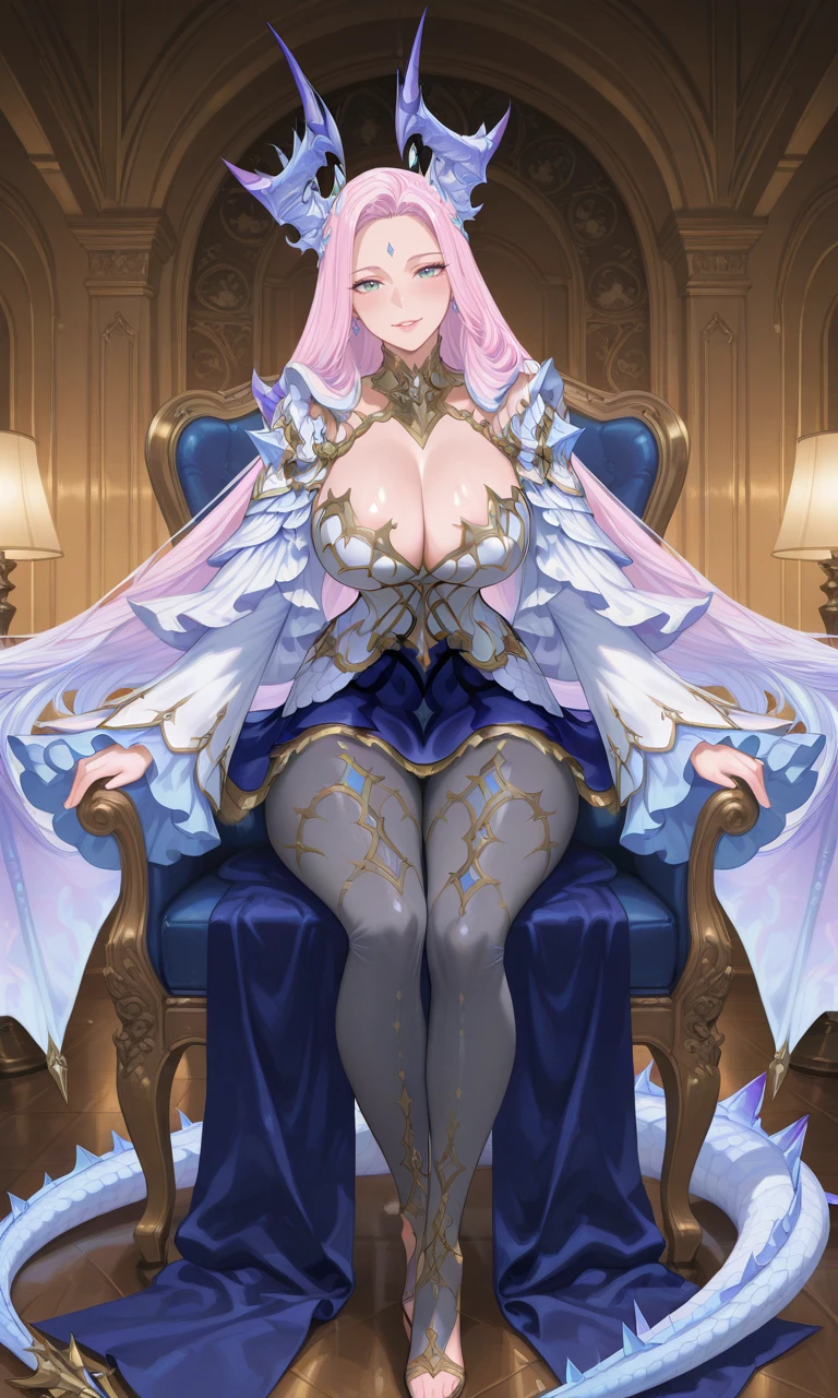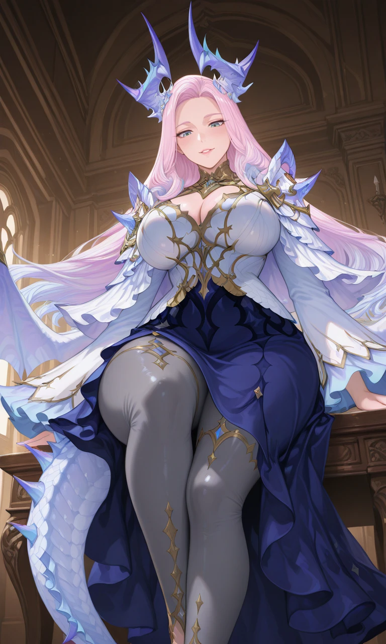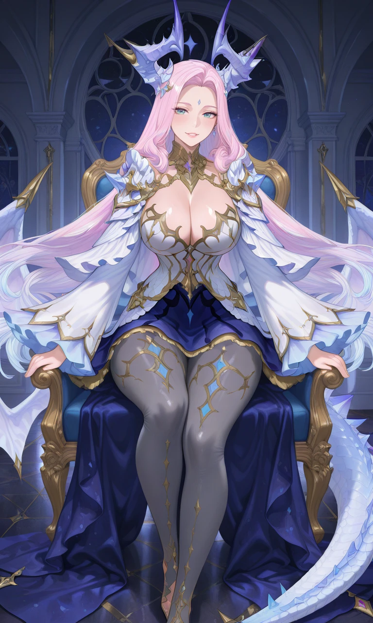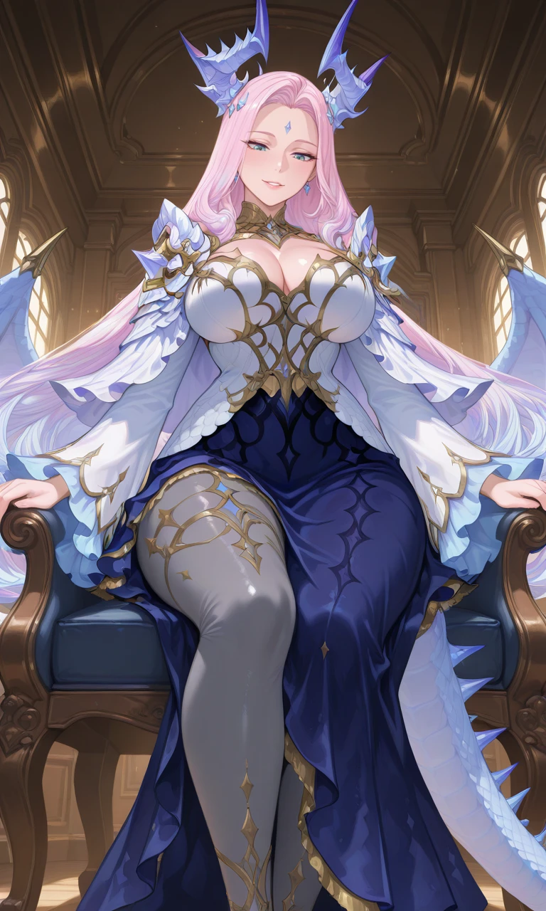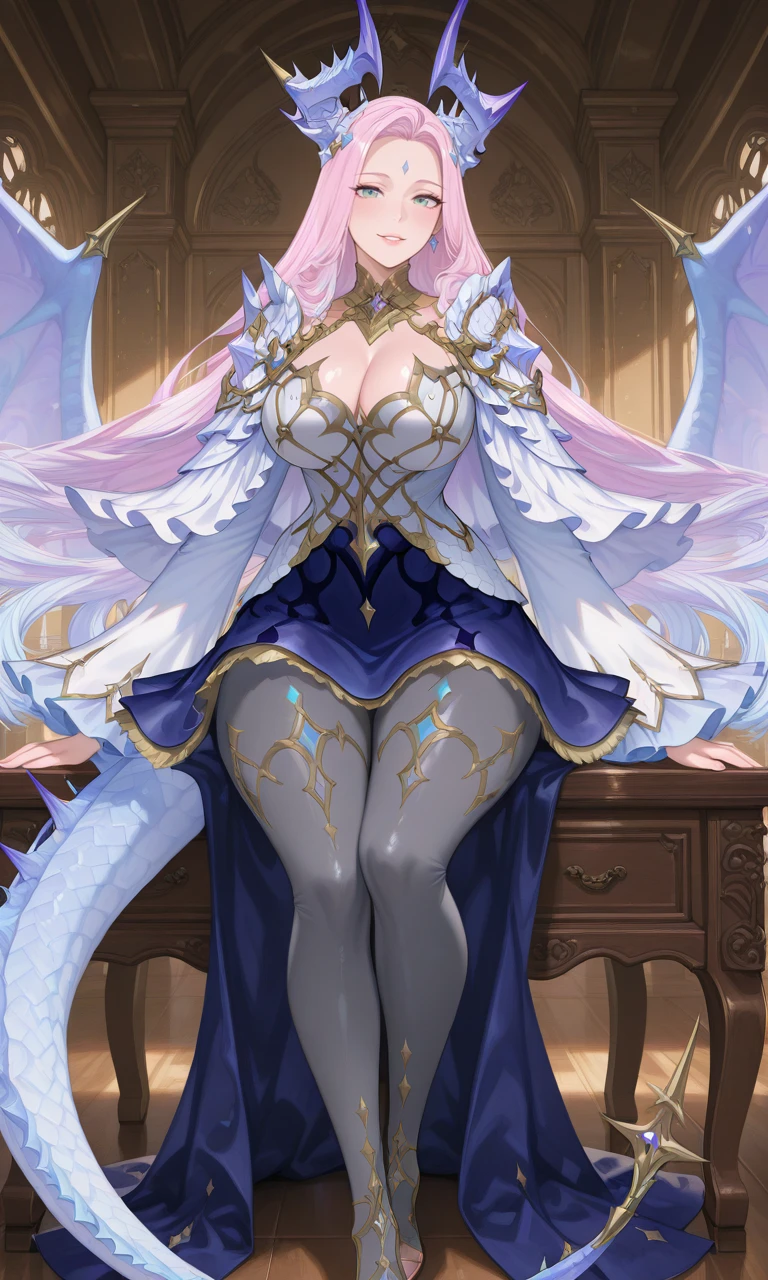 Melia, Emerald eyes, long hair, pink hair, gradient hair, dragon horns, Jewelry accessories, light blue horns, white dress, dark blue skirt, very wide sleeves, grey leggings, gold decorations, dragon wings, dragon tail,