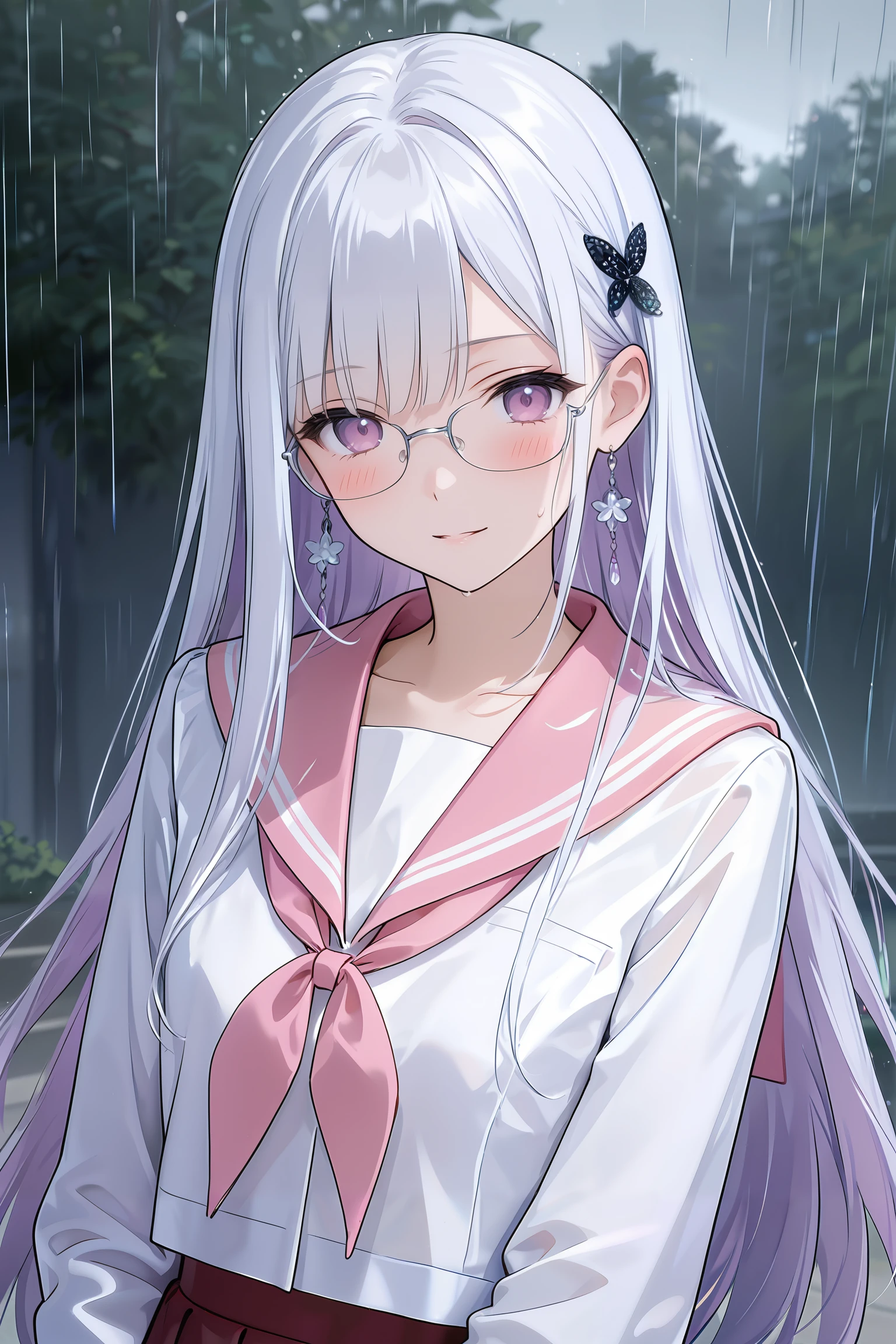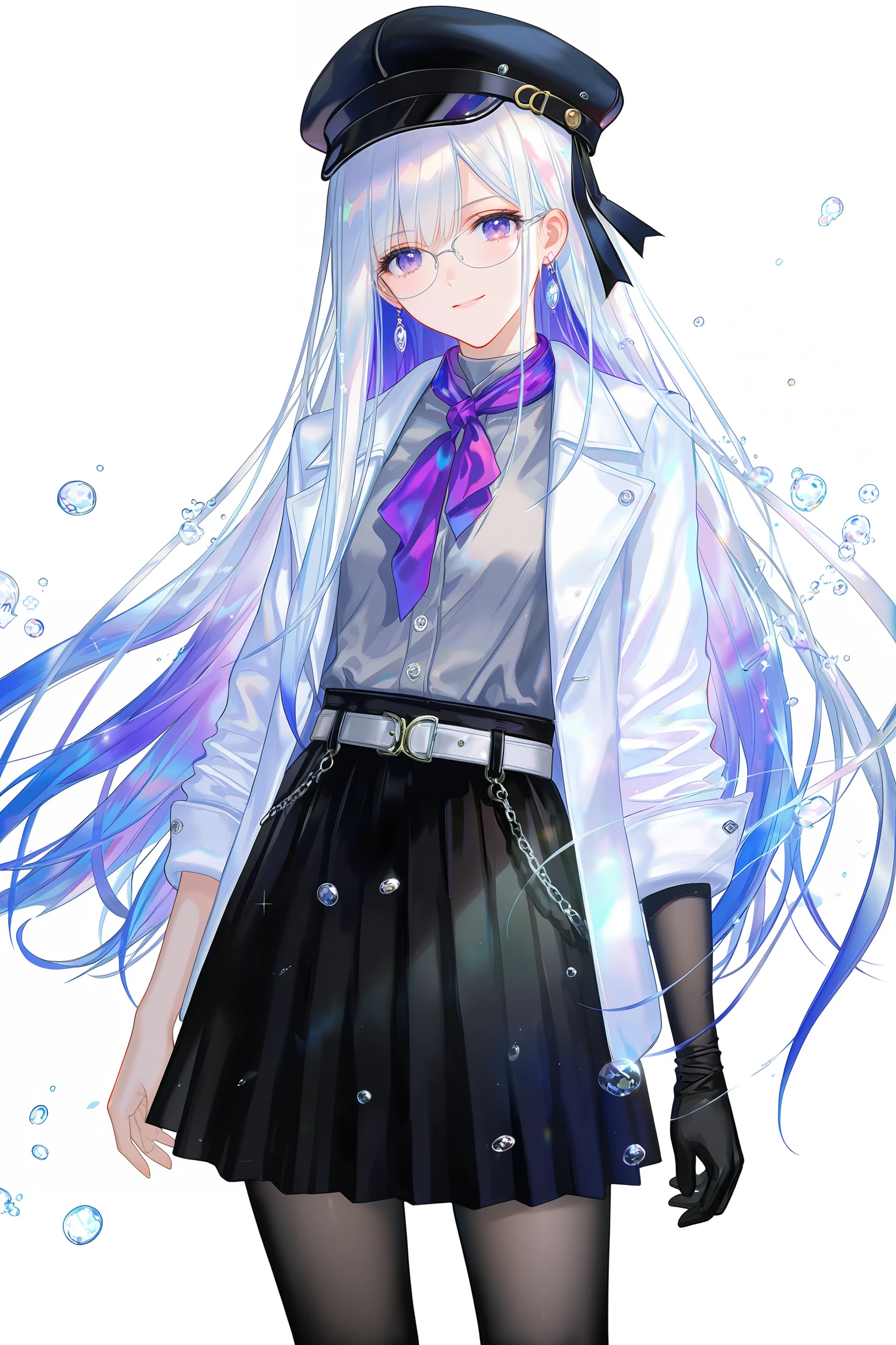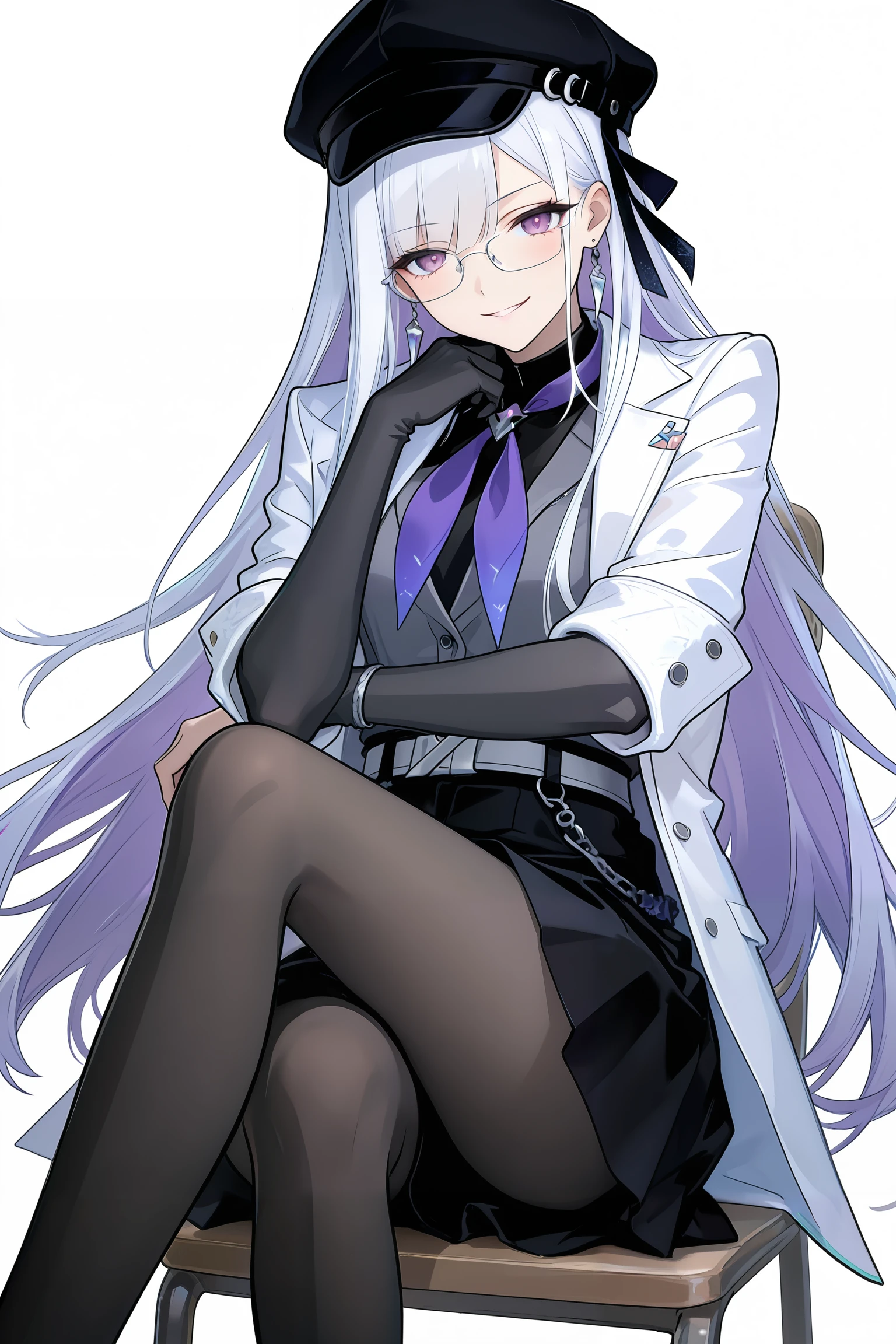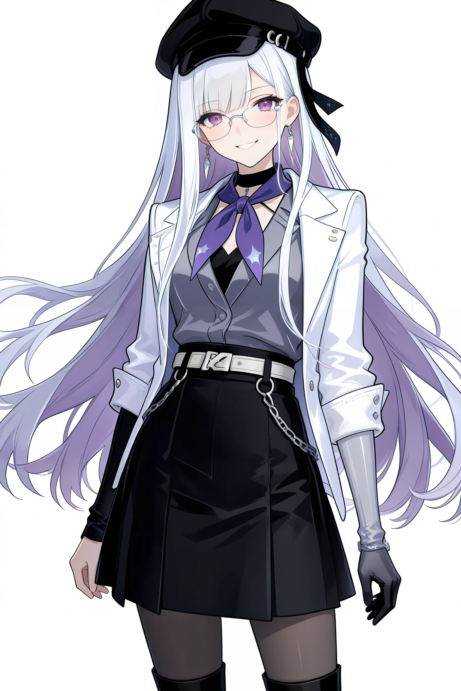 nihilux,purple neckerchief, hat, skirt, white hair, Purple inner hair,smile, pantyhose, black skirt, shirt, black headwear, jacket, belt, jewelry, grey shirt, white jacket, black pantyhose, earrings, breasts, thighhighs, long sleeves, pleated skirt,(grey single_elbow_glove),(sover-rim_eyewear),single_elbow_glove,single bare hand,boot