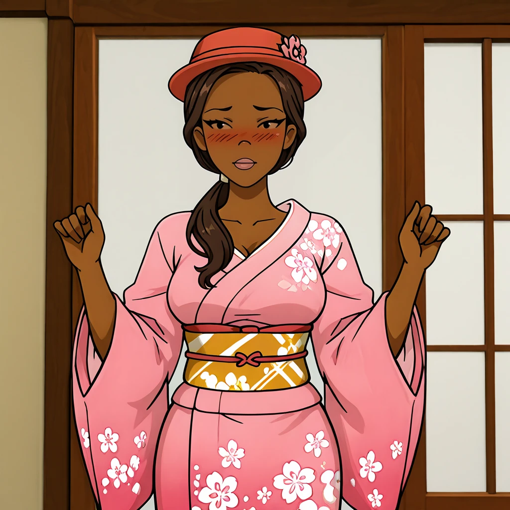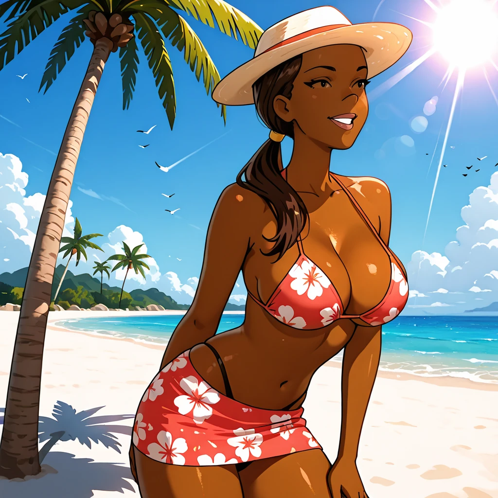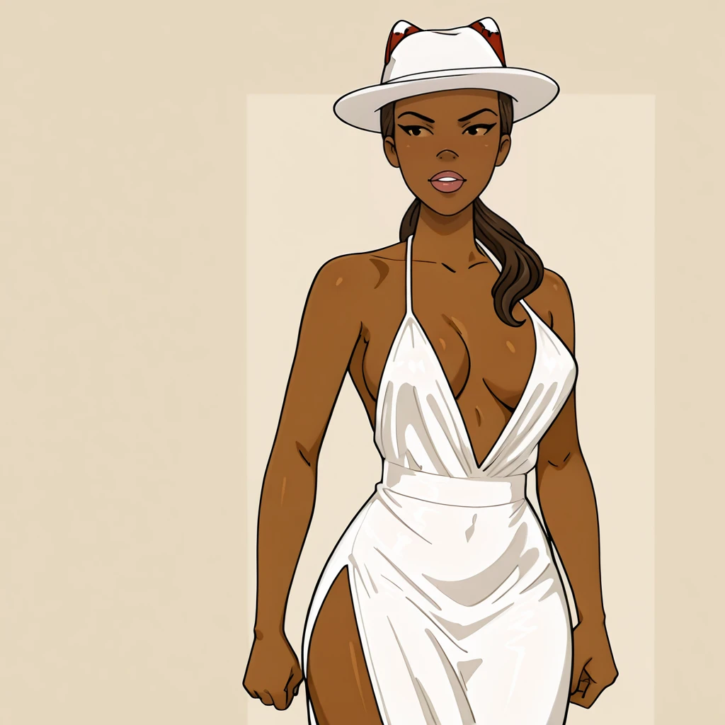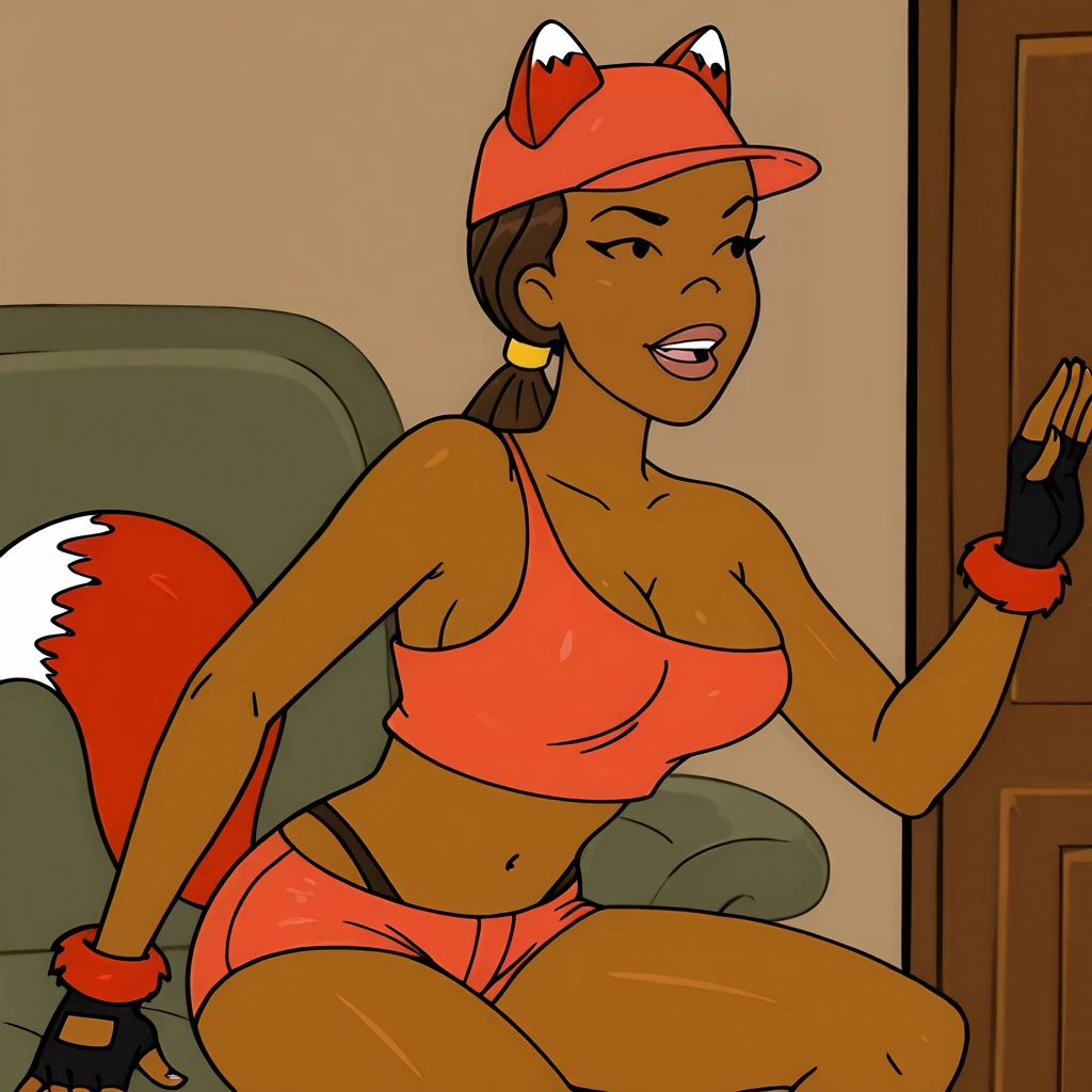 Trigger : FoxxyDrawnTogether, 1girl, dark-skinned female, medium breasts, dark skin, fox tail, animal ears, crop top, shorts, fingerless gloves, cleavage, hat, ponytail, navel, midriff, panties, underwear, tank top, brown hair, long hair