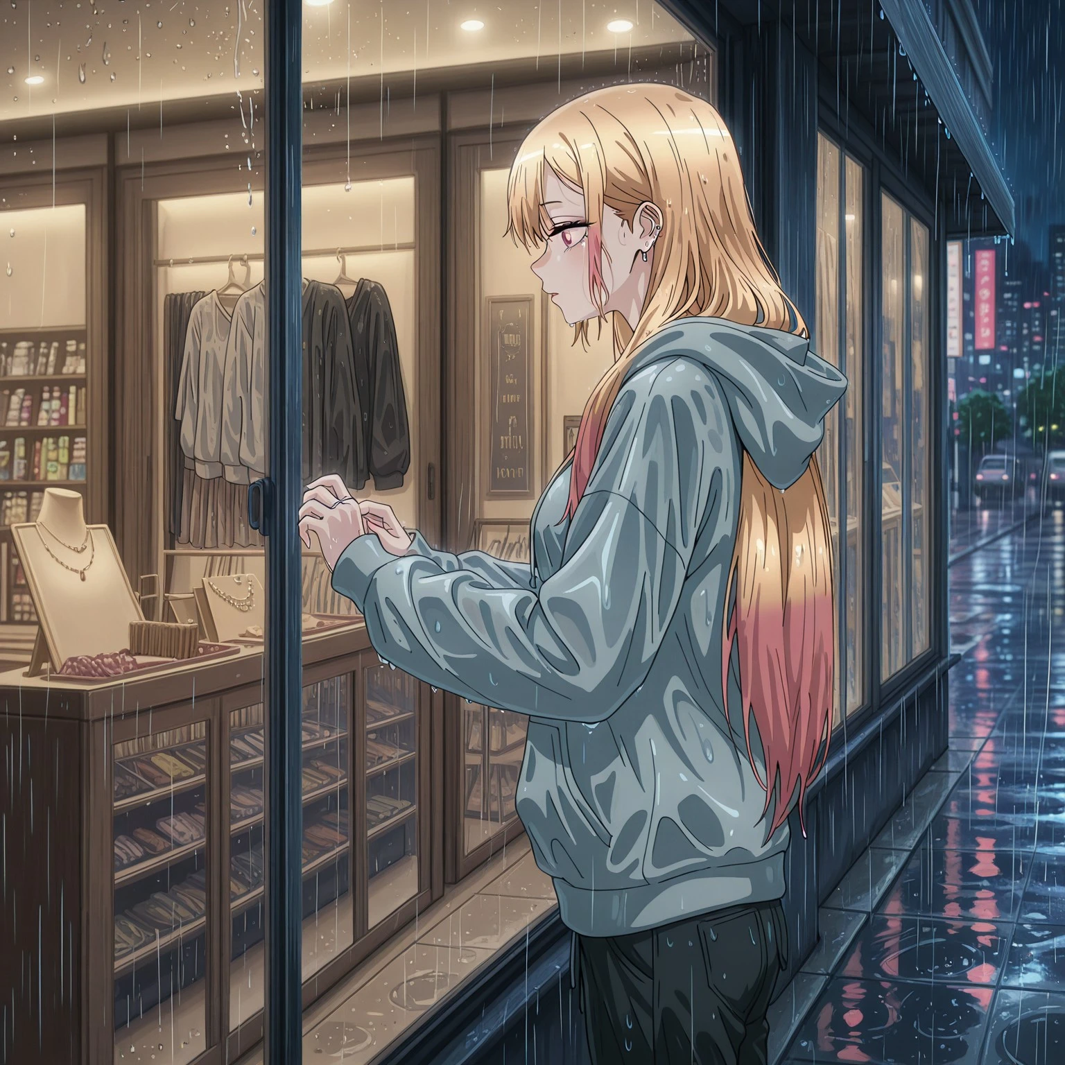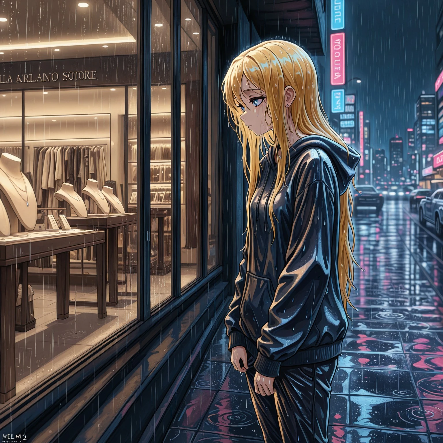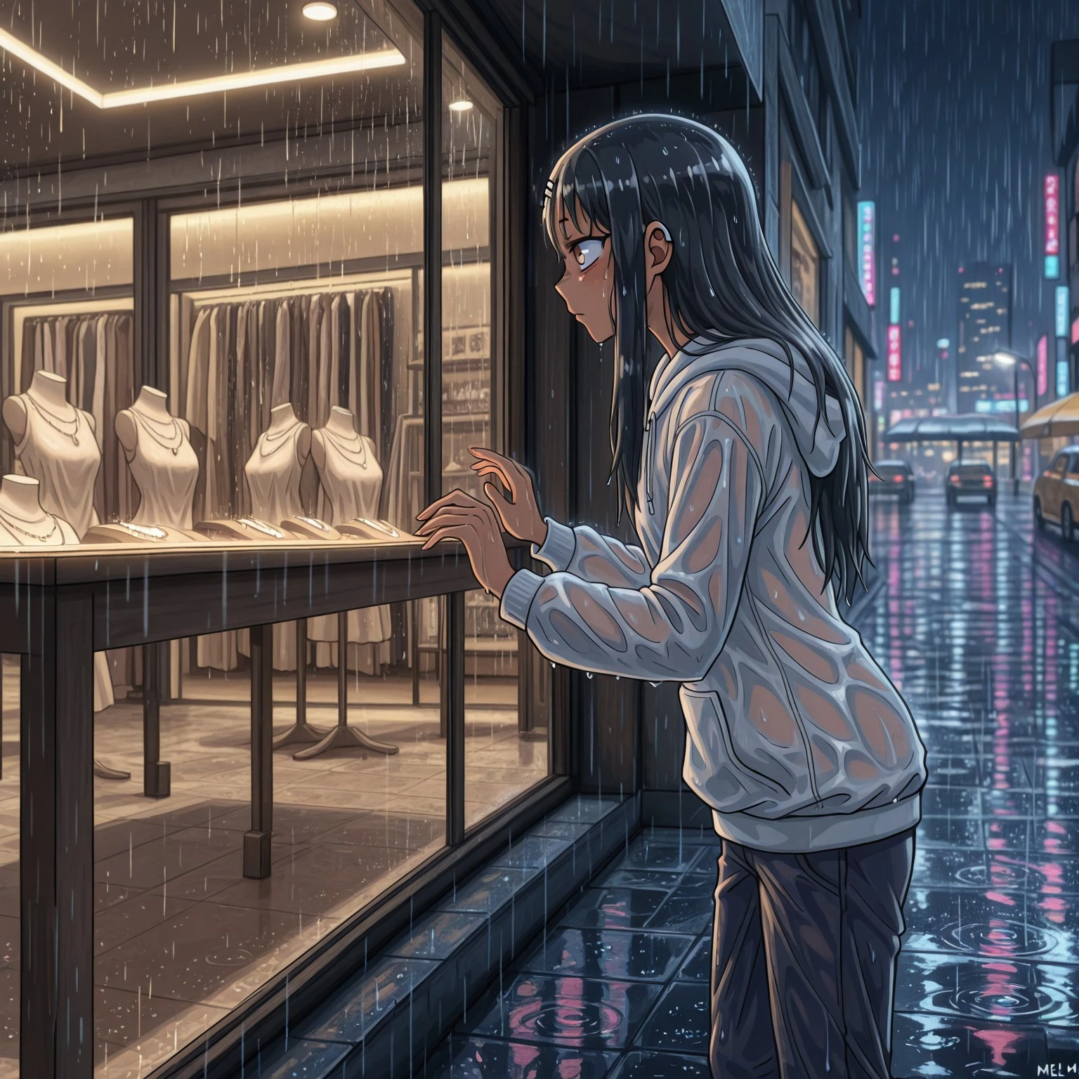 melmb2, rain, night, cityscape, shop window, jewelry store, outdoors,
