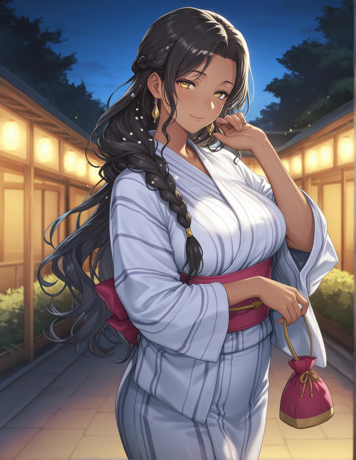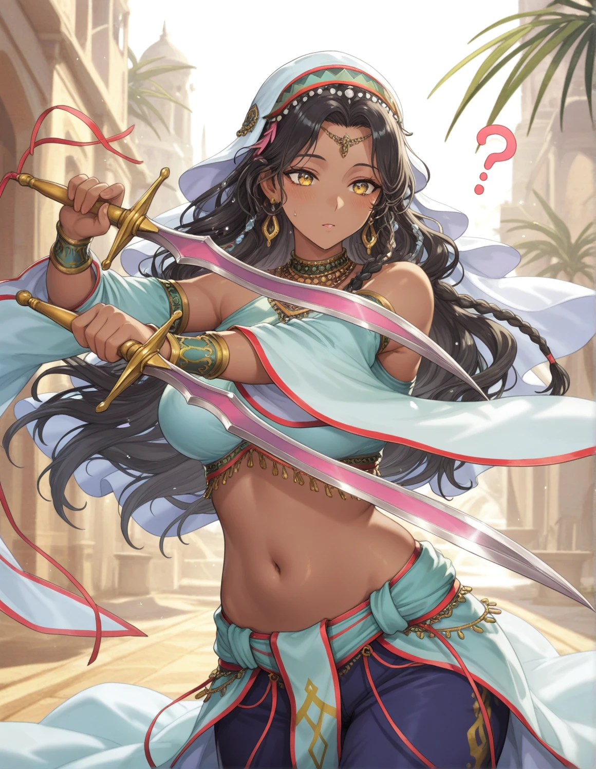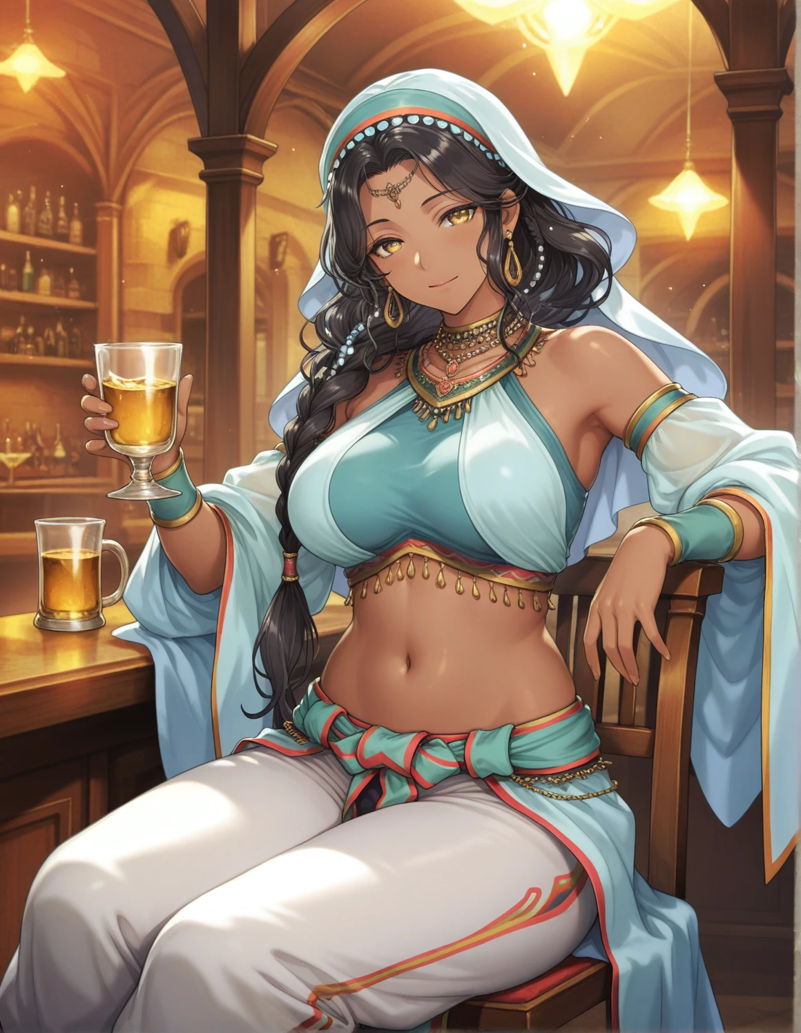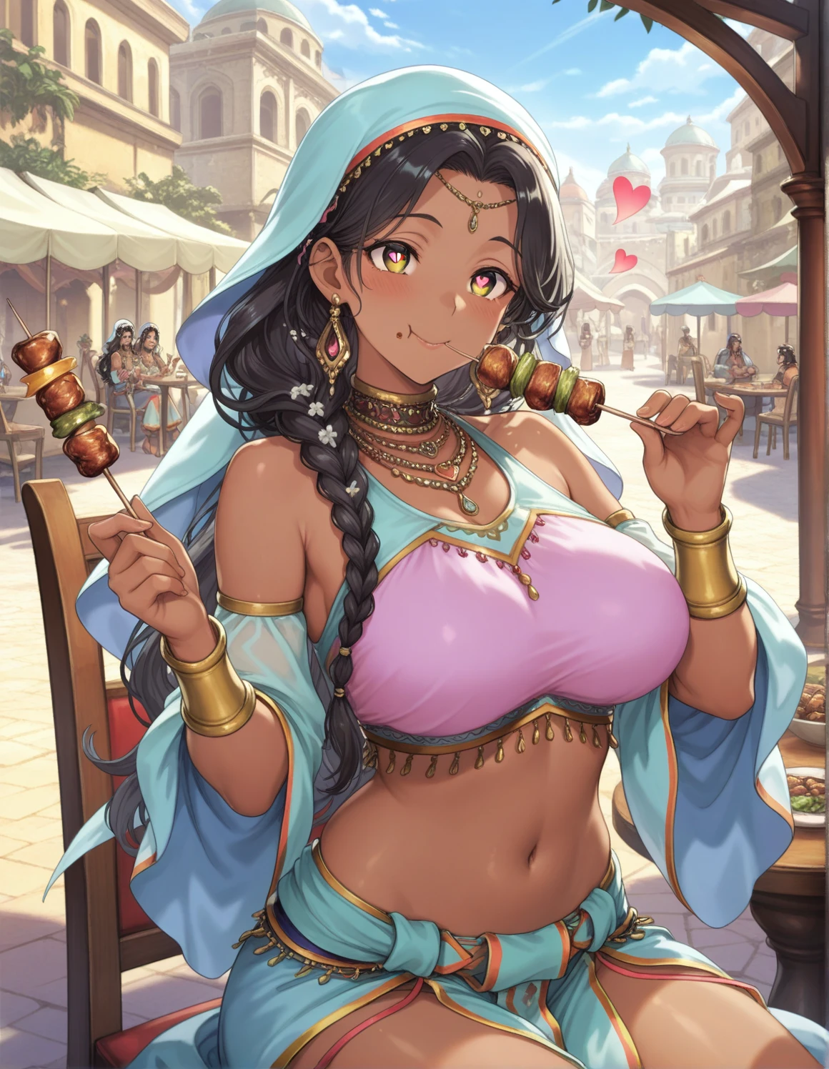 1girl, rsmadl, mature female, yellow eyes, black hair, long hair, braid, dark-skinned female, earrings, necklace, jewelry, arabian clothes, bare shoulders, detached sleeves, midriff, navel, pants, boots,