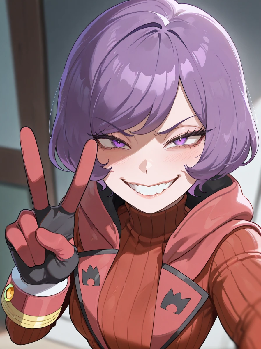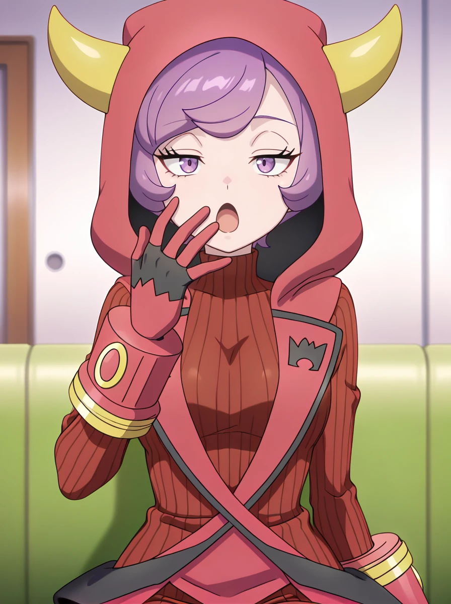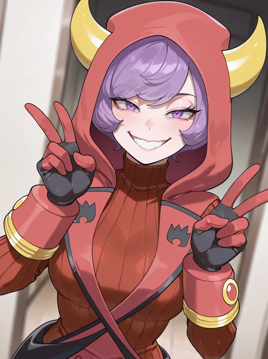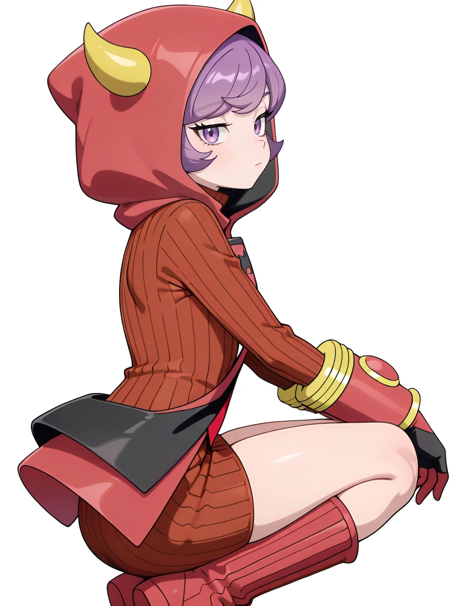 Prompts: horns, 1girl, purple hair, fake horns, hood, purple eyes, solo, short hair, gloves, sweater, ribbed sweater, boots, bangs, horned headwear, eyelashes