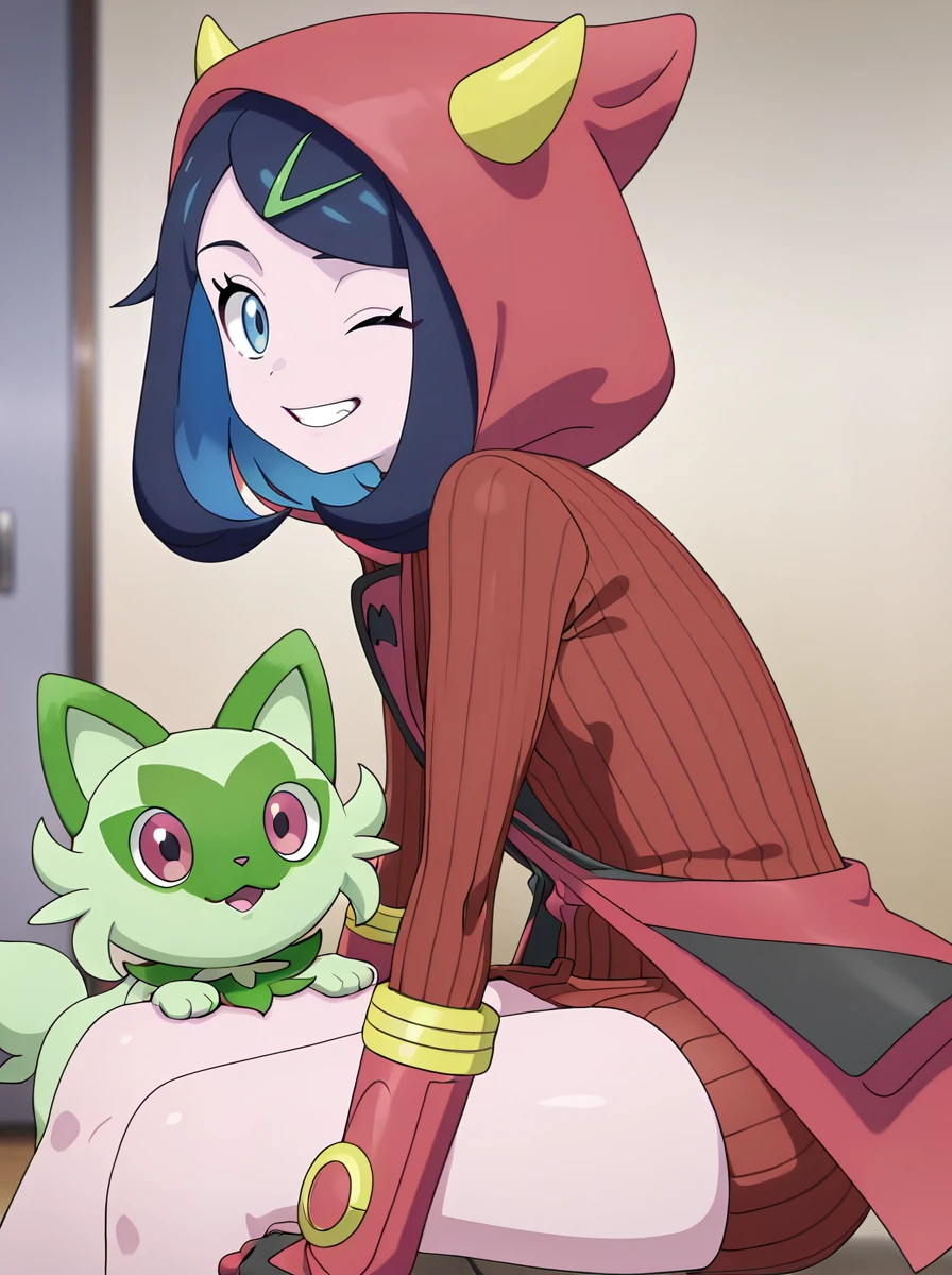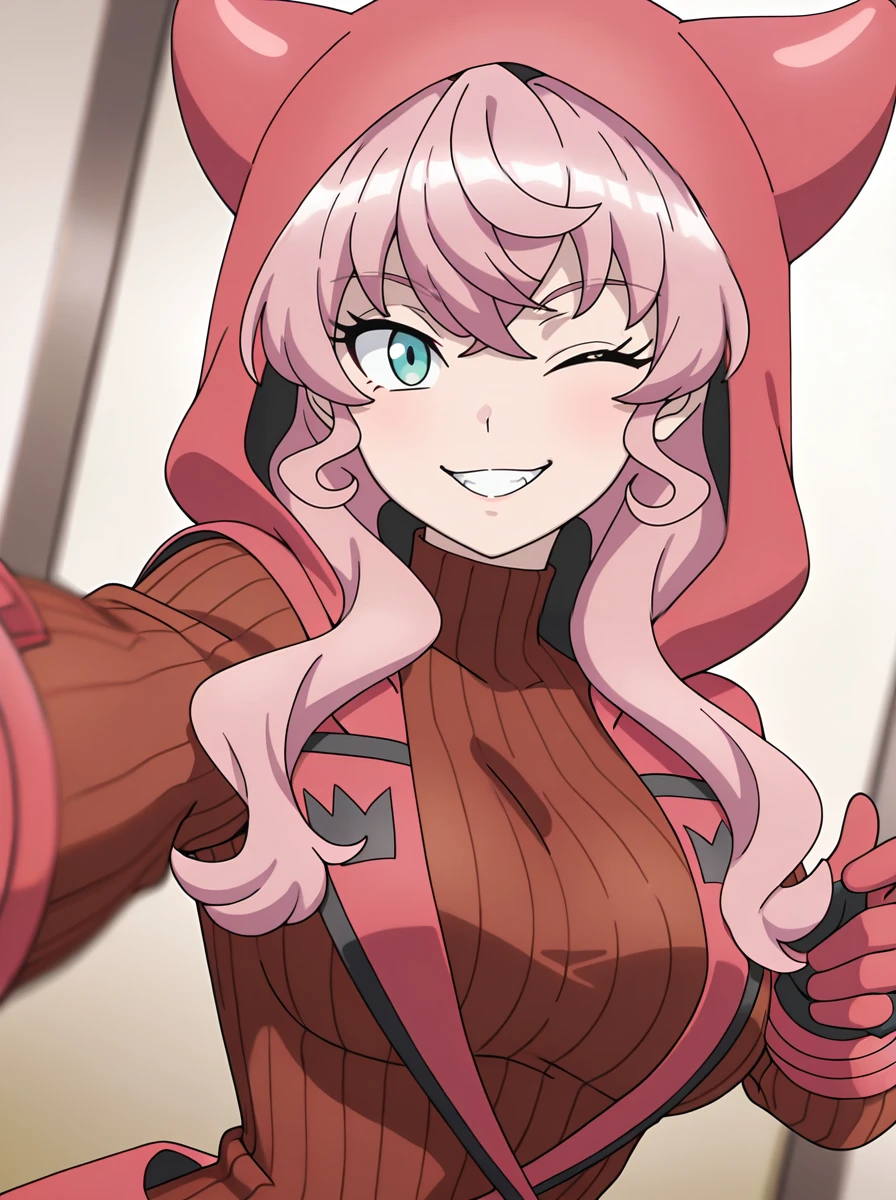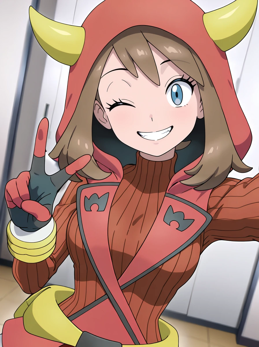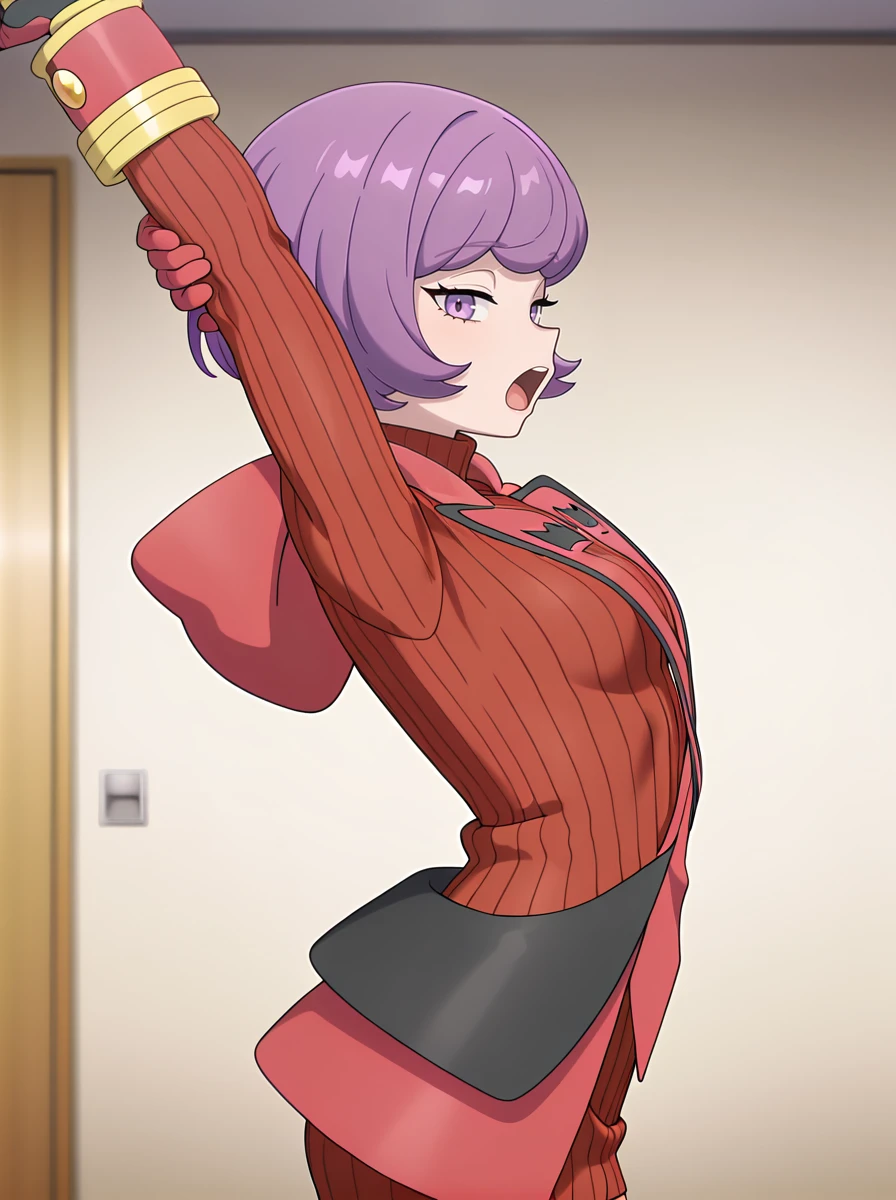 Prompts: horns, 1girl, purple hair, fake horns, hood, purple eyes, solo, short hair, gloves, sweater, ribbed sweater, boots, bangs, horned headwear, eyelashes