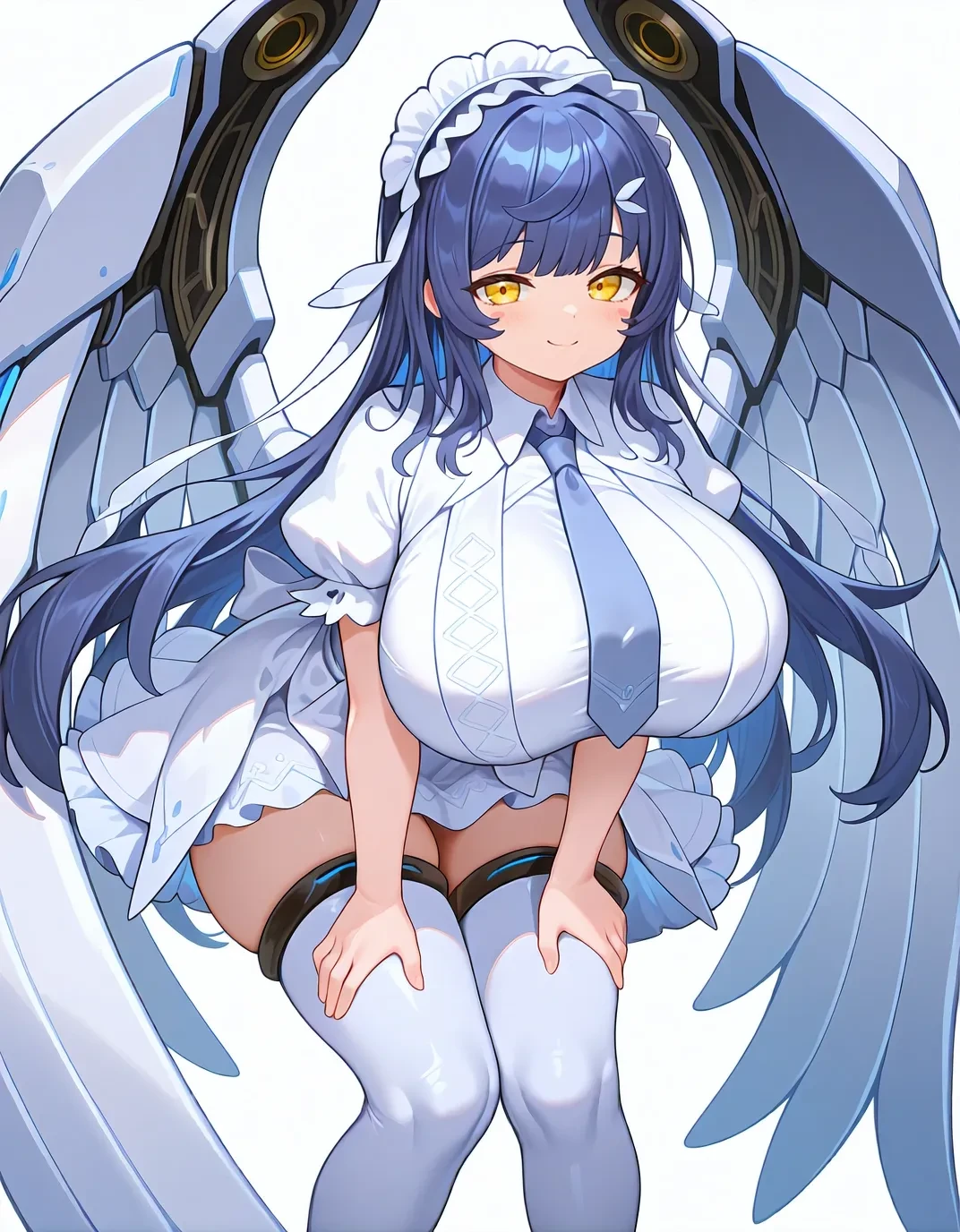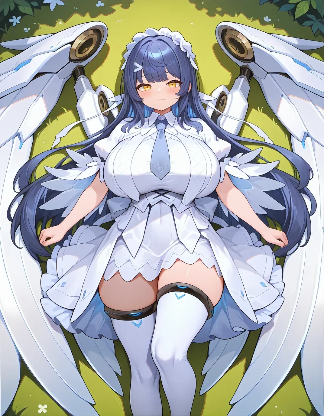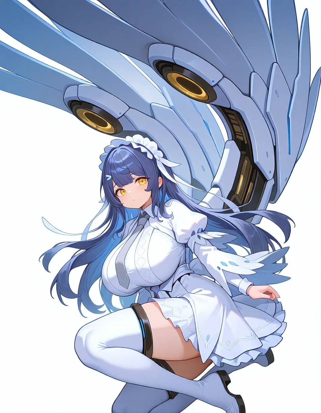 sn0wdef,yellow eyes,white dress,thigh boots,blue hair,long hair,necktie,white thighhighs,huge breasts,maid headdress,short sleeves,white footwear,hair ornament,