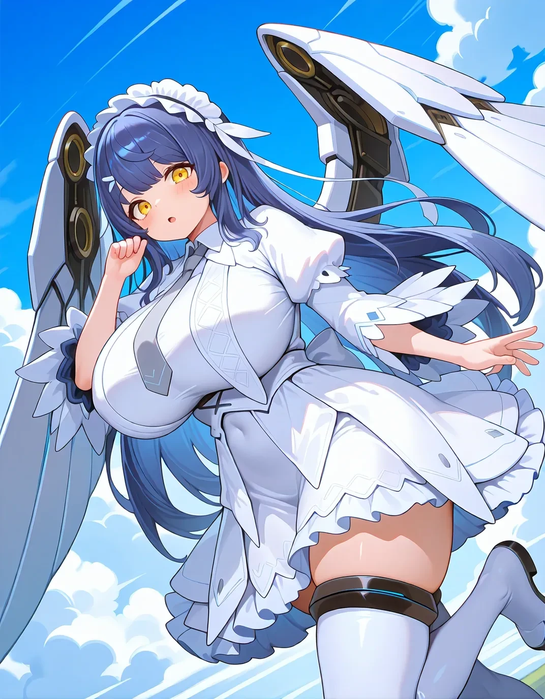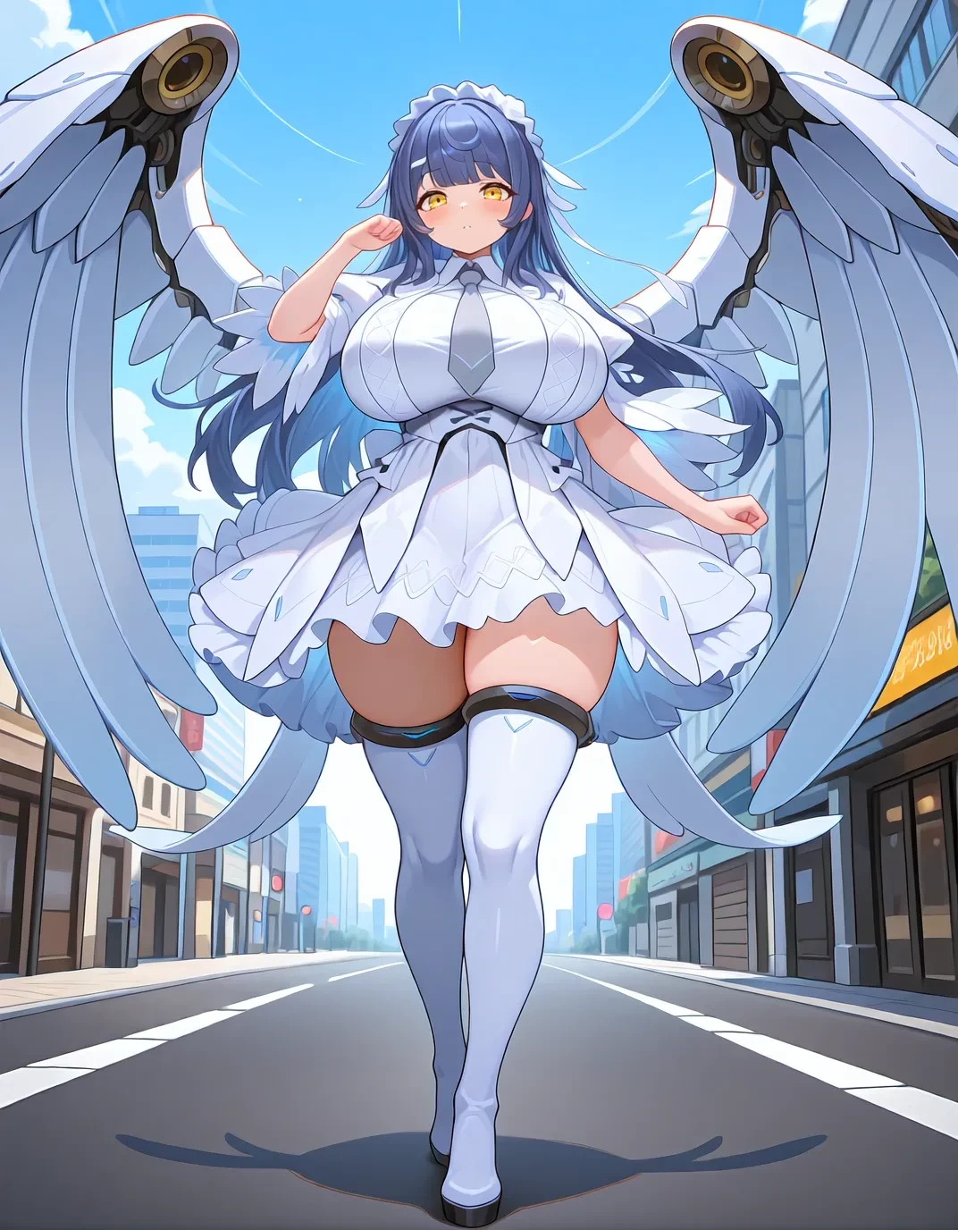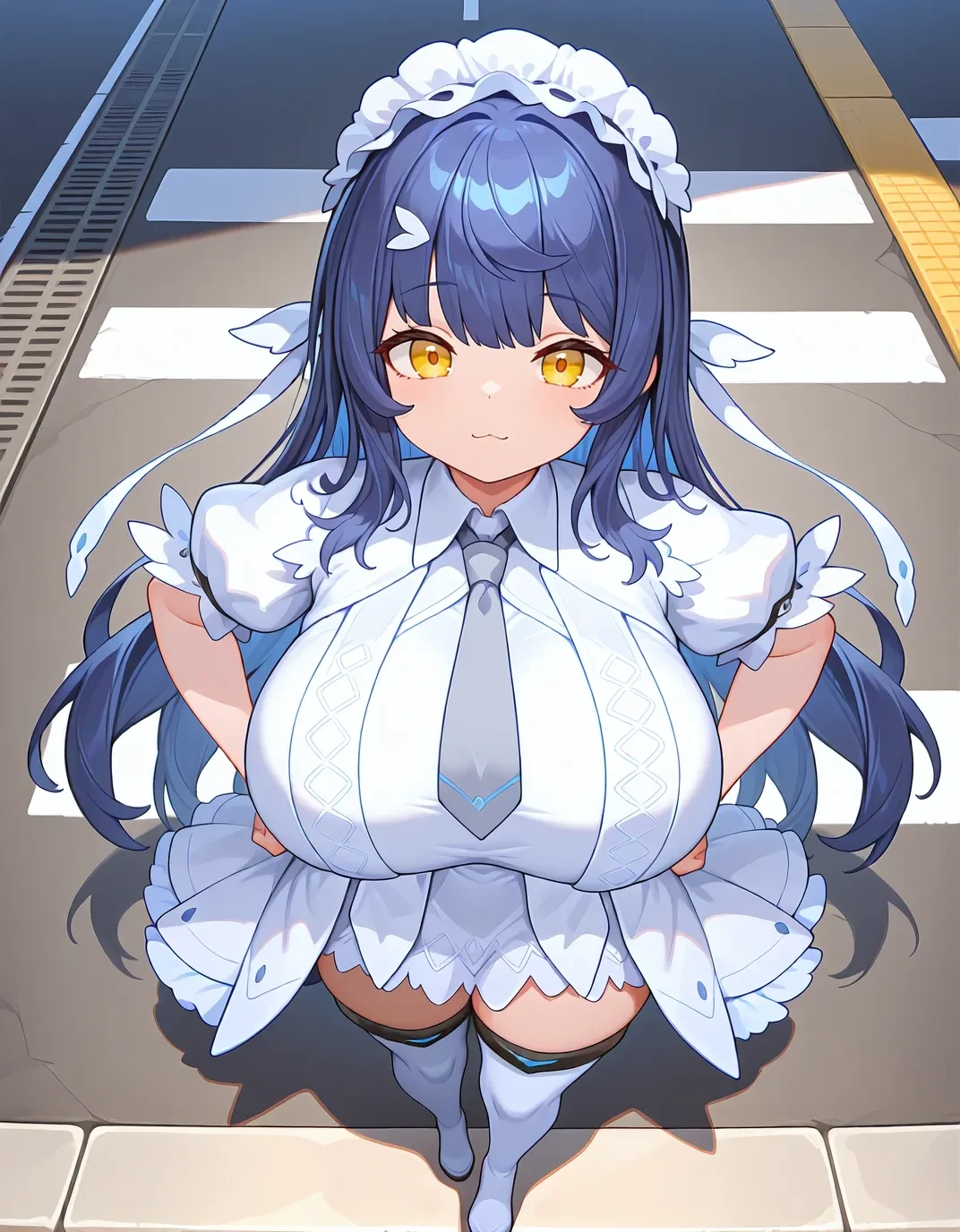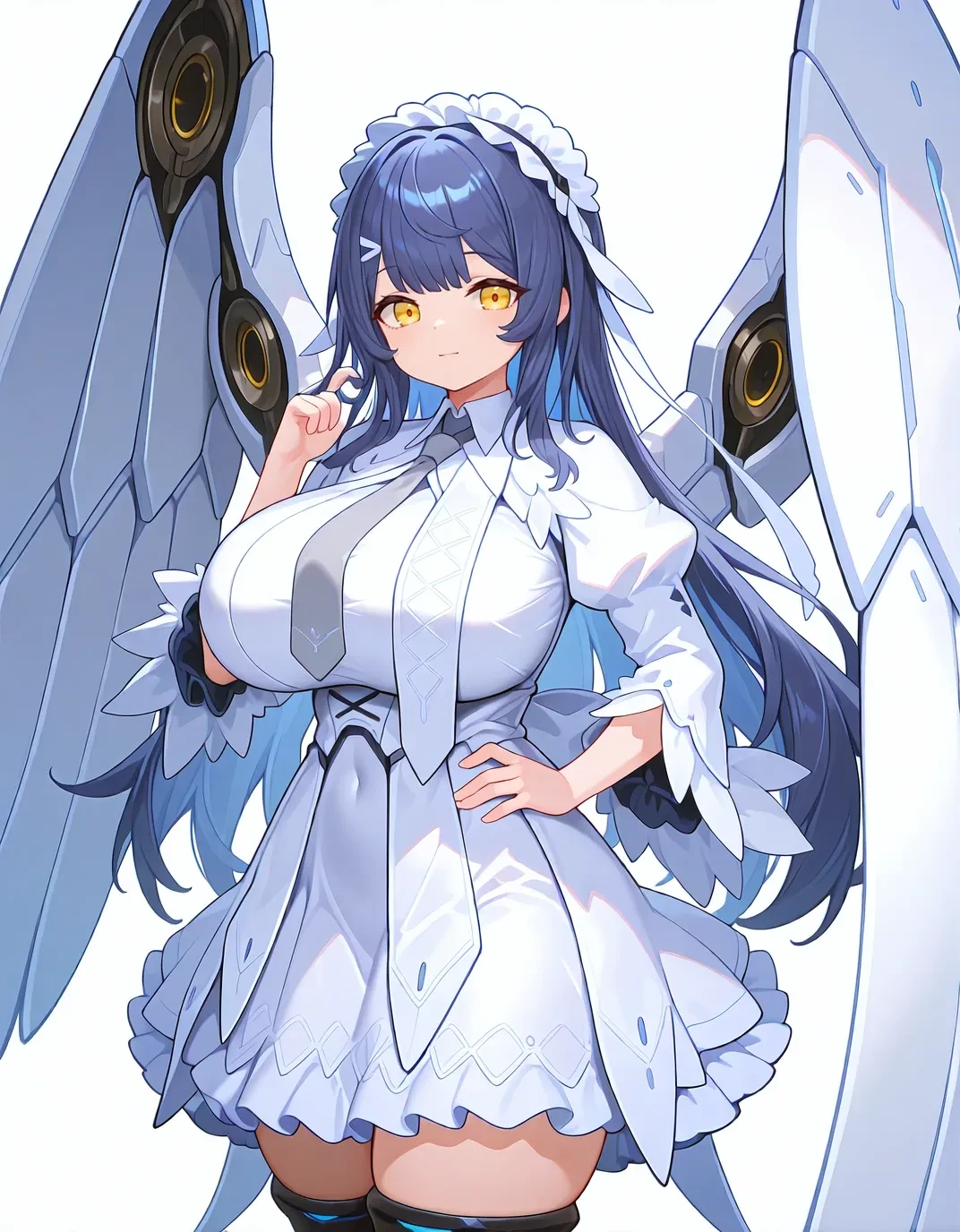 sn0wdef,yellow eyes,white dress,thigh boots,blue hair,long hair,necktie,white thighhighs,huge breasts,maid headdress,short sleeves,white footwear,hair ornament,