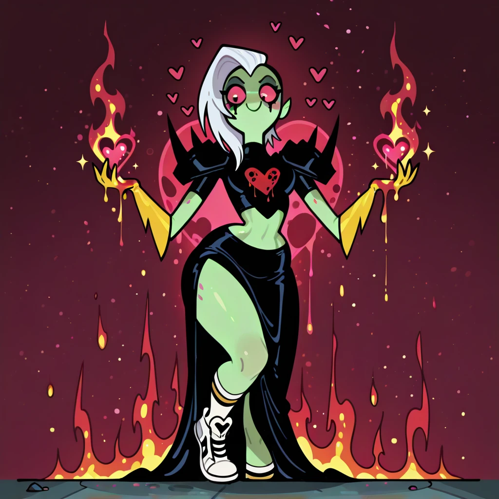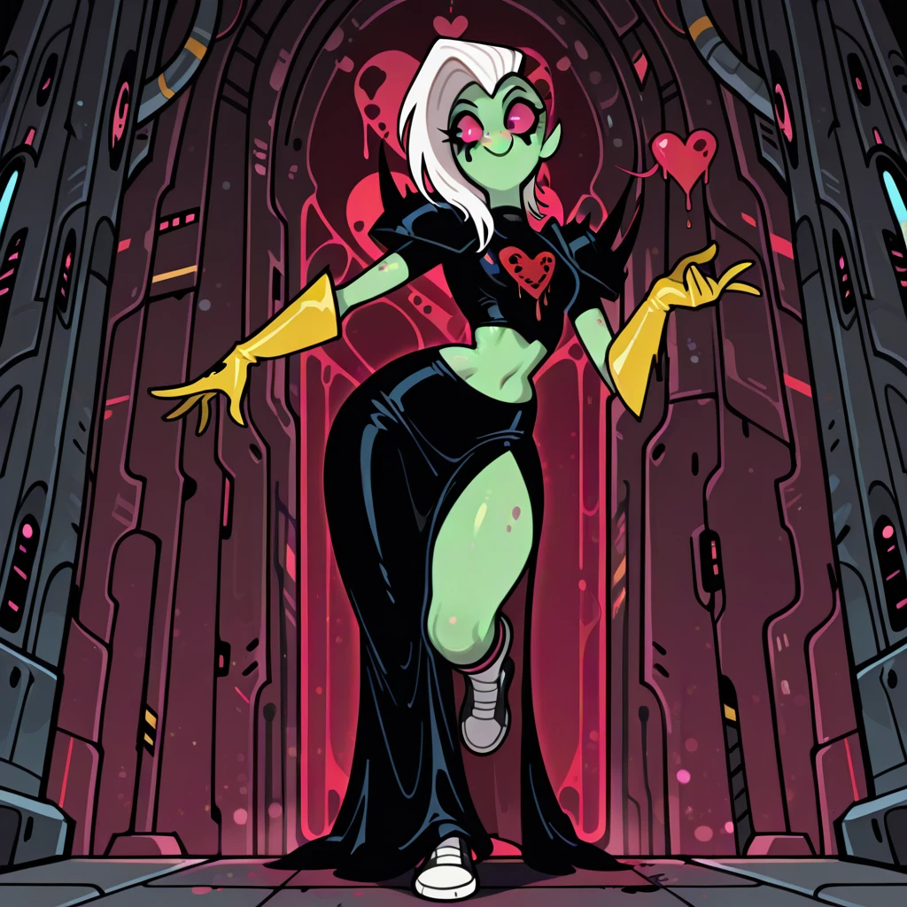 alien female, solo, curvy, thin waist, green skin, dark red freckles, black eyeliner, black mascara, red sclera, black eyes, white hair, side swept hair, curled bang, no nose, noseless, black armor with heart symbol, long yellow gloves, midriff, very long black slit skirt, white socks, white sneakers with black accents,