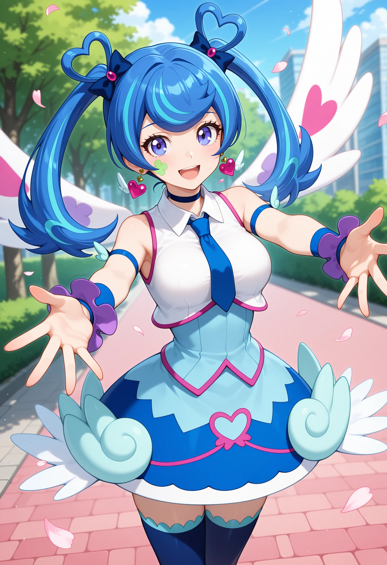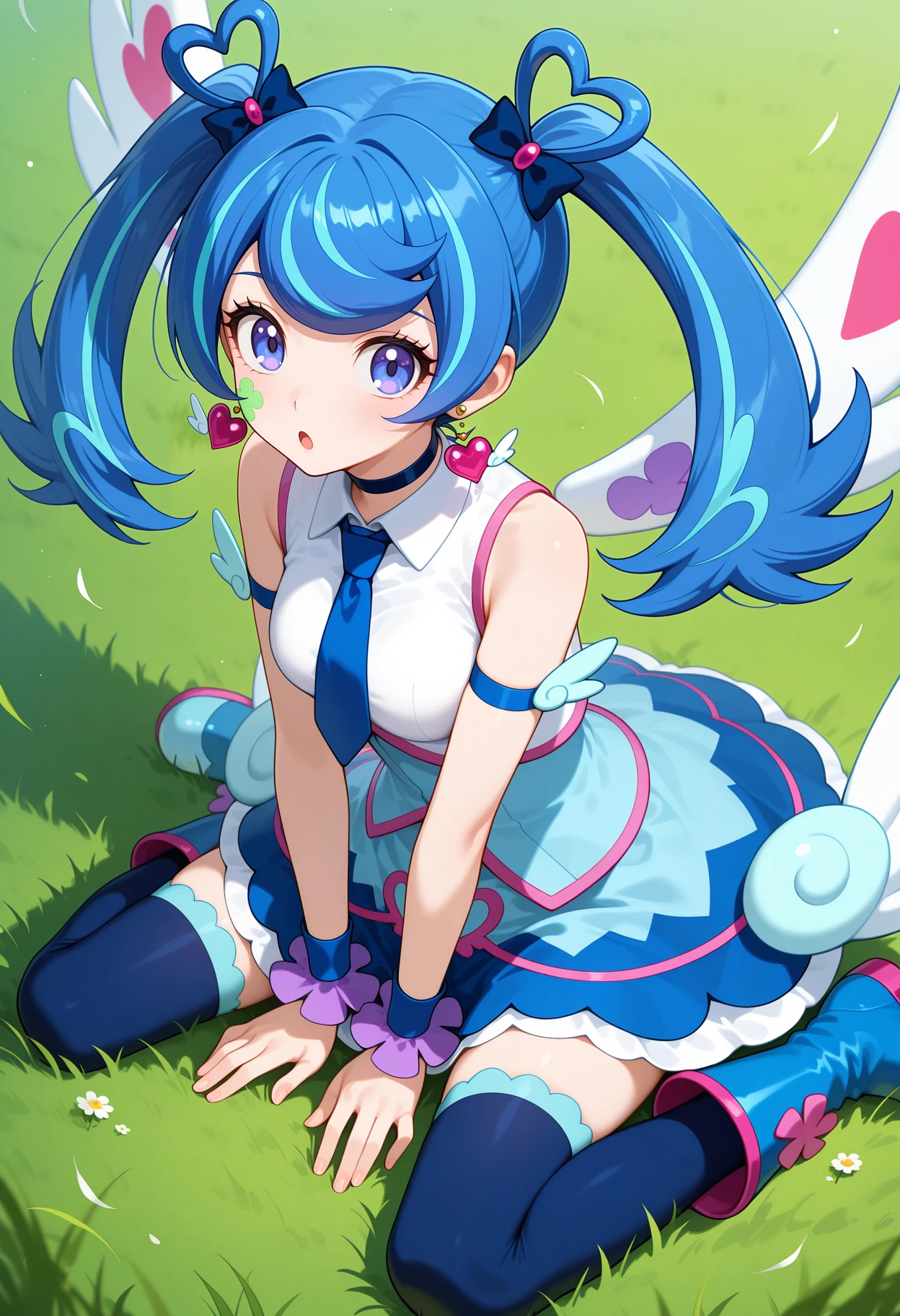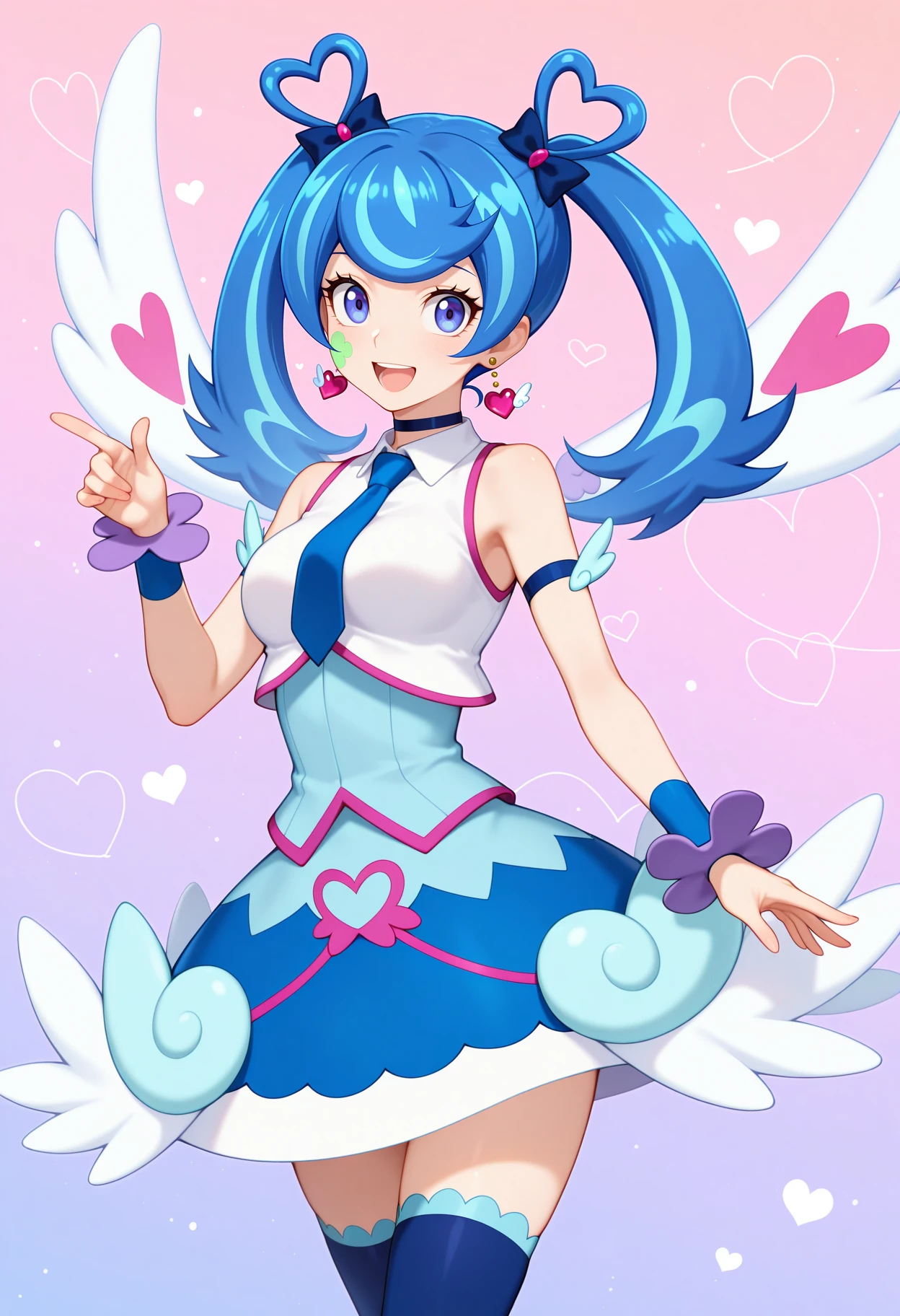 aaba, blue hair, twintails, hair rings, hair bow, heart earrings, blue eyes, facial mark, wings, choker, blue necktie, white shirt, dress, sleeveless, arm strap, wrist cuffs, blue skirt, blue thighhighs