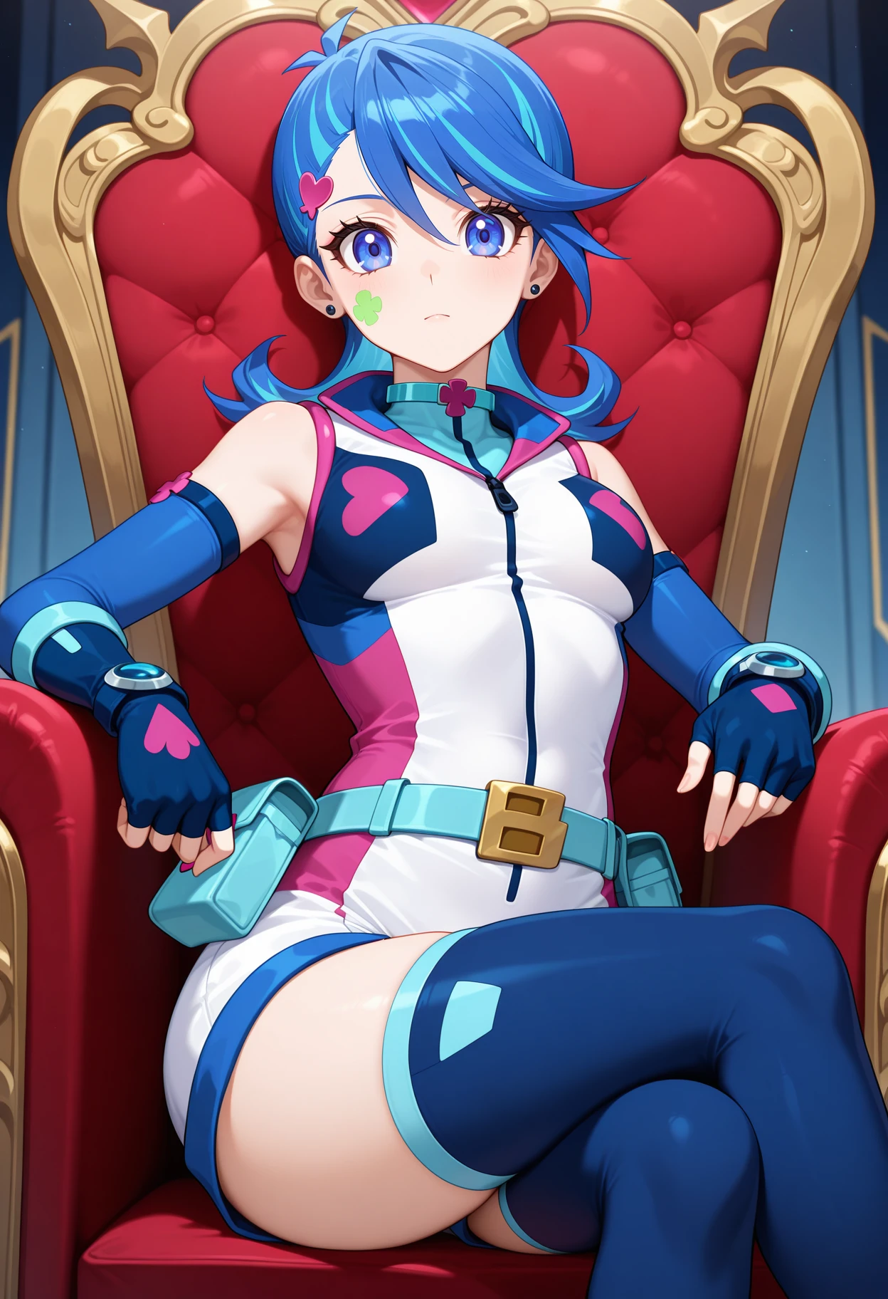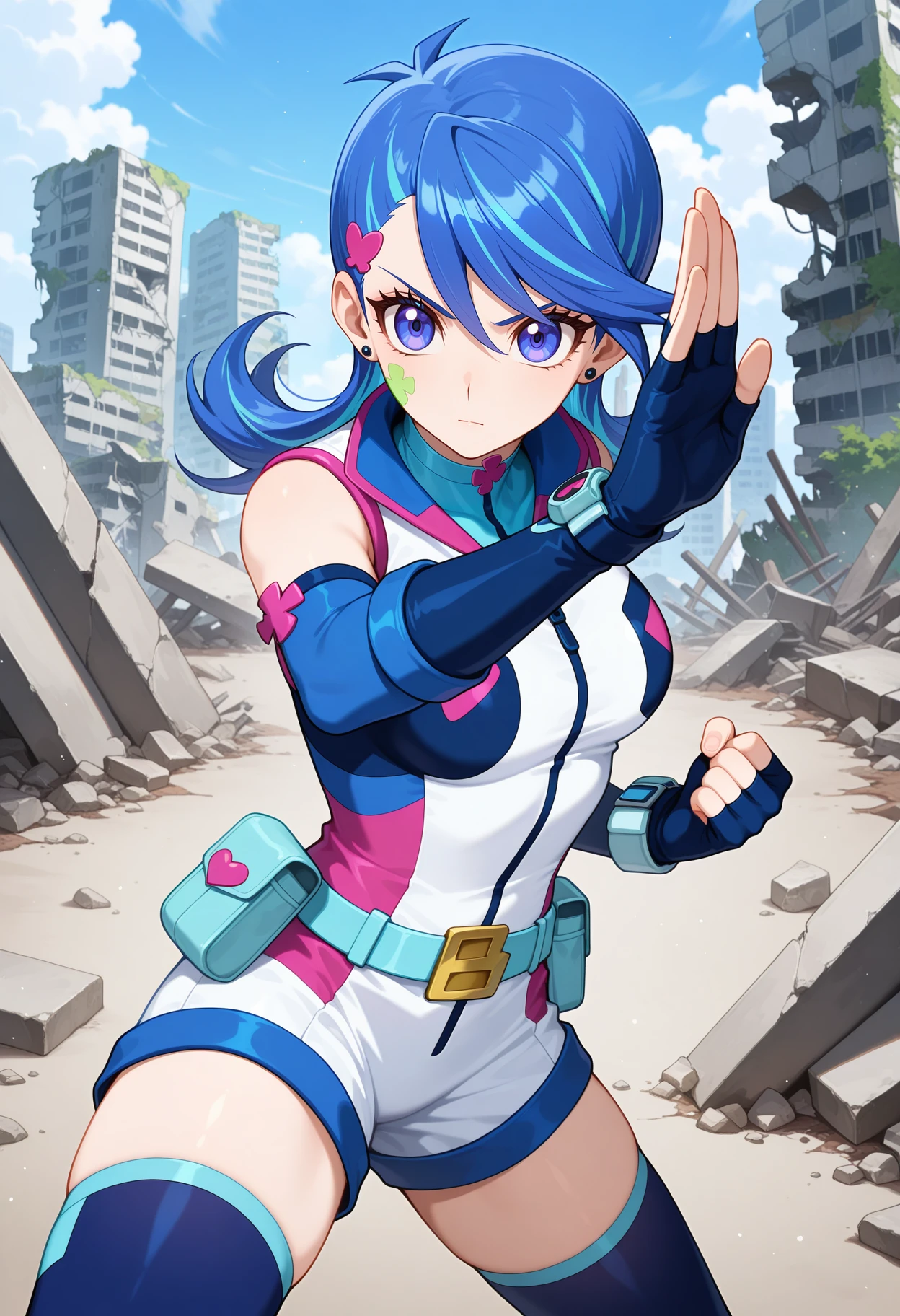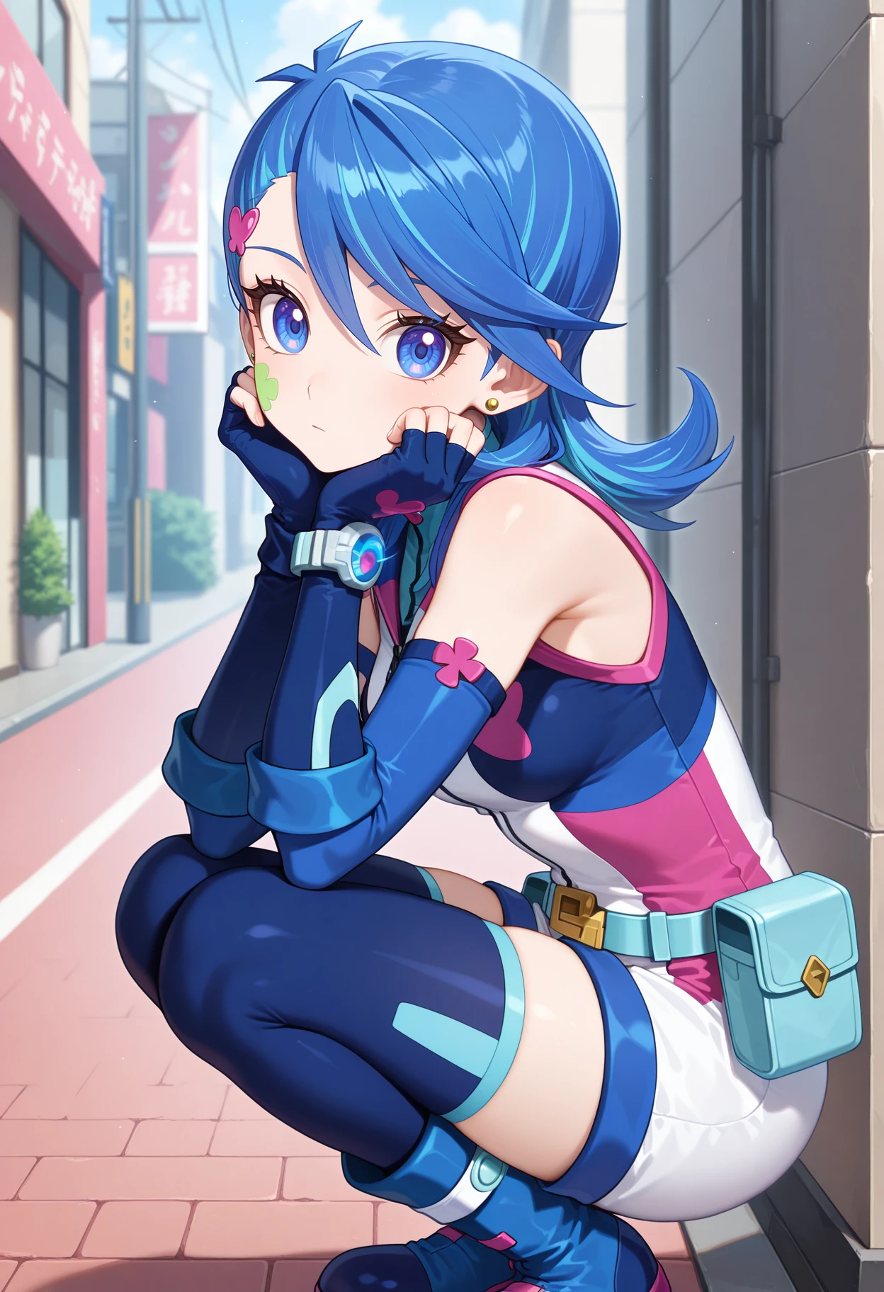 aabg, medium hair, blue hair, hair ornament, earrings, facial mark, short jumpsuit, sleeveless, elbow gloves, fingerless gloves, blue gloves, blue belt, belt pouch, blue thighhighs
