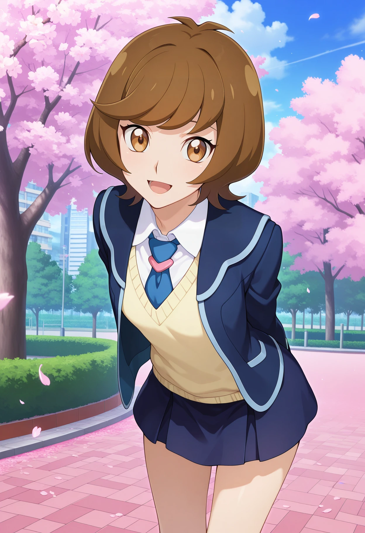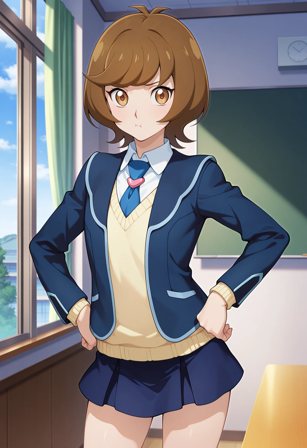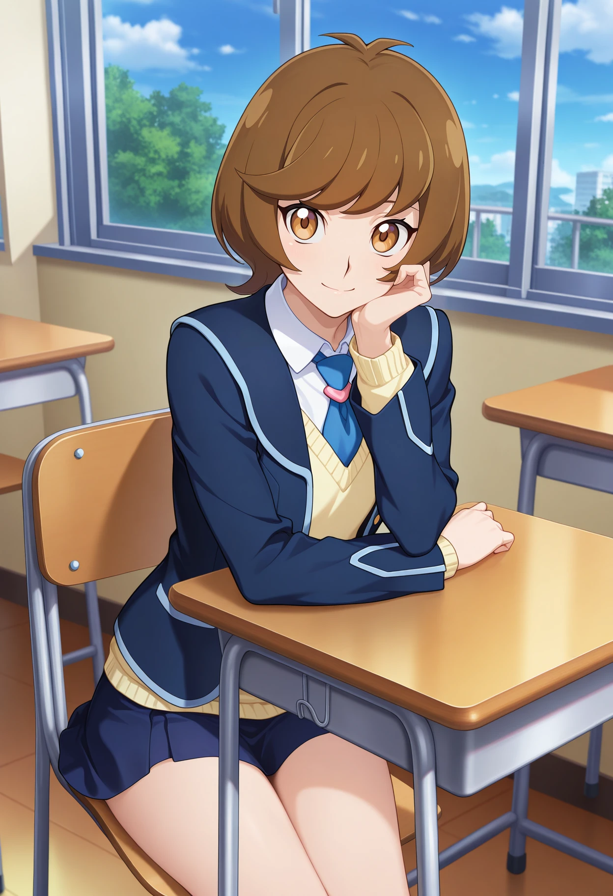 aaaoi, short hair, brown hair, brown eyes, school uniform, blue necktie, collared shirt, yellow sweater, blazer, blue jacket, long sleeves, miniskirt, blue skirt