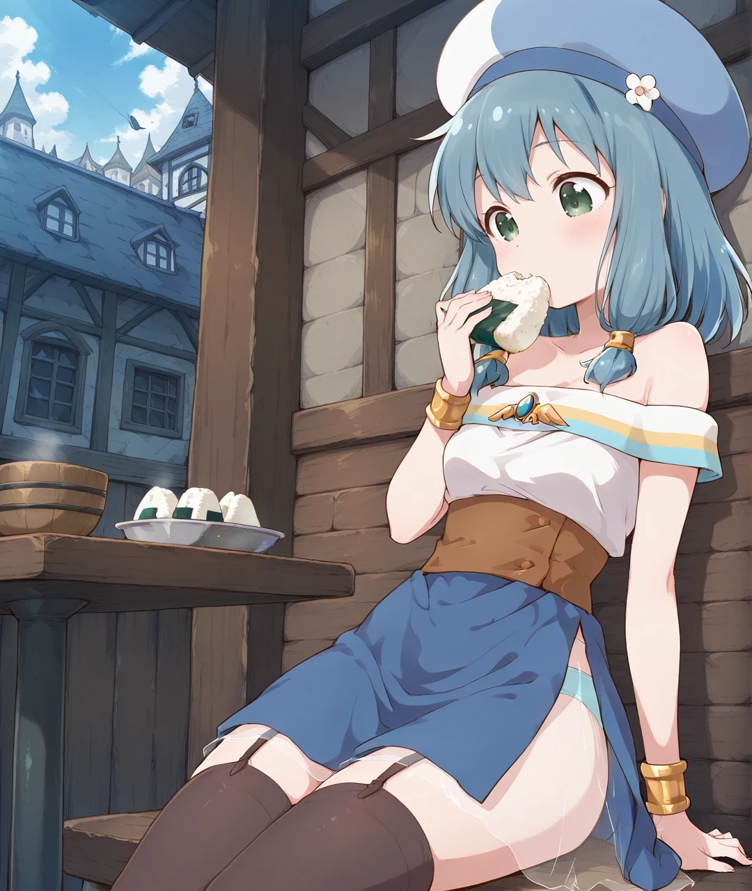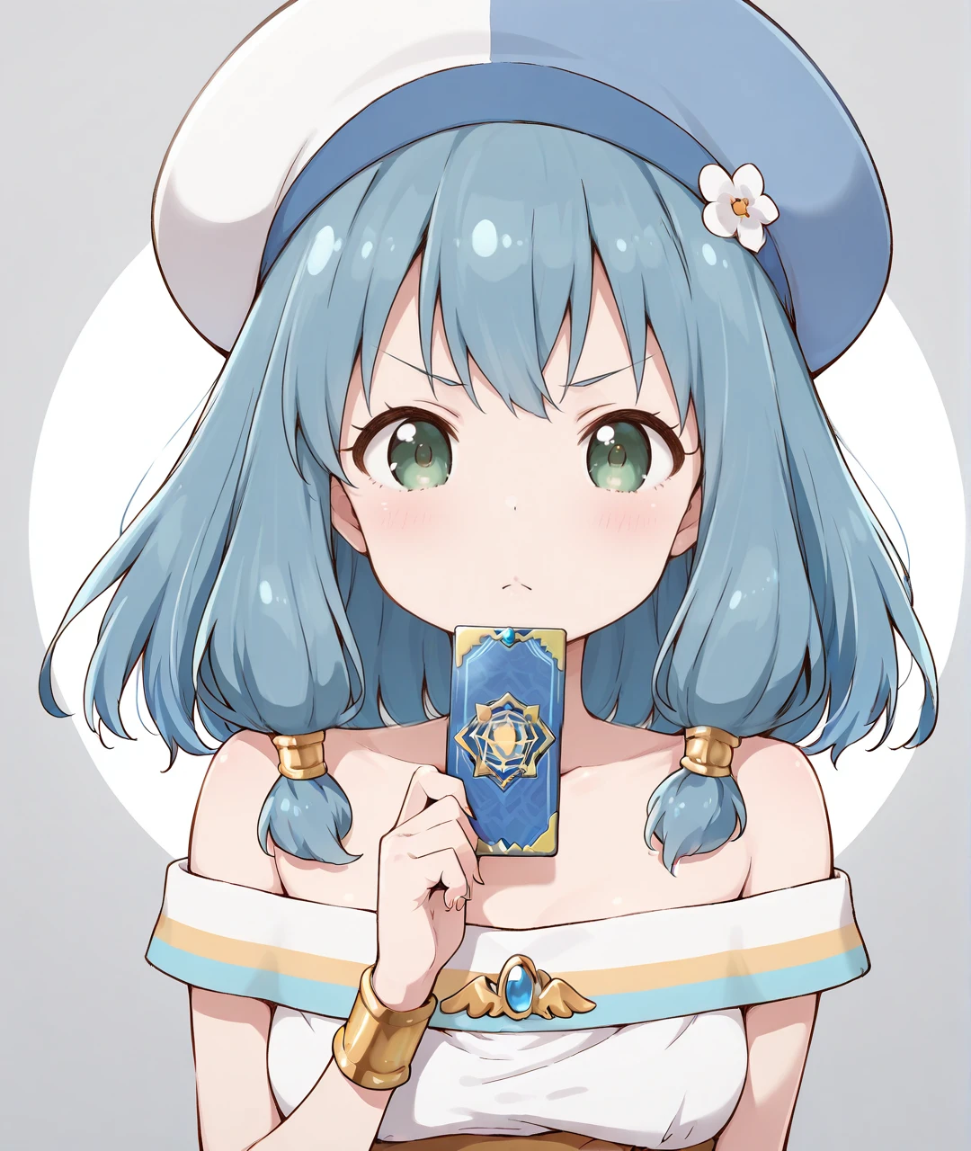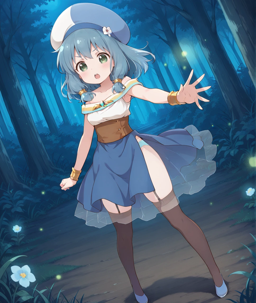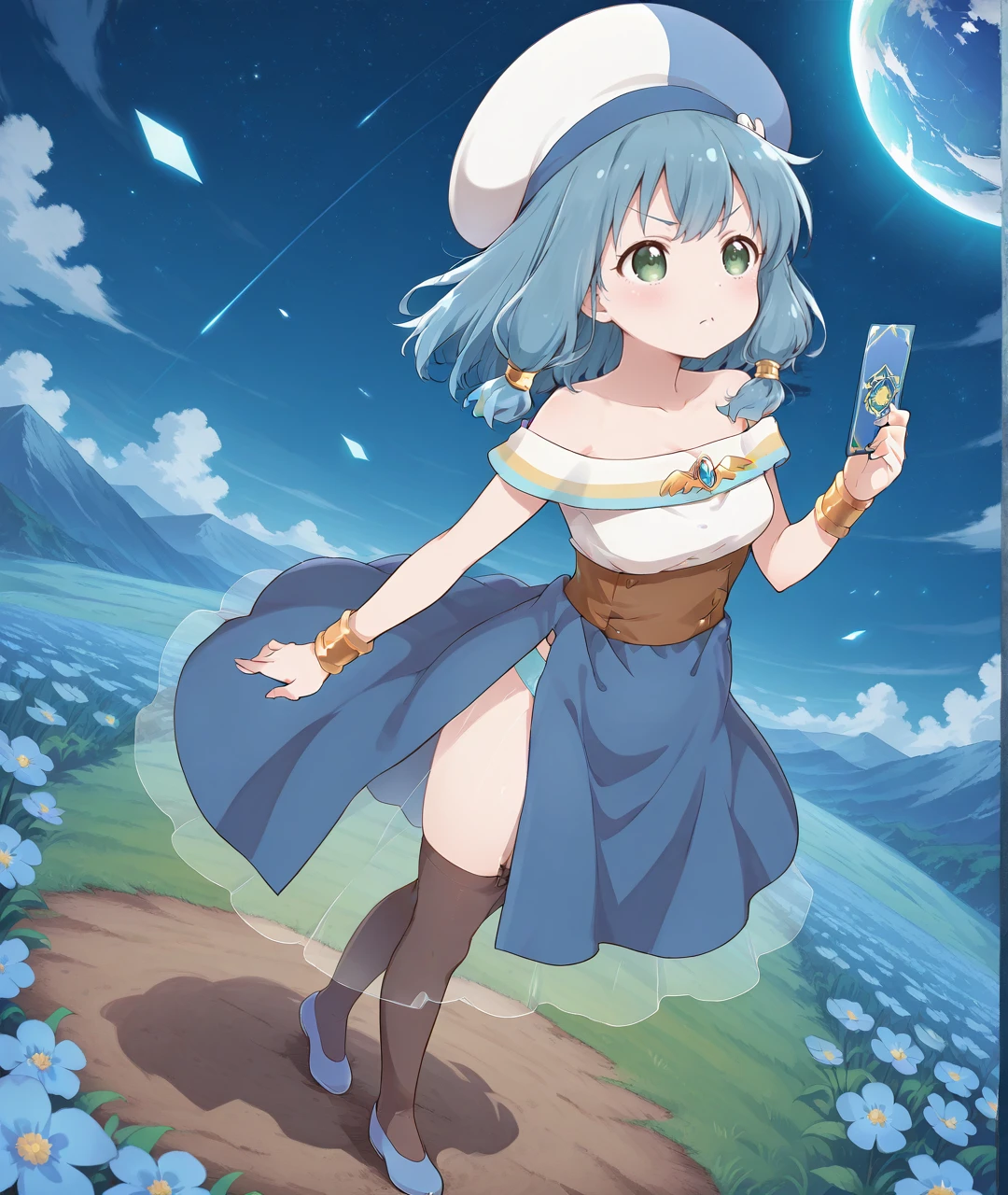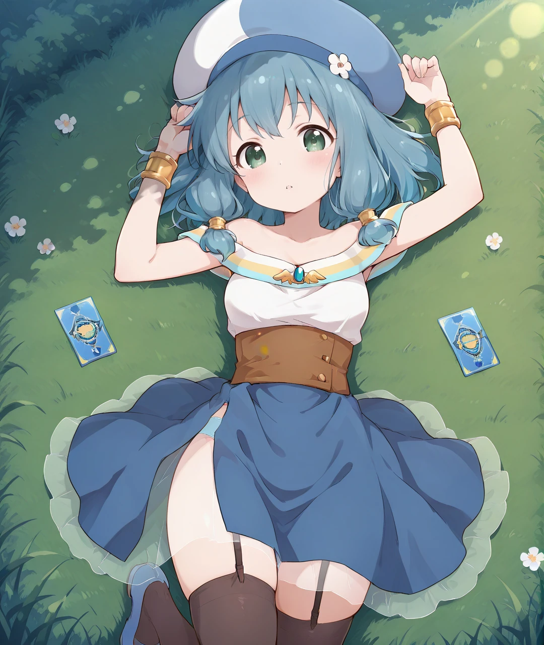 Tags: MeiBase, green eyes, blue hair, medium hair, two-tone beret, white beret, blue beret, white hair flower, gold hair ornament, bare shoulders, collarbone, small breasts, gold brooch, blue gem, off-shoulder shirt, white shirt, strapless, gold bracelets, brown sash, blue skirt, side slit, see-through skirt, blue panties, brown garter straps, brown thighhighs, blue shoes,
