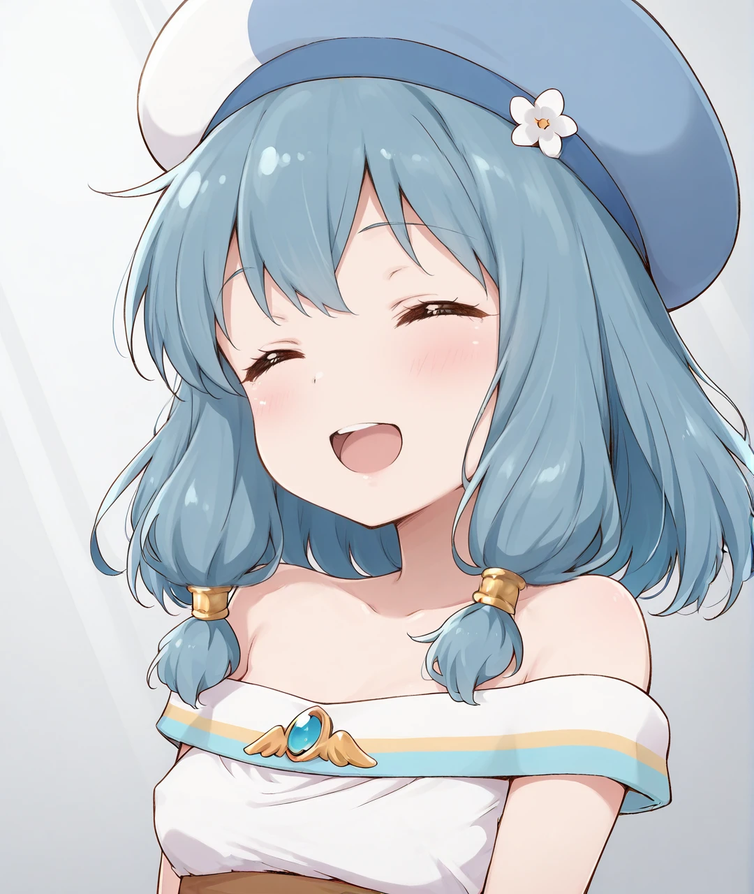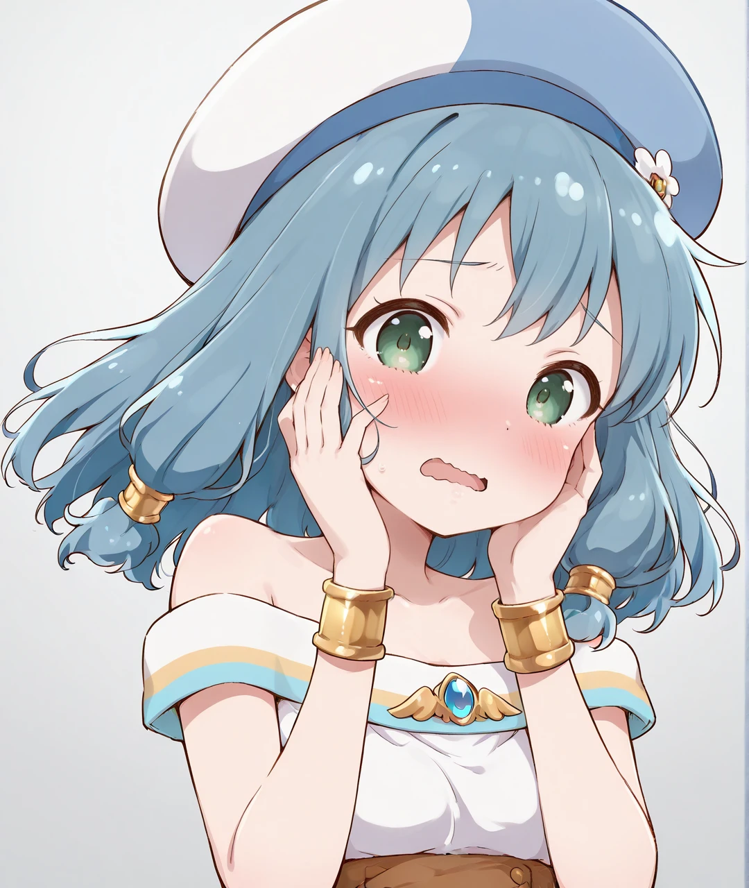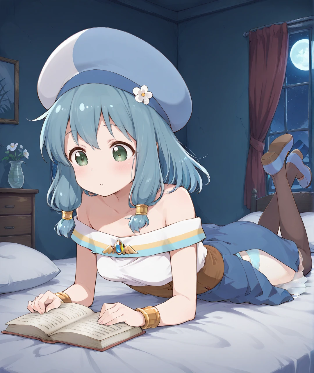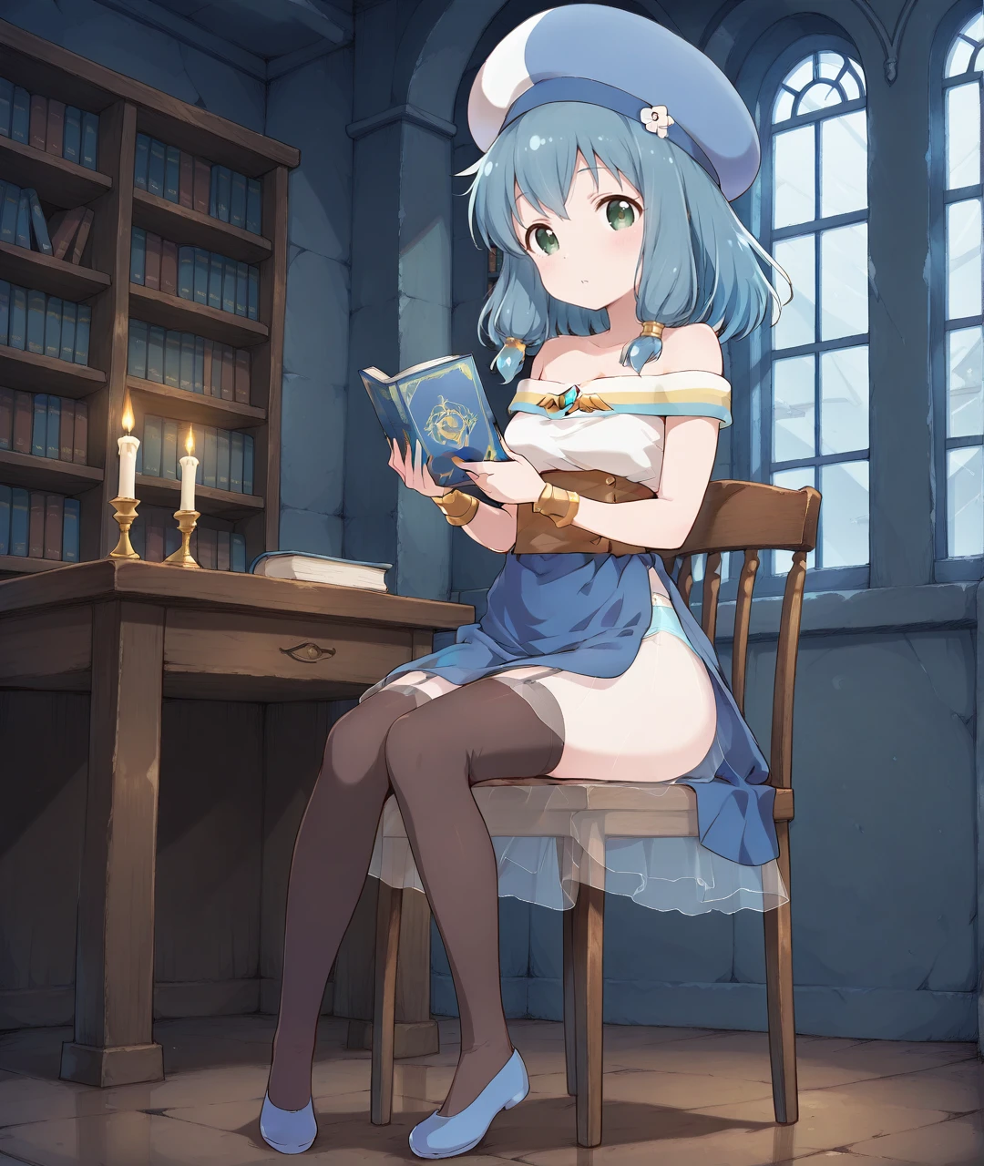 MeiBase, green eyes, blue hair, medium hair, two-tone beret, white beret, blue beret, white hair flower, gold hair ornament, bare shoulders, collarbone, small breasts, gold brooch, blue gem, off-shoulder shirt, white shirt, strapless, gold bracelets, brown sash, blue skirt, side slit, see-through skirt, blue panties, brown garter straps, brown thighhighs, blue shoes,