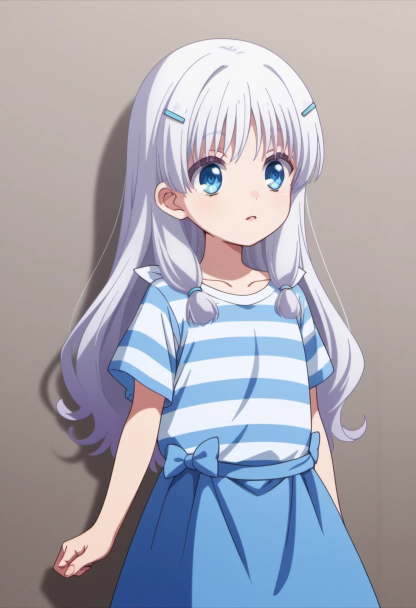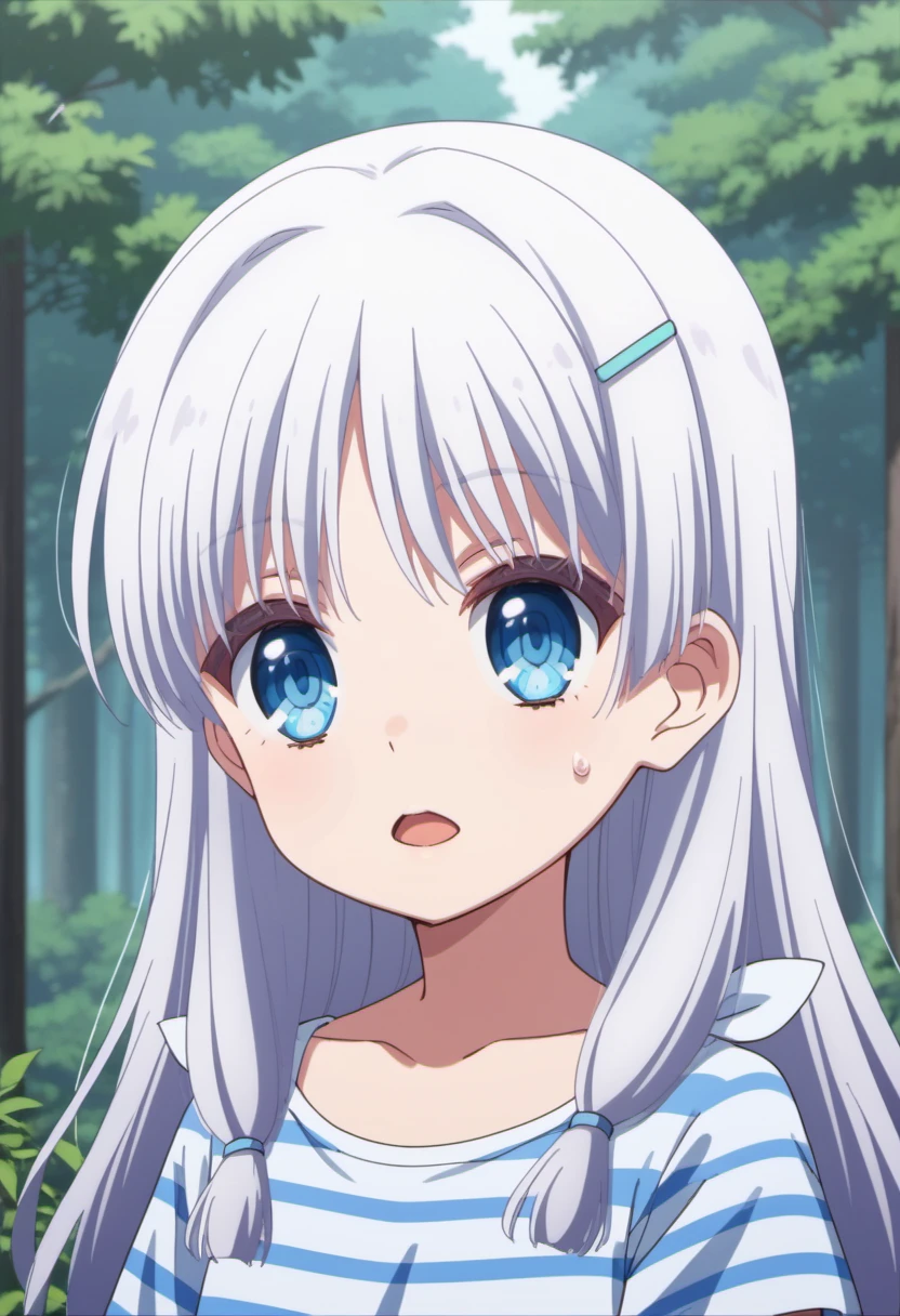 When she is a child: naruse shiroha, long hair, white hair, blue eyes, child