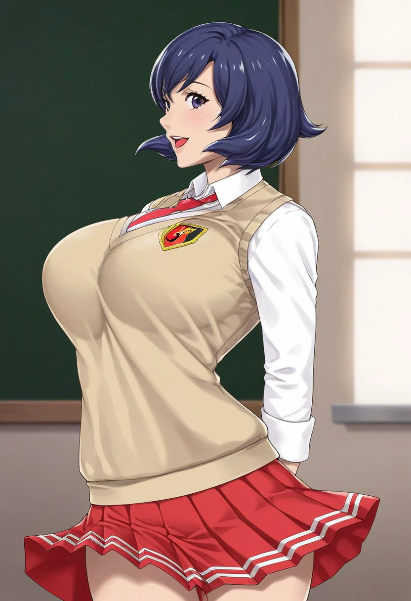 1st outfit: beige sweater vest, logo on vest, white collared shirt, long sleeves, red and white pleated skirt, blue knee-high socks, brown loafers,