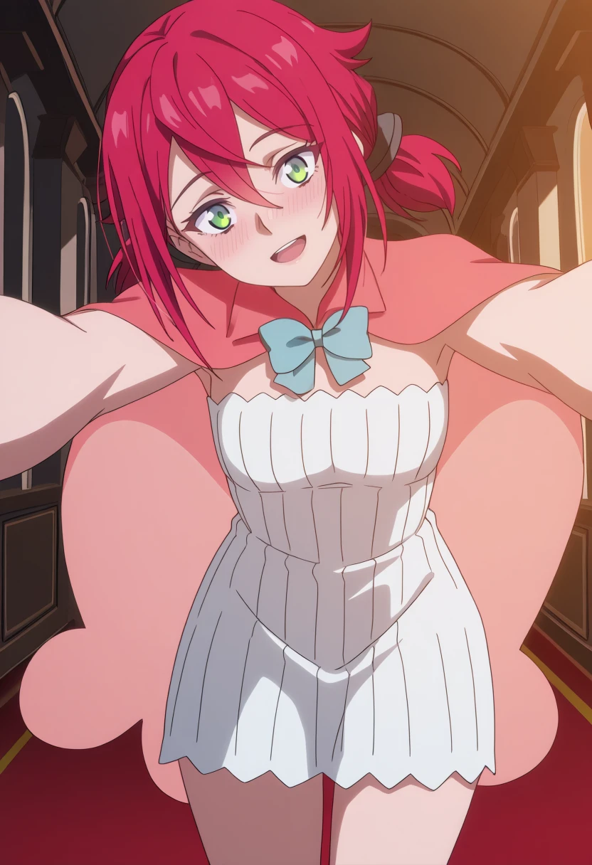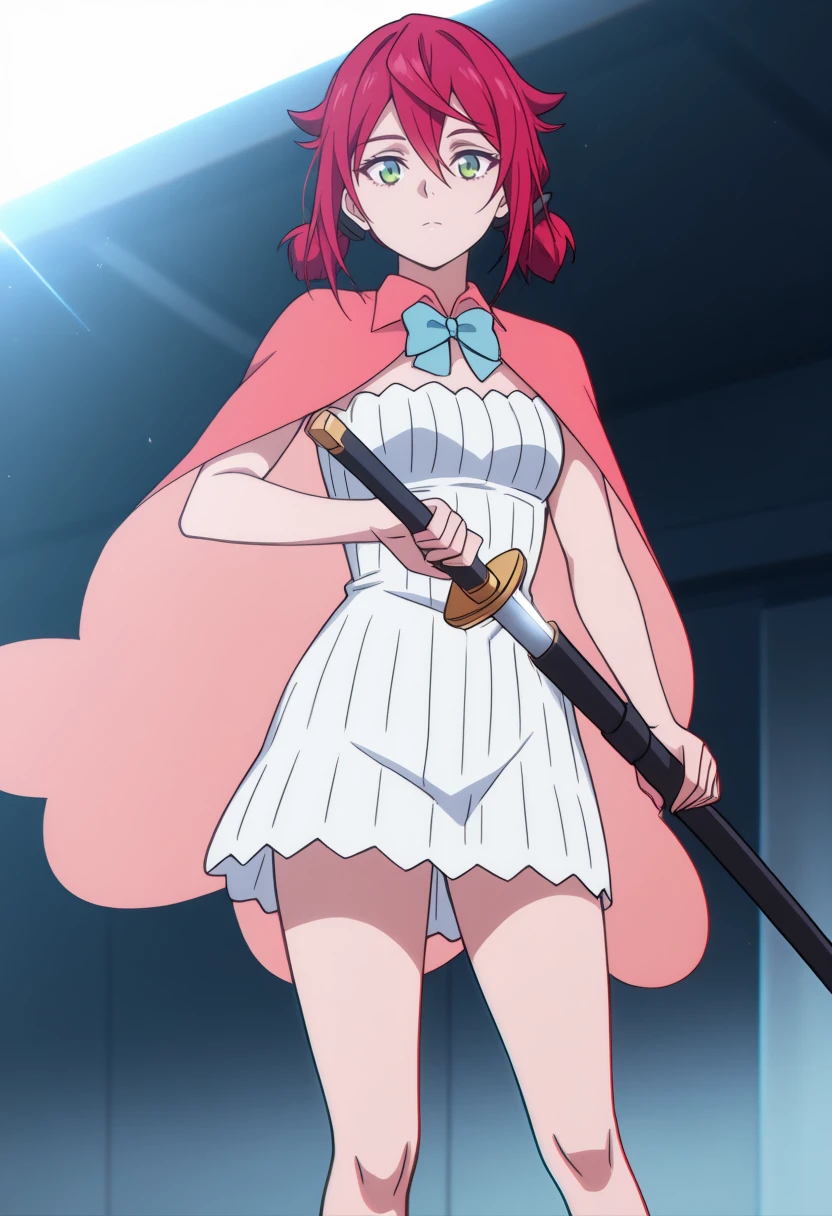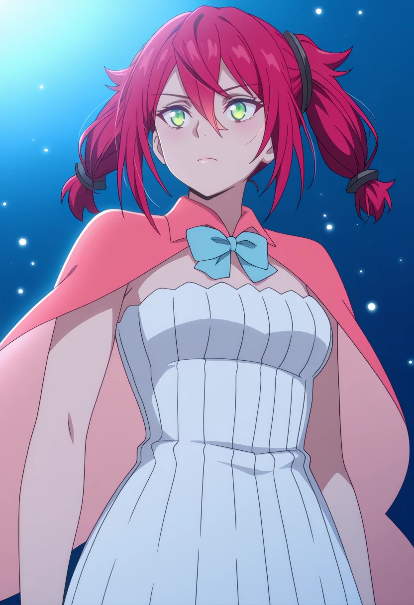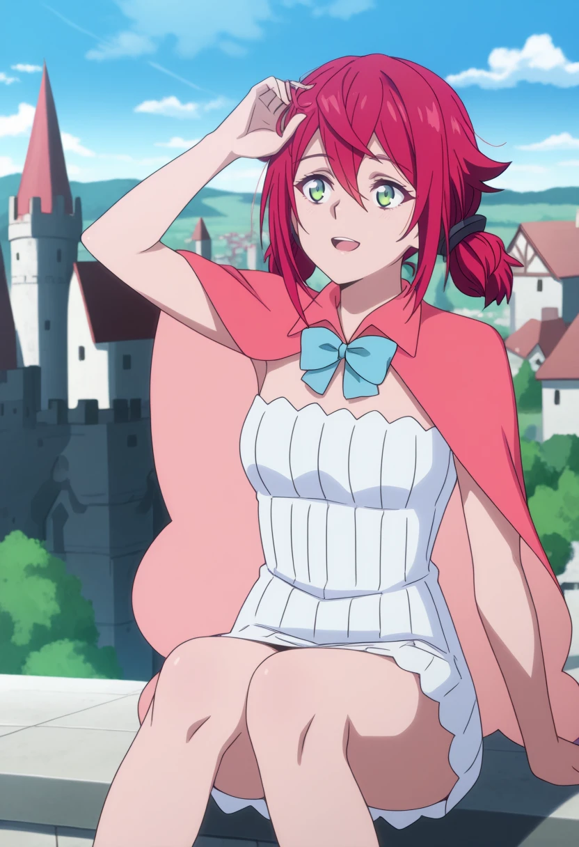 1girl,red short hair,pigtails,green eyes, | short white dress,sleeveless dress,short pink cape,light blue bow,bare legs, | anime screencap
