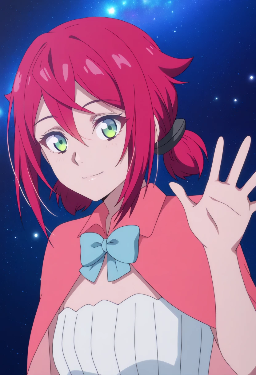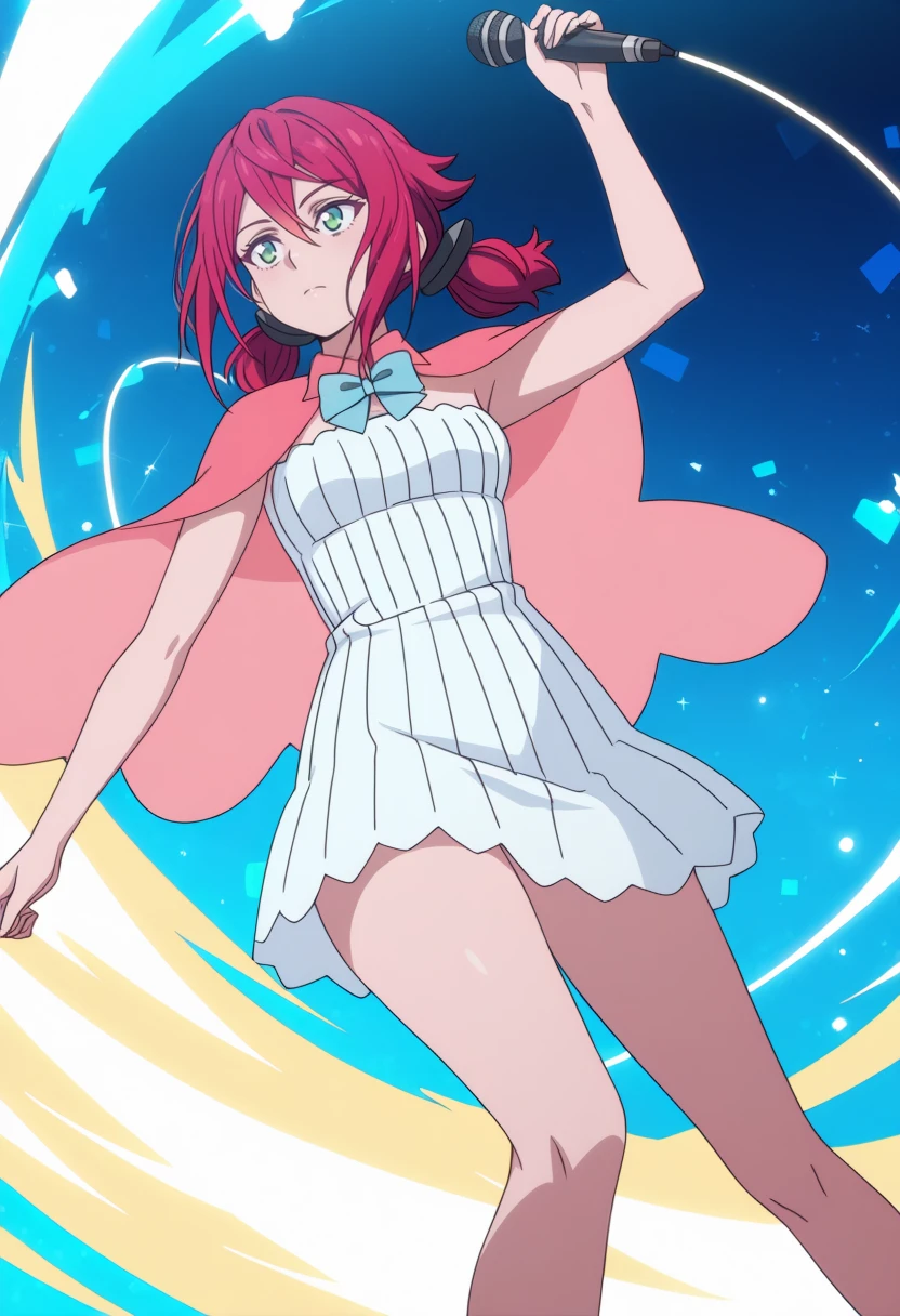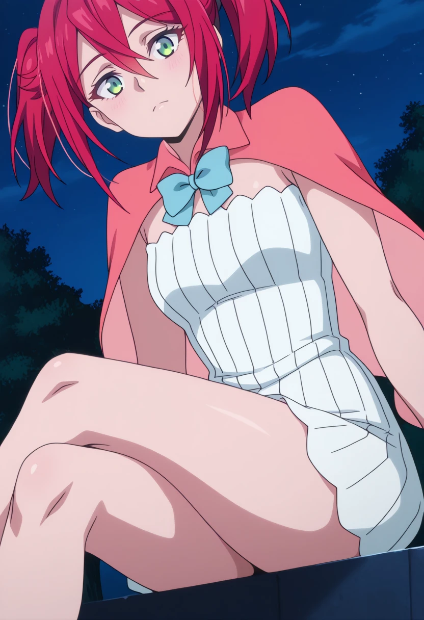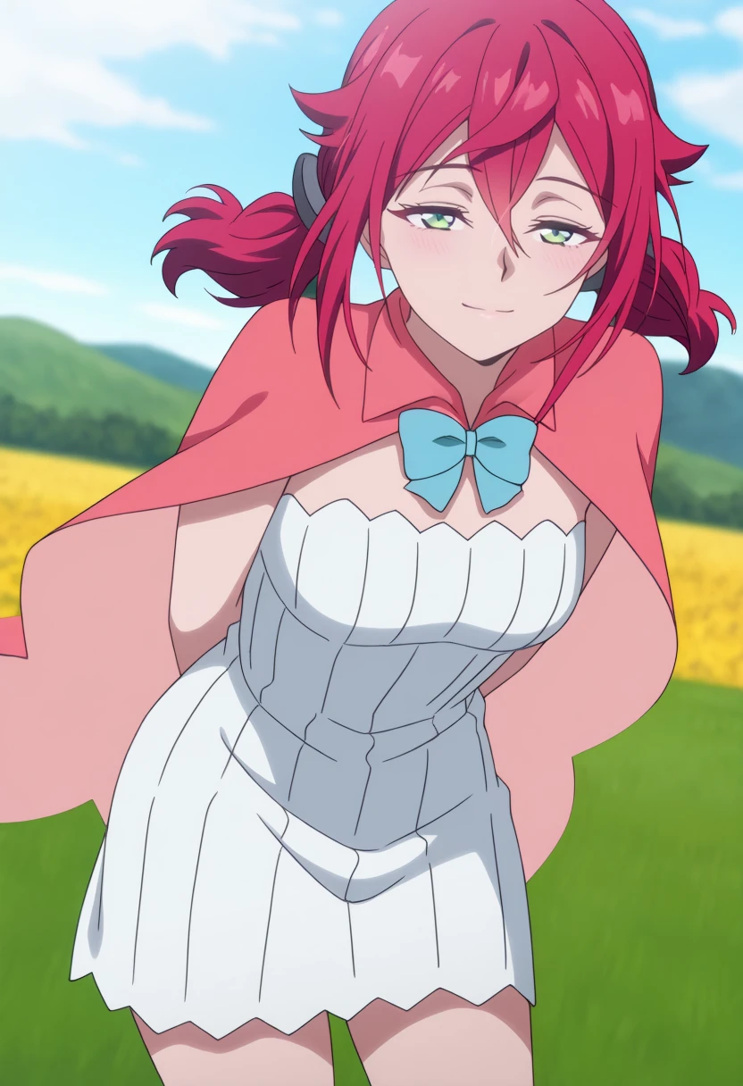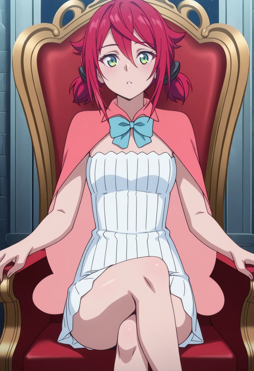 1girl,red short hair,pigtails,green eyes, | short white dress,sleeveless dress,short pink cape,light blue bow,bare legs, | anime screencap