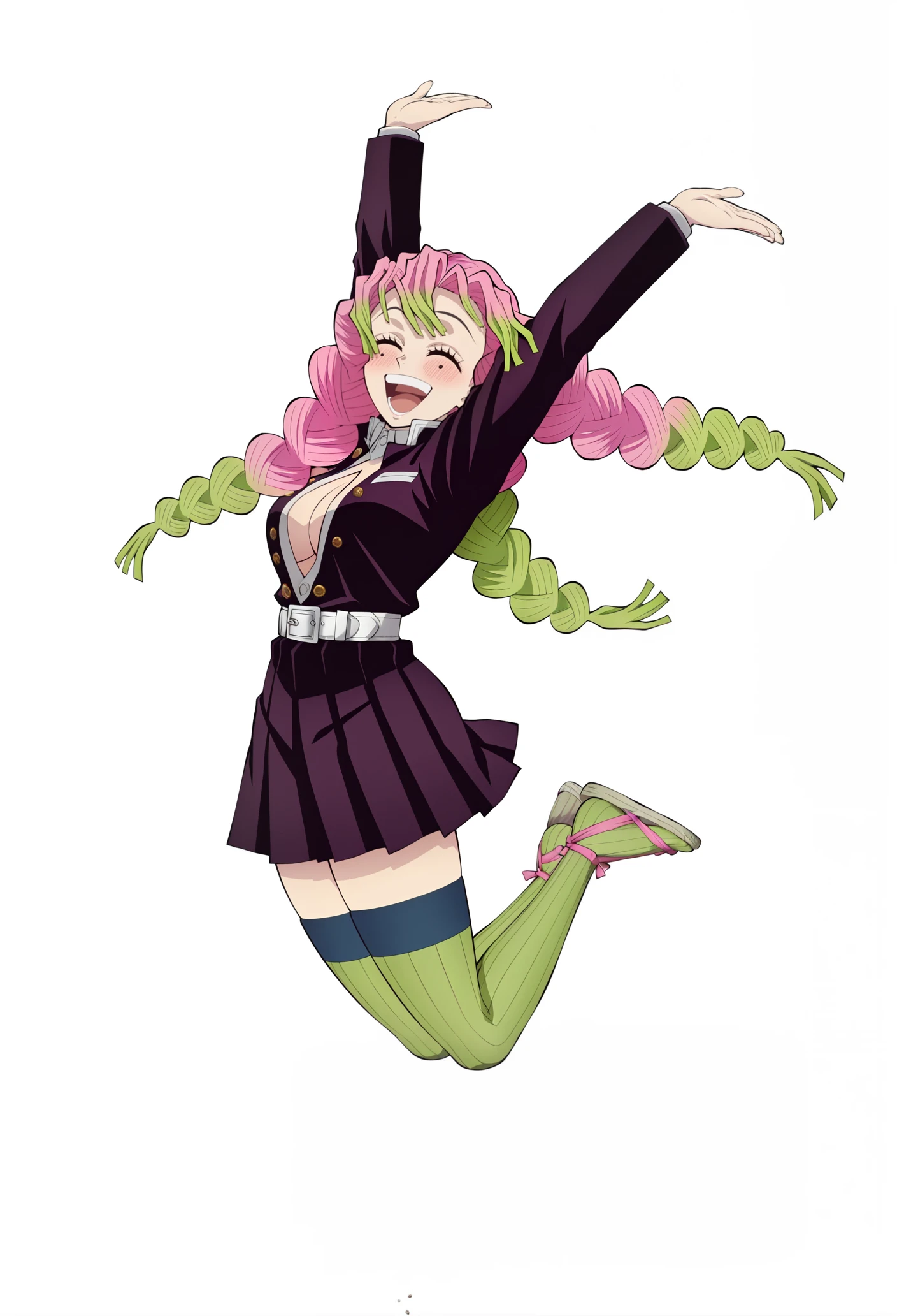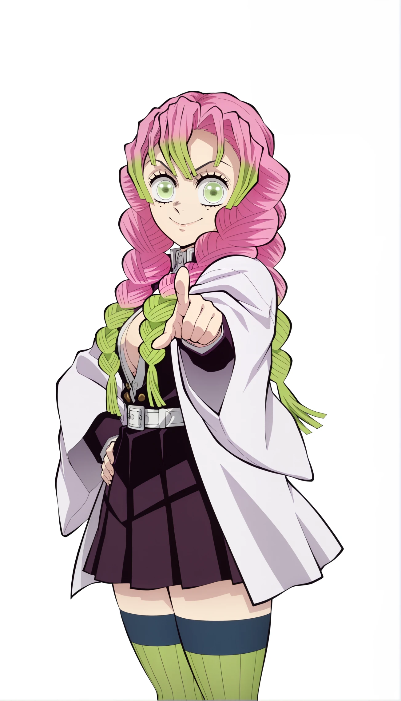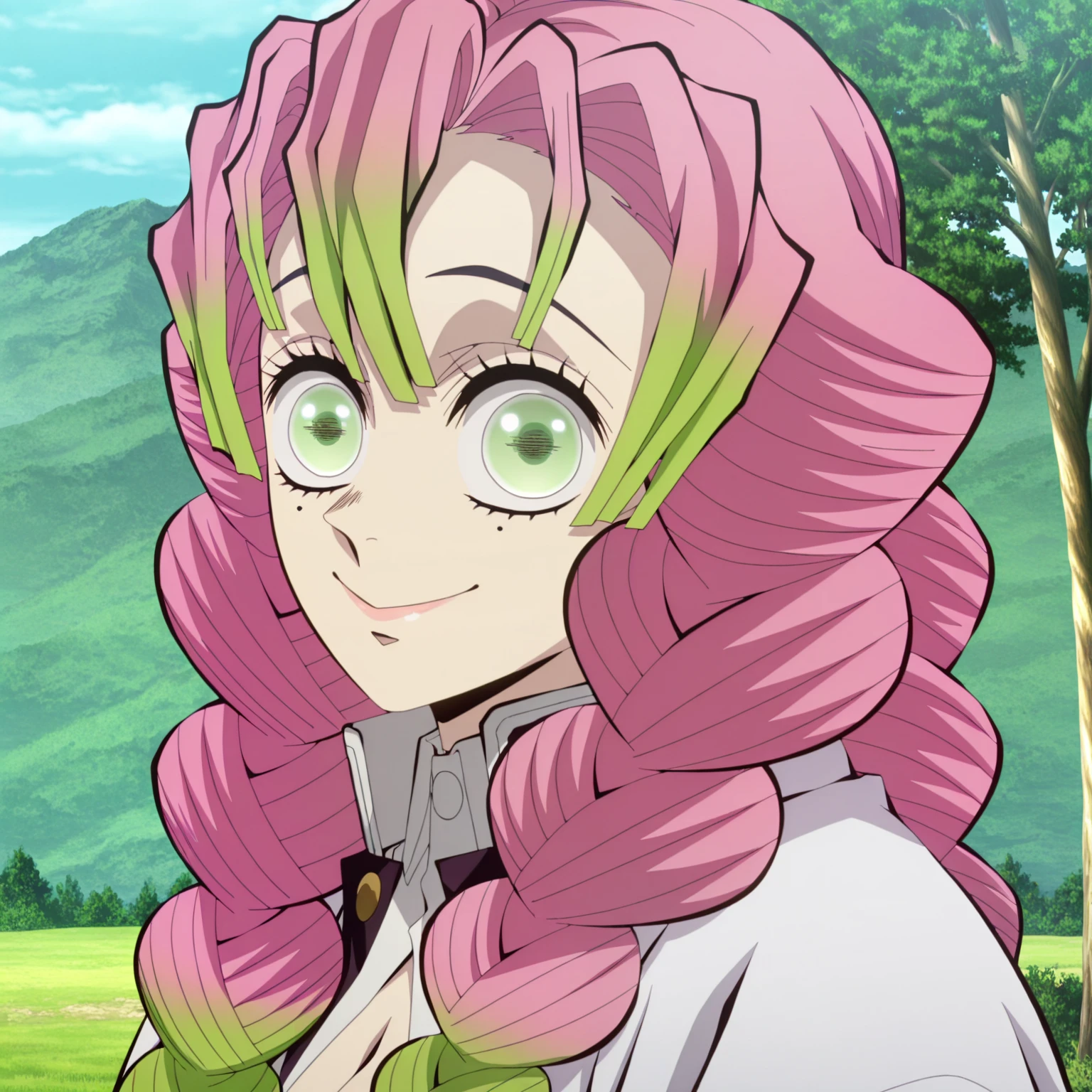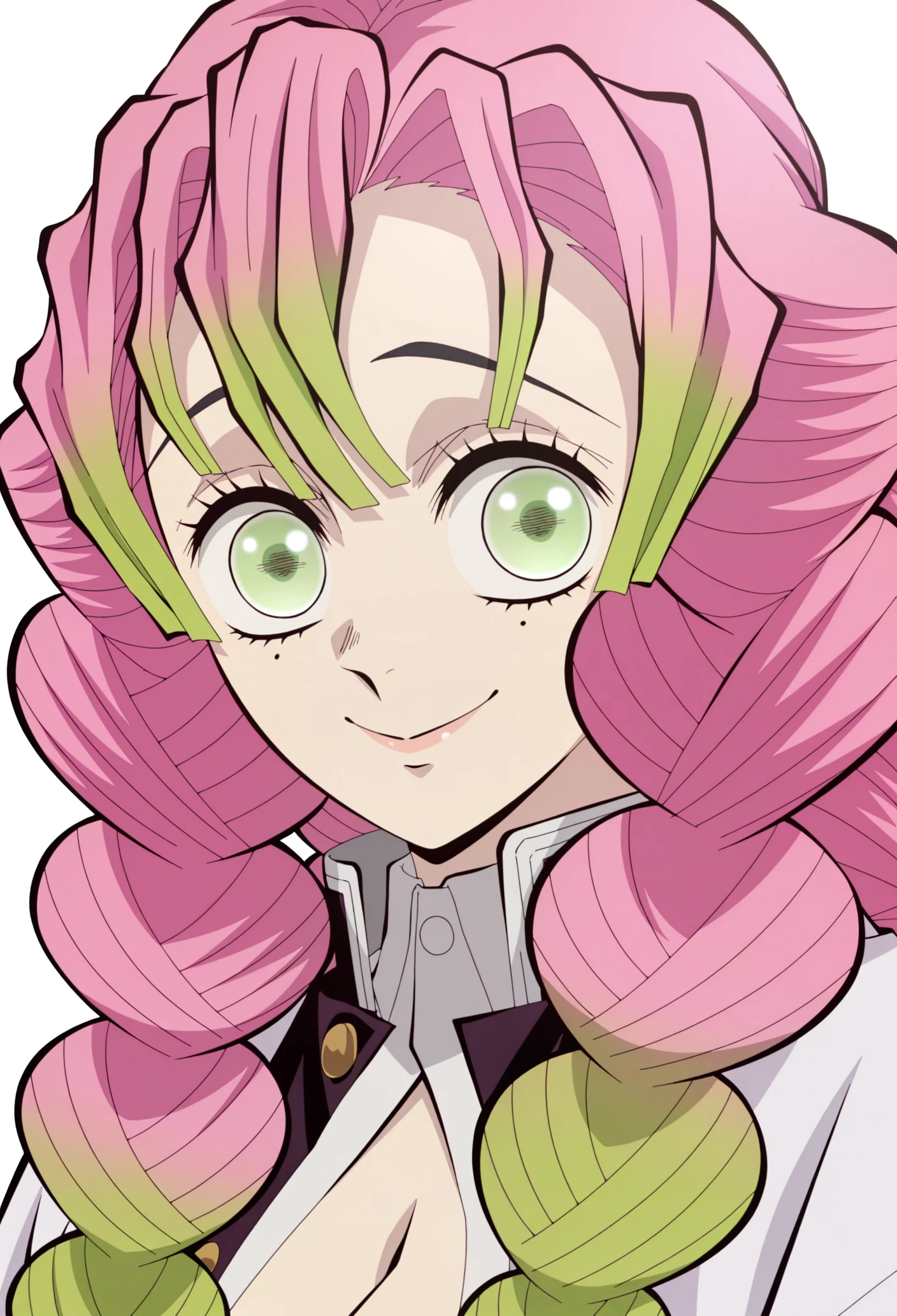 kanroji mitsuri, 1girl, multicolored hair, braids, pink hair, green hair, green eyes, mole