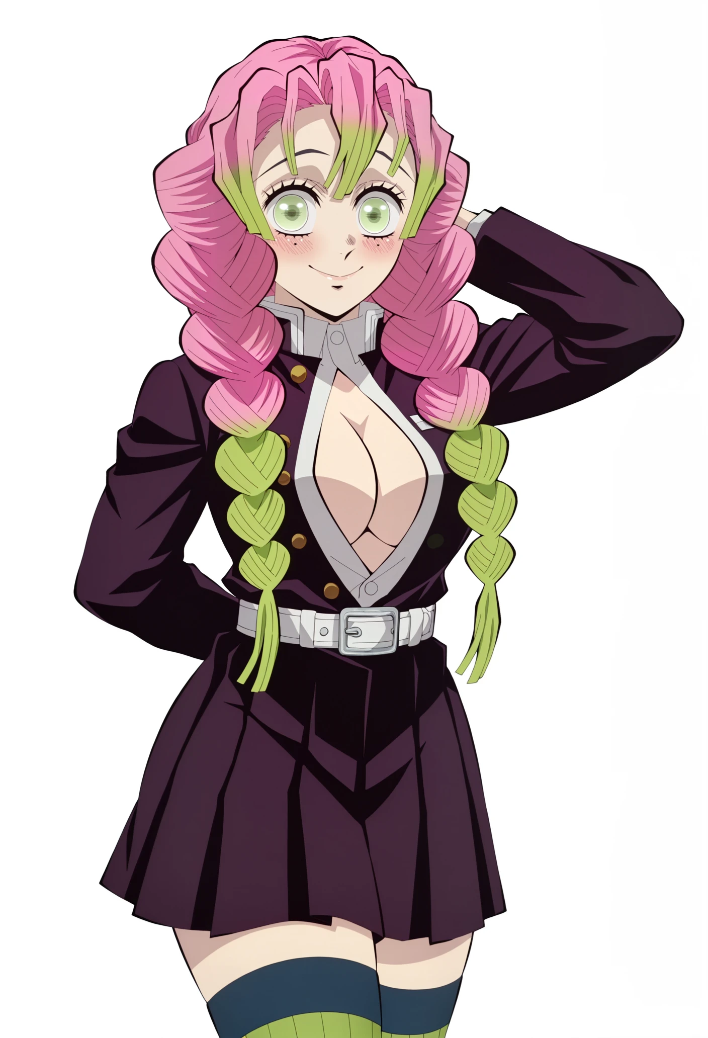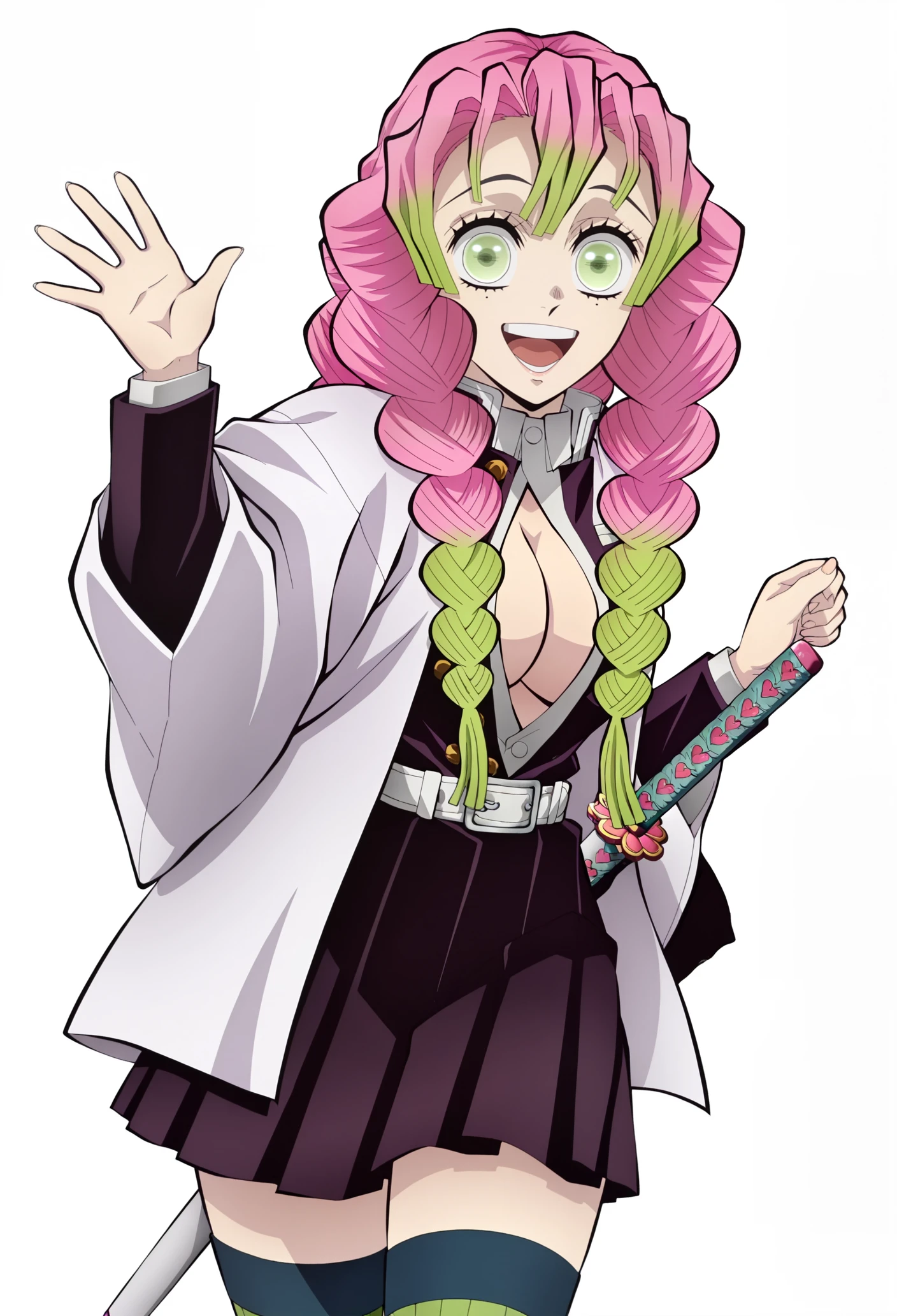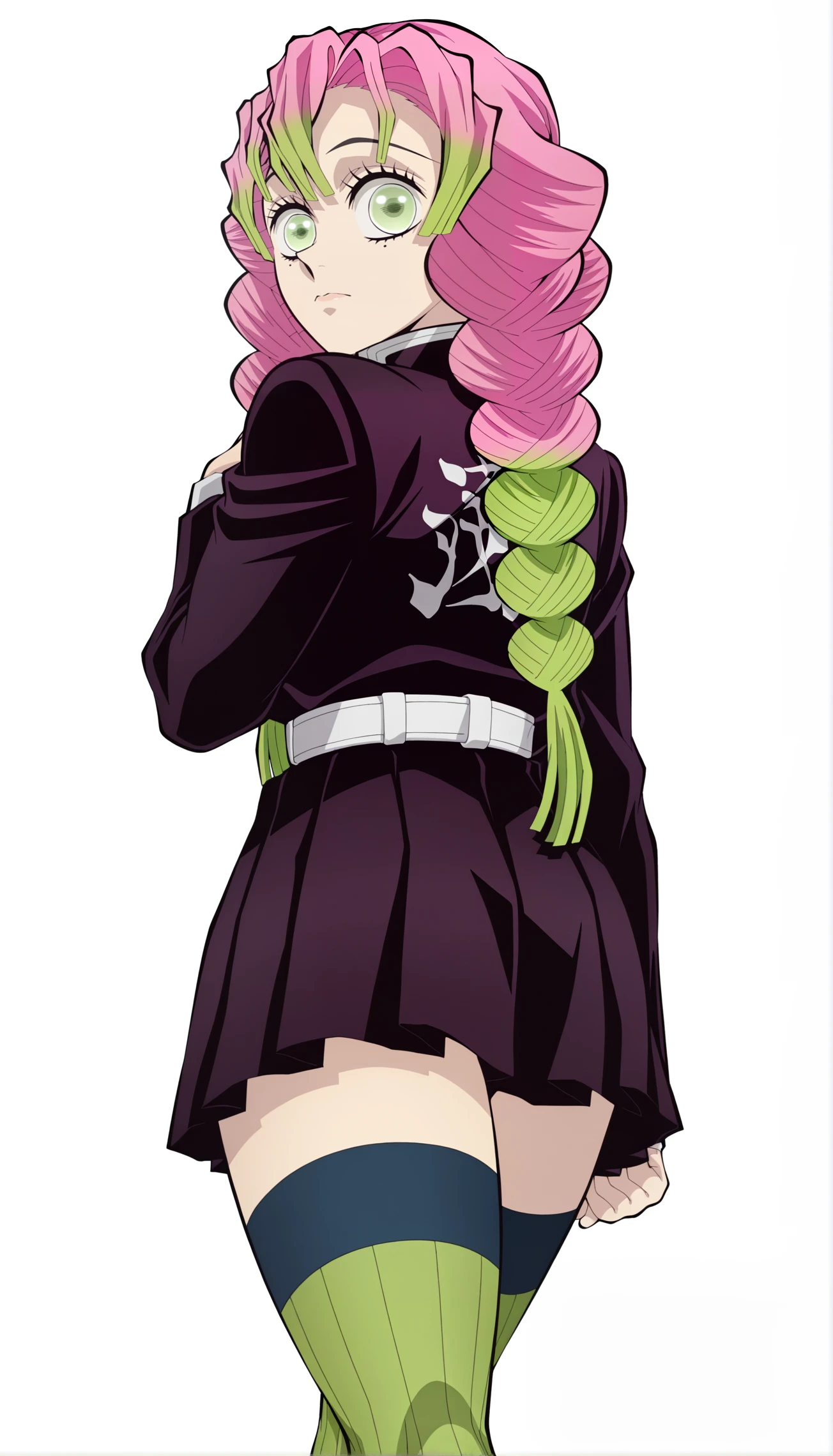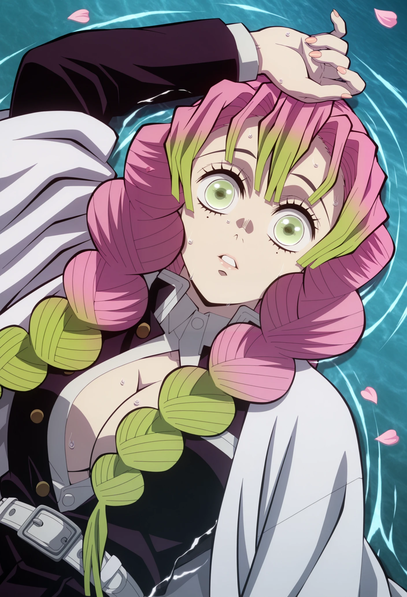 kanroji mitsuri, 1girl, multicolored hair, braids, pink hair, green hair, green eyes, mole