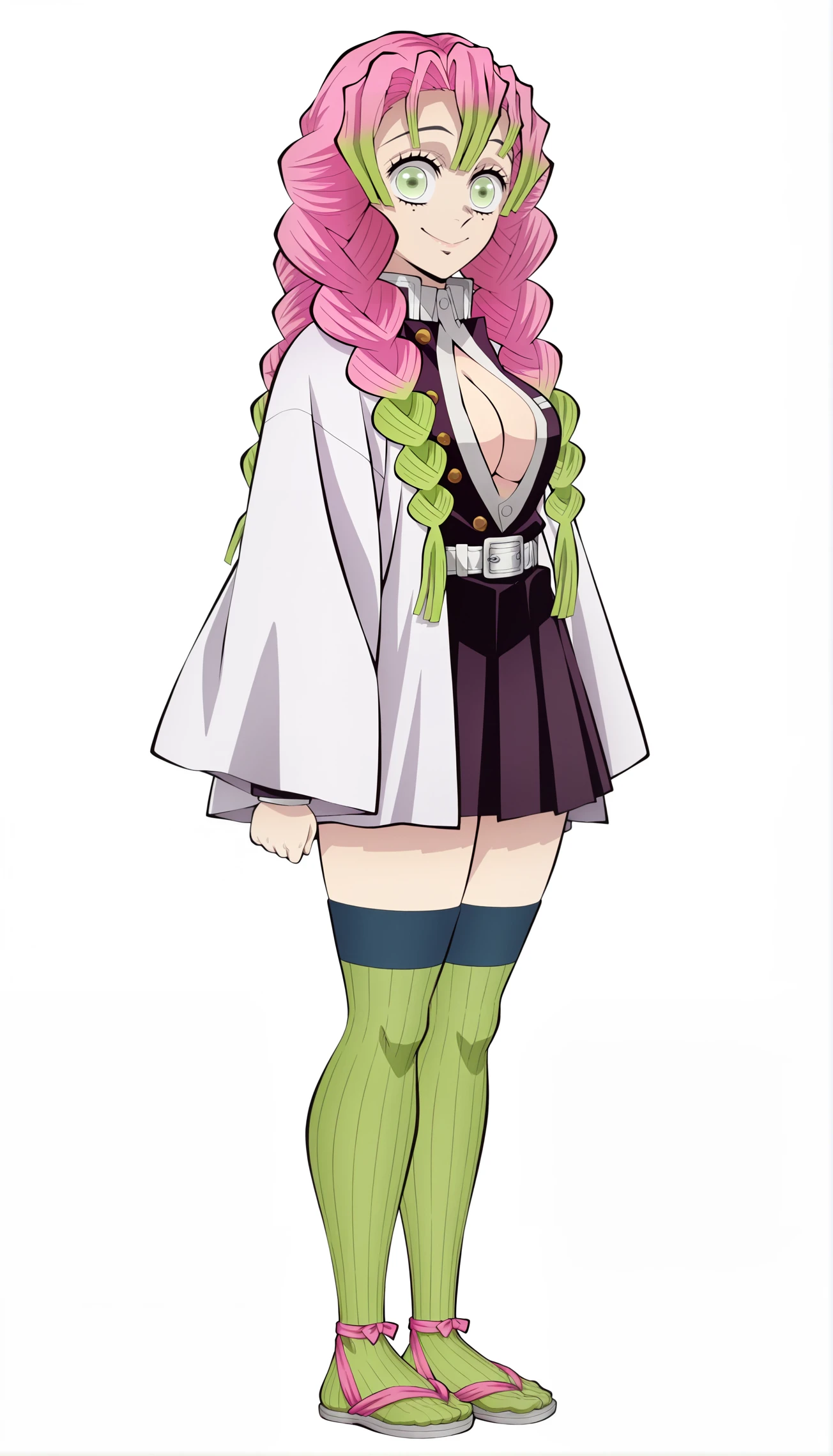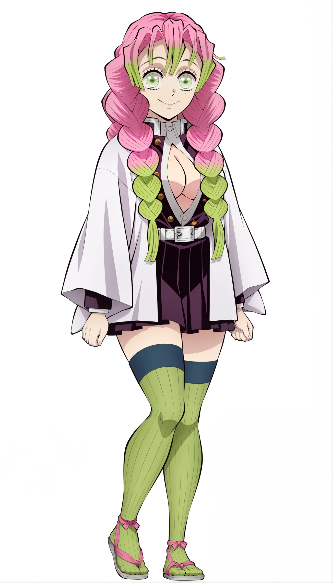 demon slayer uniform, black jacket, haori, belt, black skirt, green thighhighs, sandals