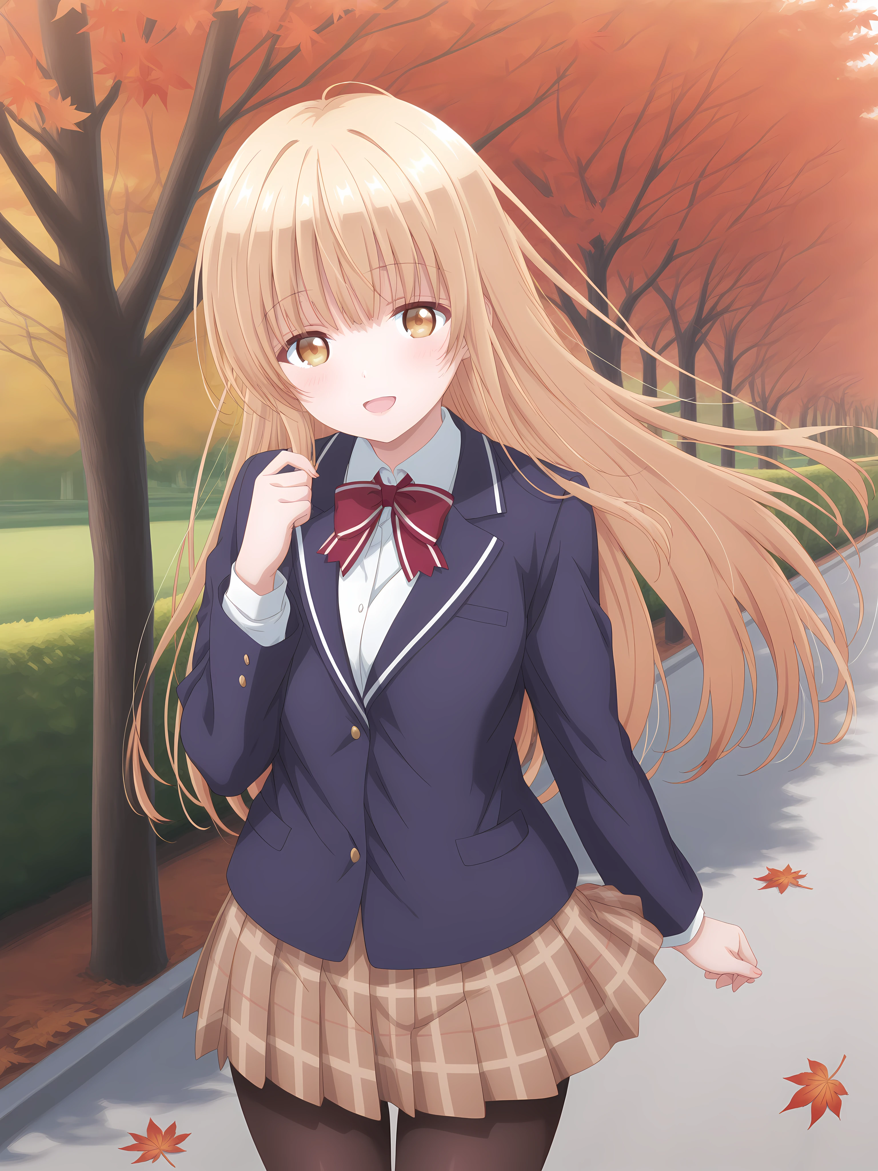 school uniform, skirt, jacket, brown skirt, bow, pleated skirt, shoes, black footwear, pantyhose, brown pantyhose, plaid skirt, red bow, plaid, bowtie