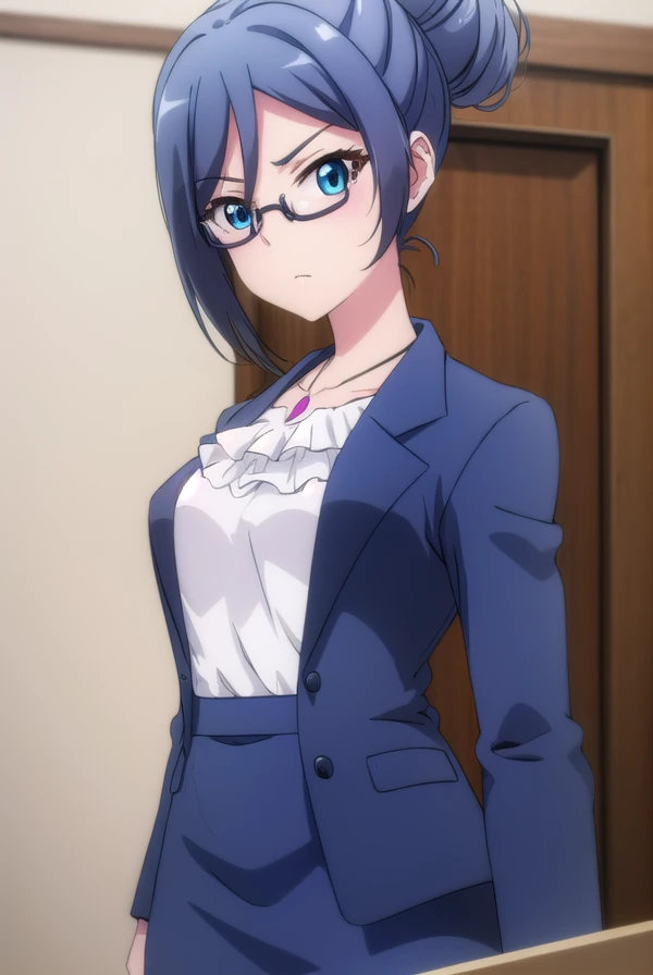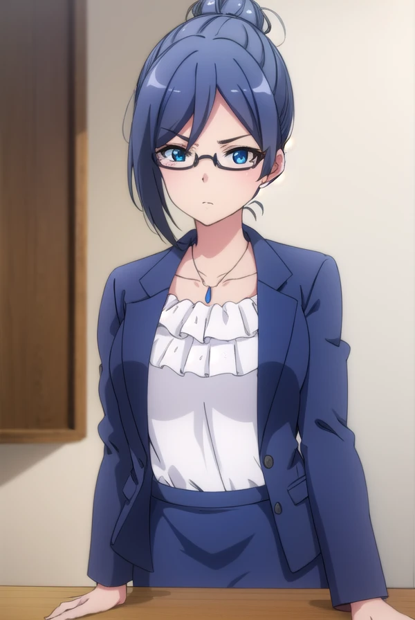 skirt, shirt, jewelry, collarbone, jacket, white shirt, pantyhose, necklace, blue skirt, black pantyhose, formal, single hair bun, suit, blue jacket, pencil skirt, teacher, skirt suit,