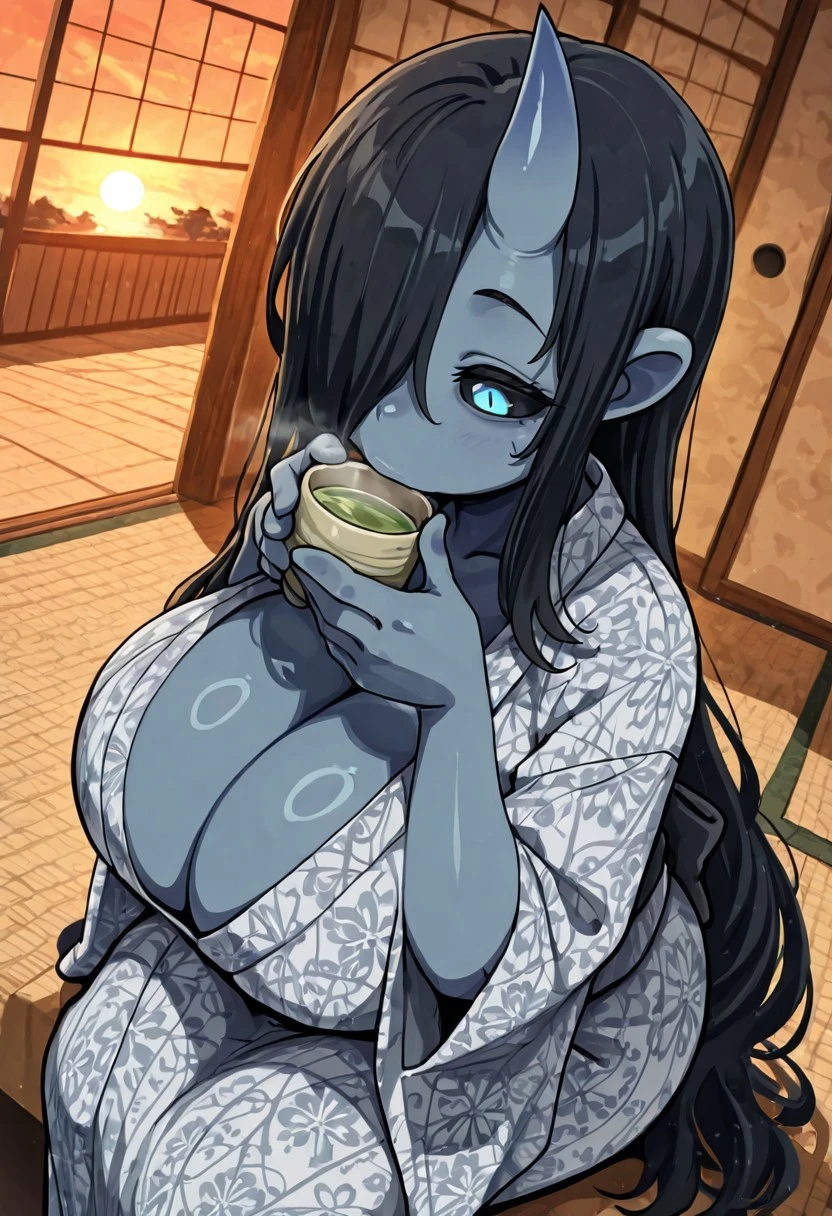 Oni_Girl, shortstack, oni horn, single horn, black sclera, blue eyes, colored skin, blue skin, black hair, very long hair, hair over one eye, huge breasts, mature female,