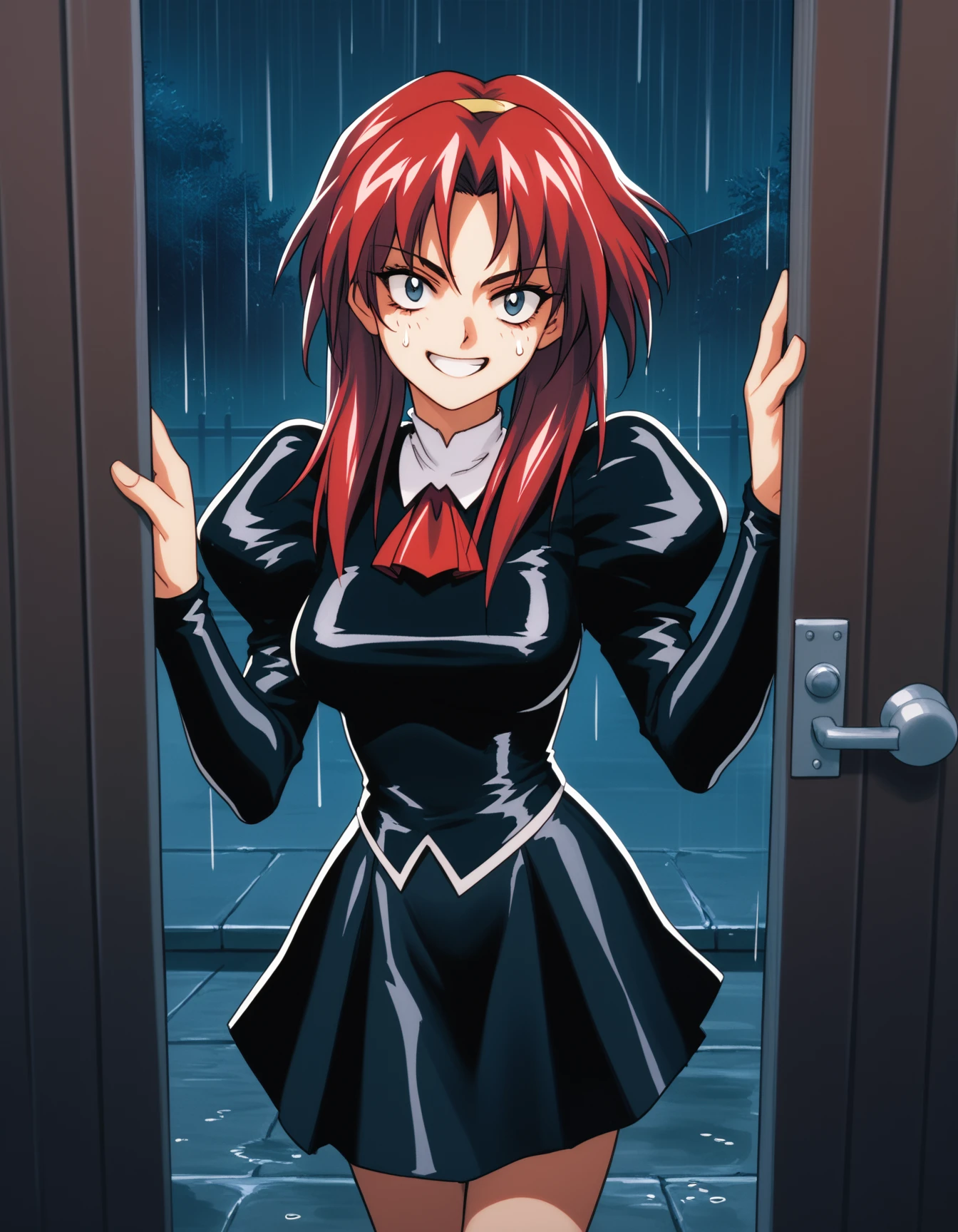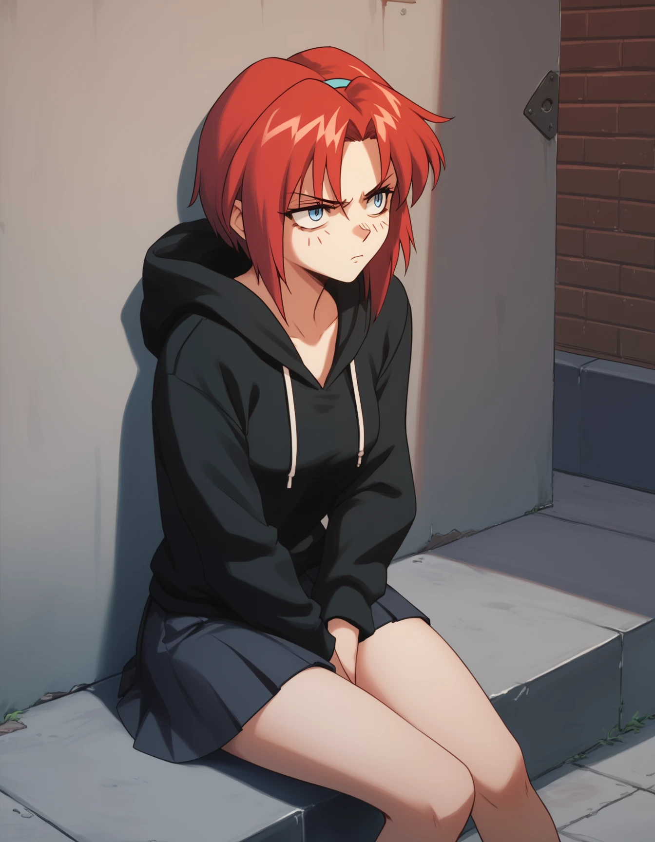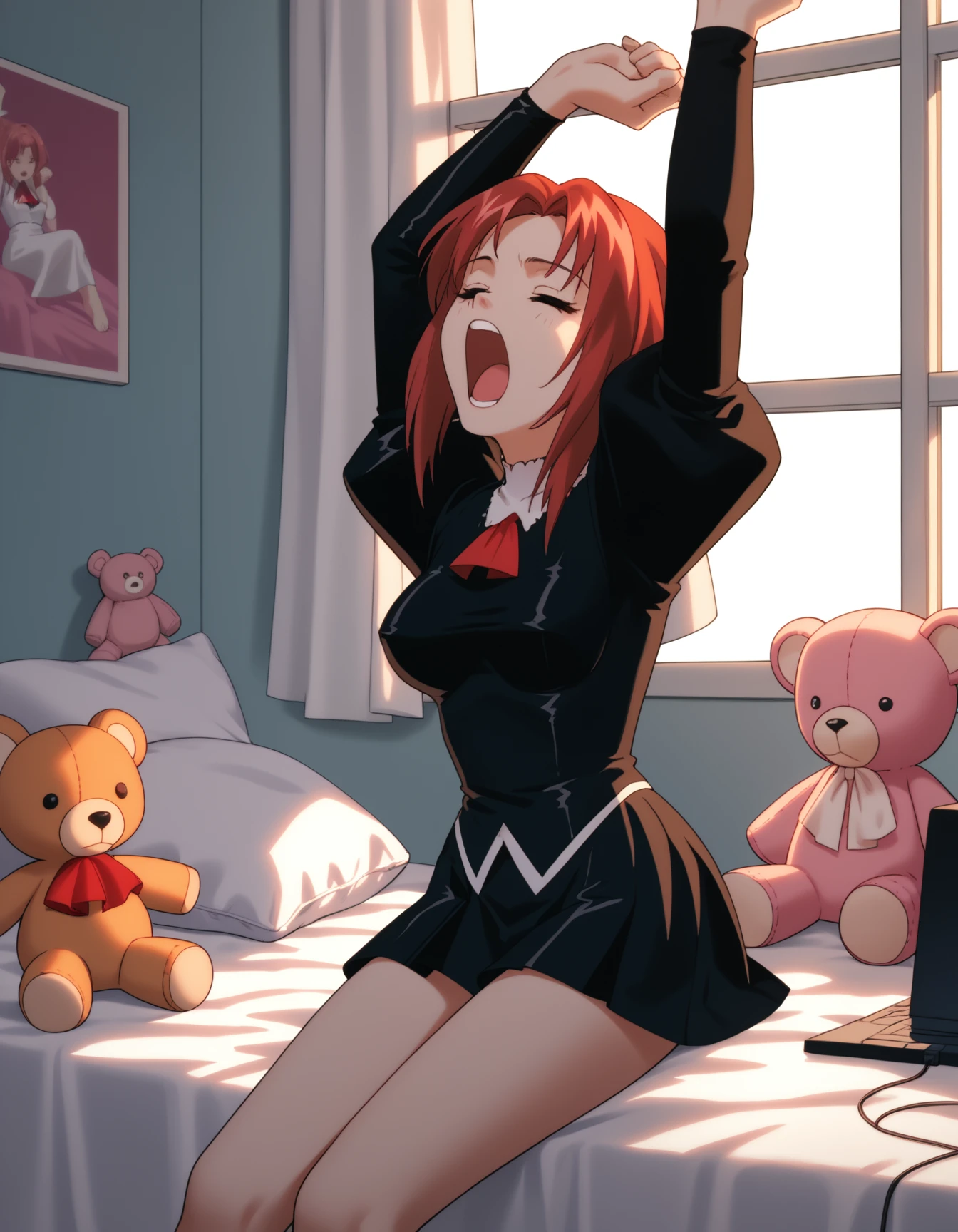 m4yp1a, red hair, black uniform, black skirt, juliet sleeves, red ascot