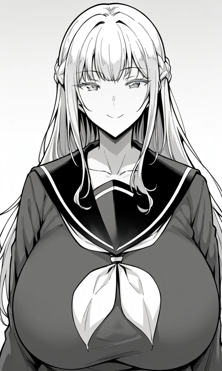 greyscale, monochrome, long hair, bangs, braid