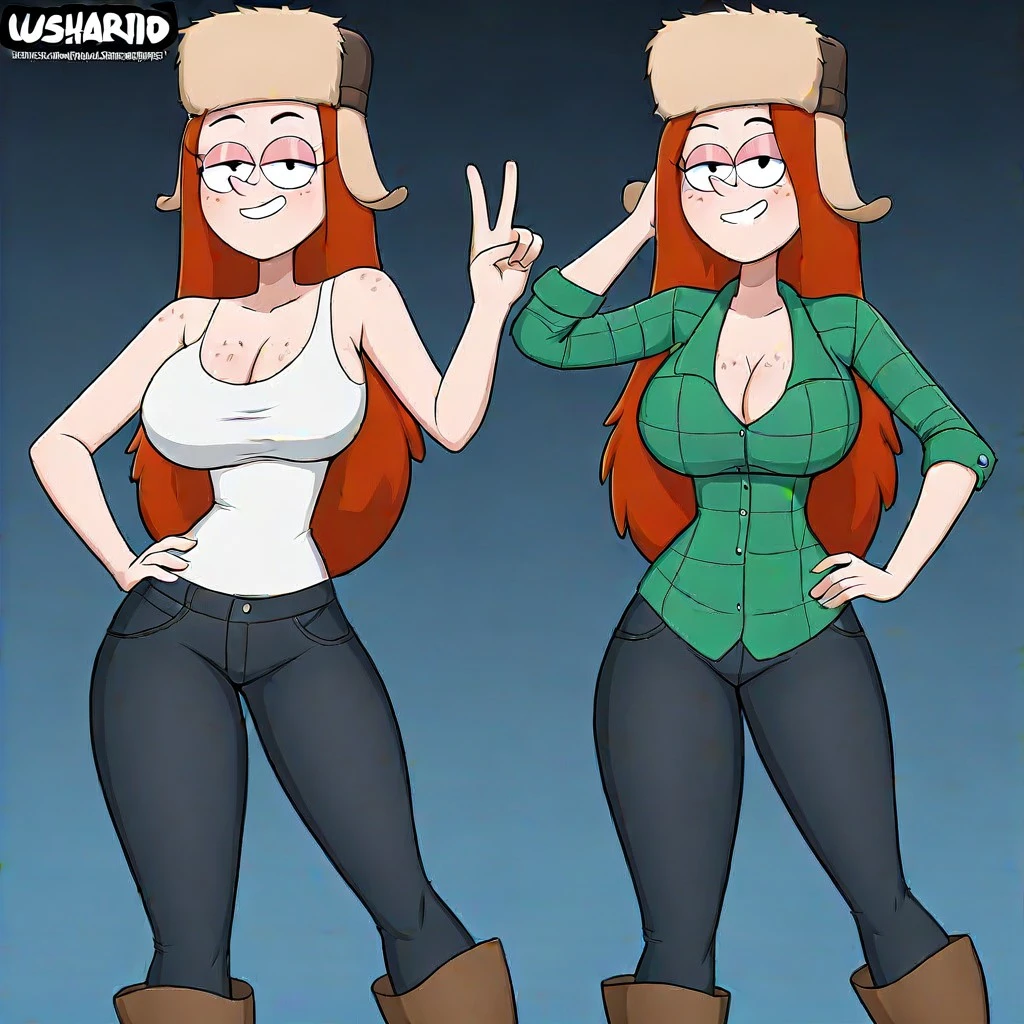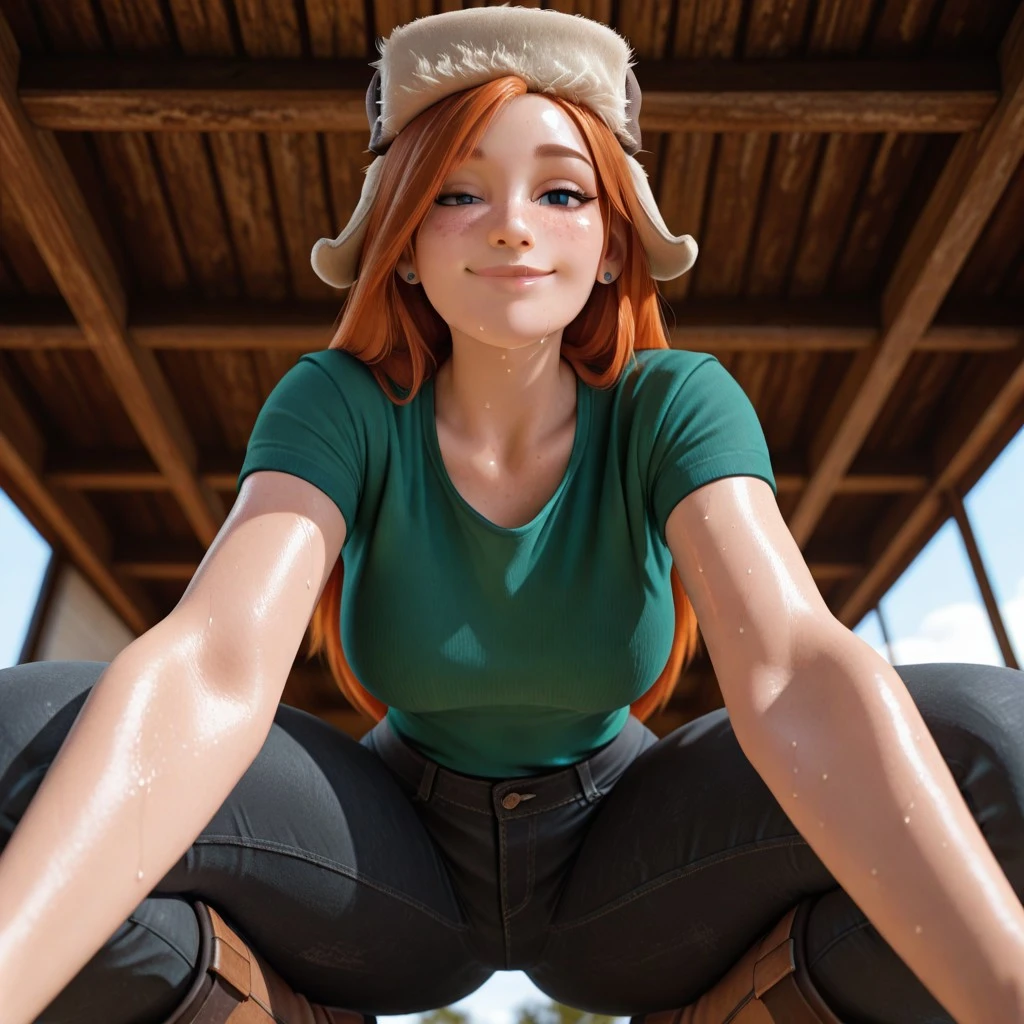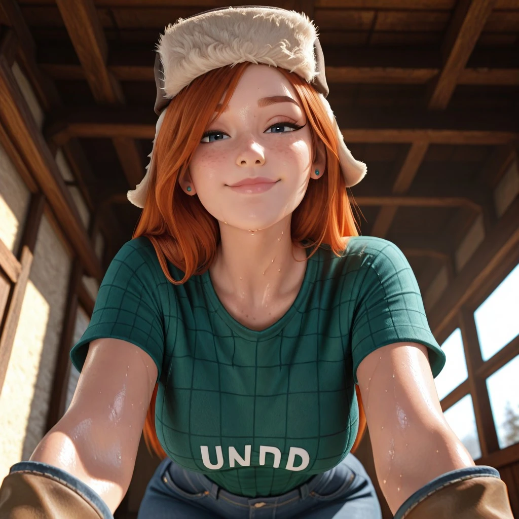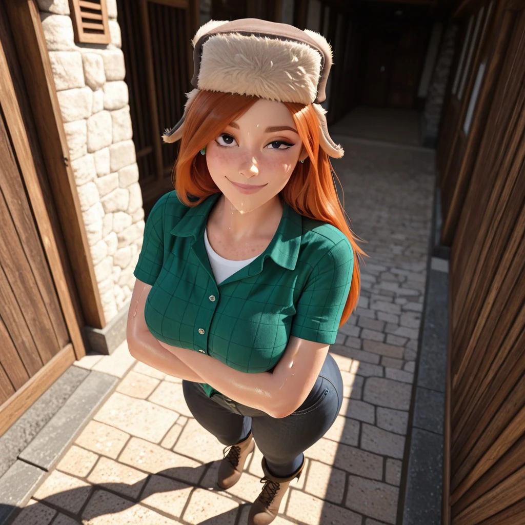 OUTFIT NORMAL: hat, pants, freckles, fur hat, smile, hand on hip, shirt, ushanka, brown headwear, denim, white undershirt, green praid shirt, plaid shirt
