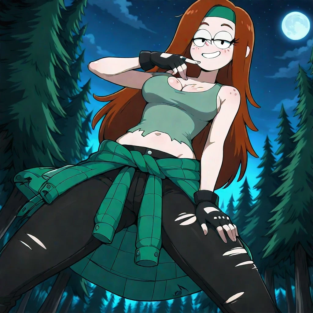 OUTFIT WEIRDMAGEDDON: gloves, white sleeveless shirt, clothes around waist, torn clothes, long hair, fingerless gloves, pants, smile, navel, torn pants, midriff, black gloves, headband, tank top, black jeans, shirt around waist