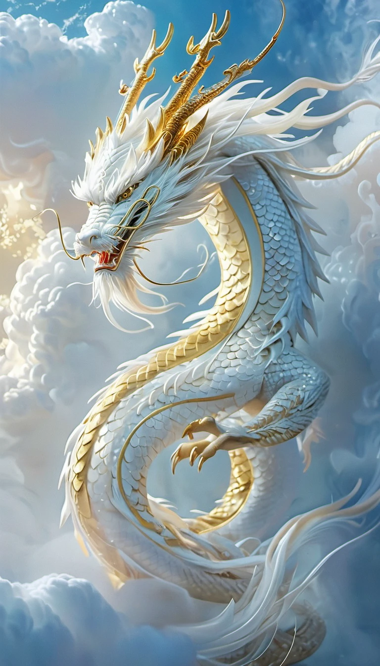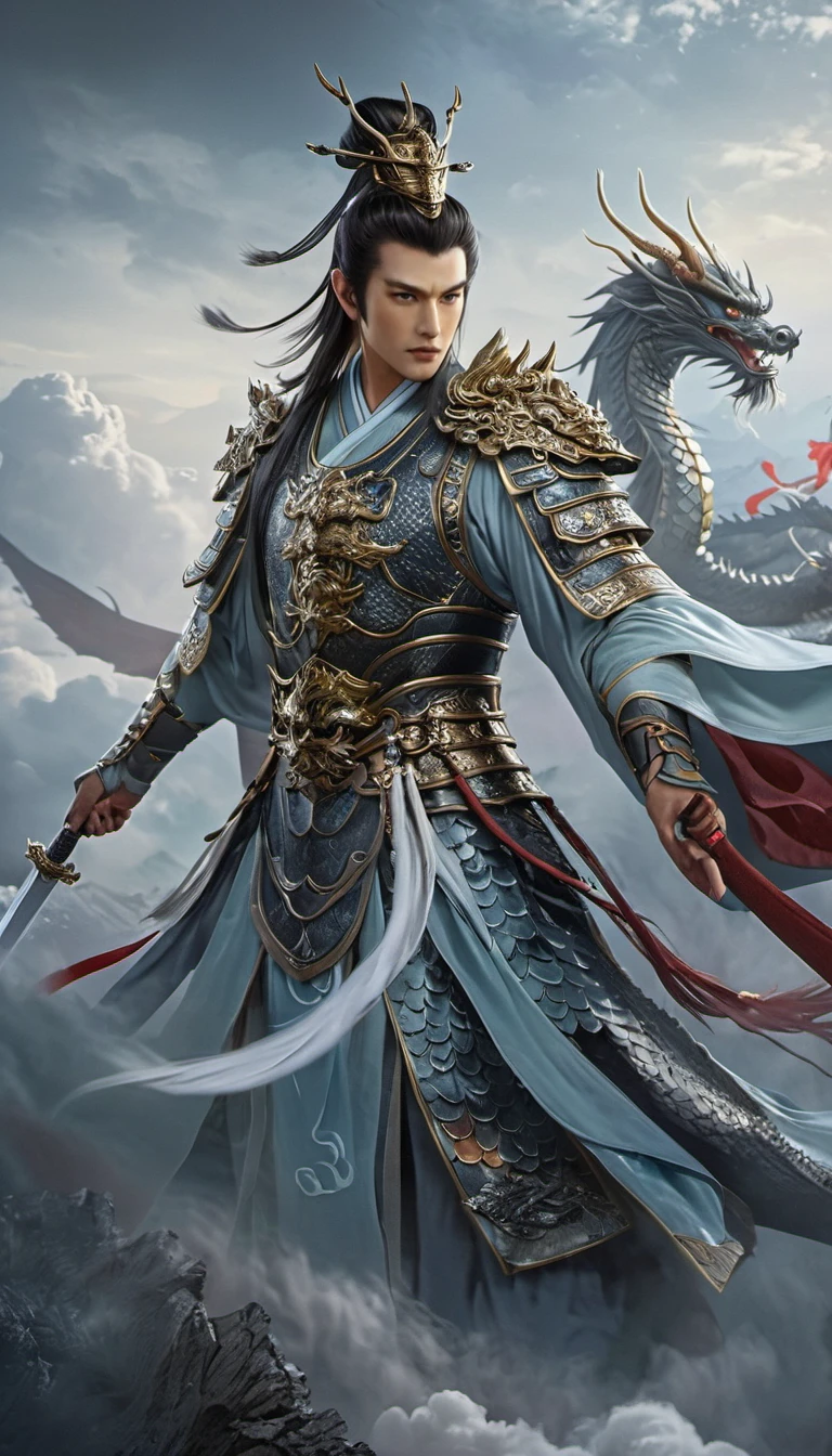 The background is a misty sky, with a dragon hovering behind the characters.highly detailed, 32K UHD, best quality, masterpiece