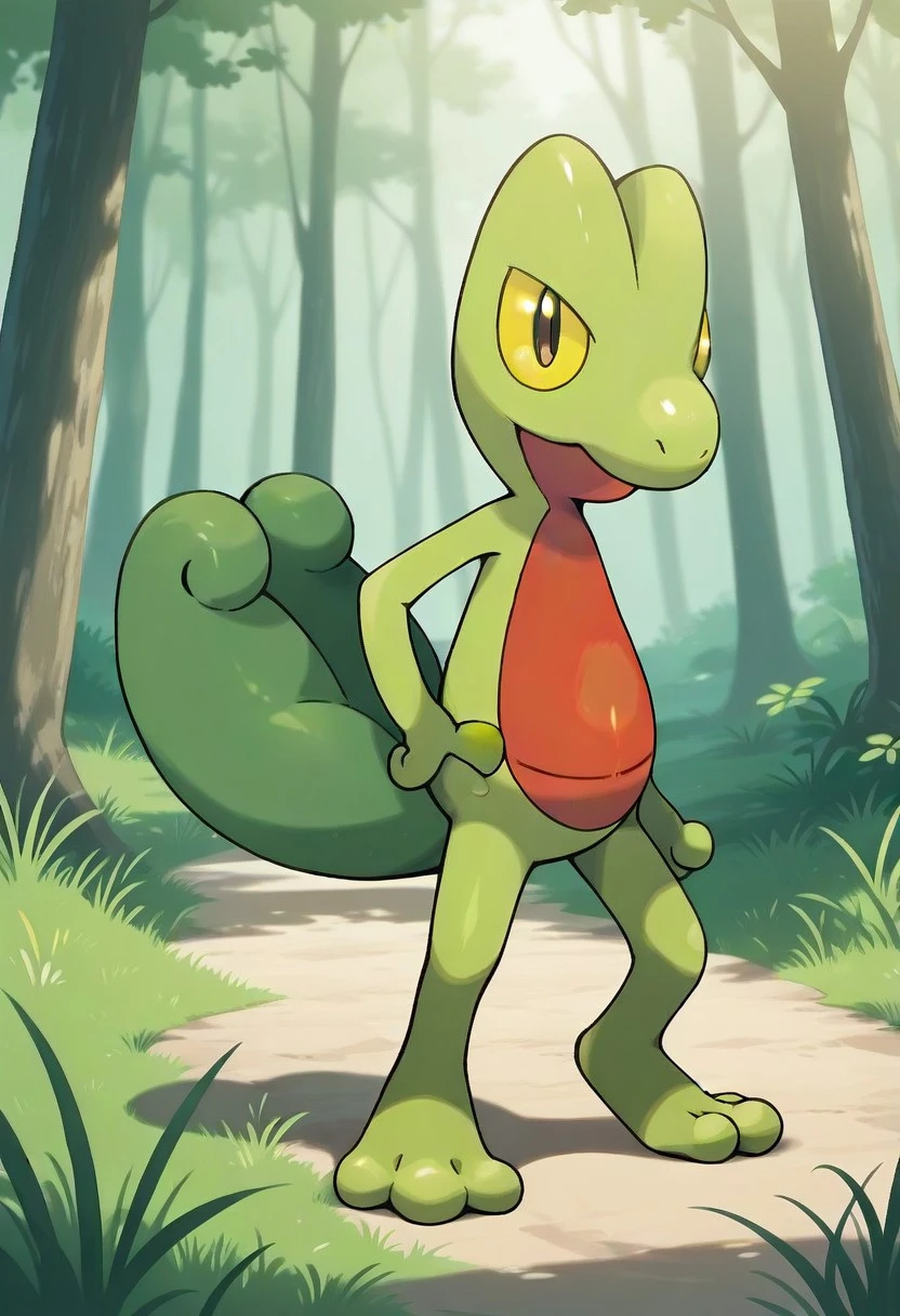 Treecko, green skin, yellow sclera, black pupils, green tail, webbed feet