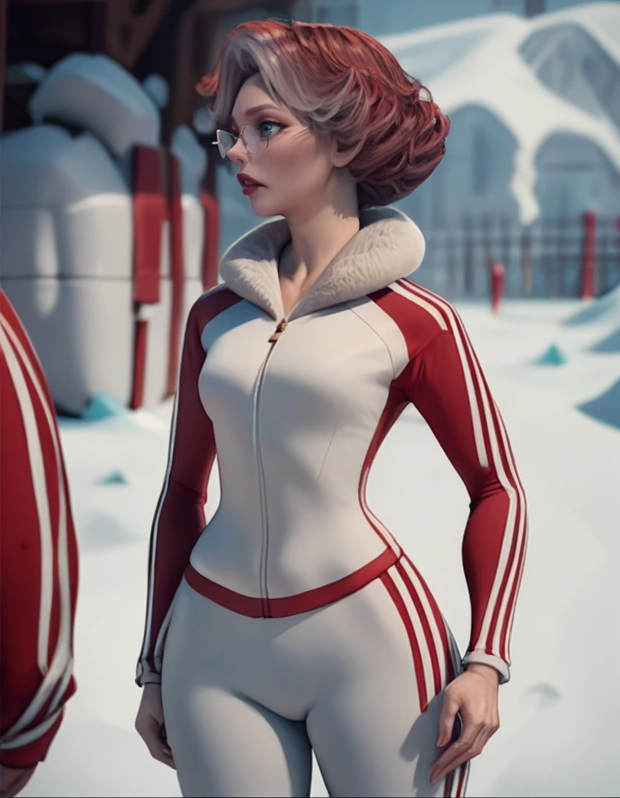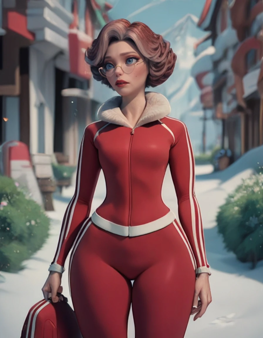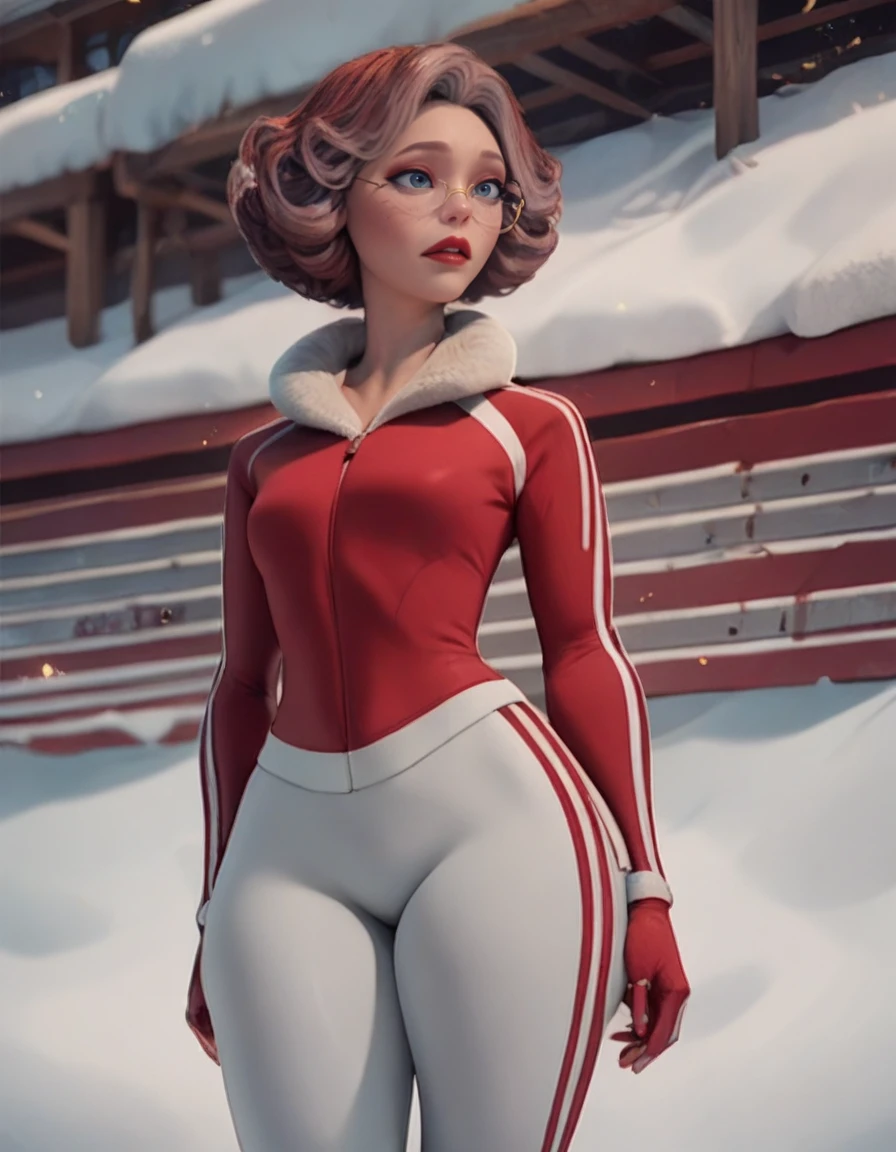 Helpful Outfit Tags: track suit, red jacket, red pants, track pants, long sleeves, fur trim, zipper, red dress, striped pants,