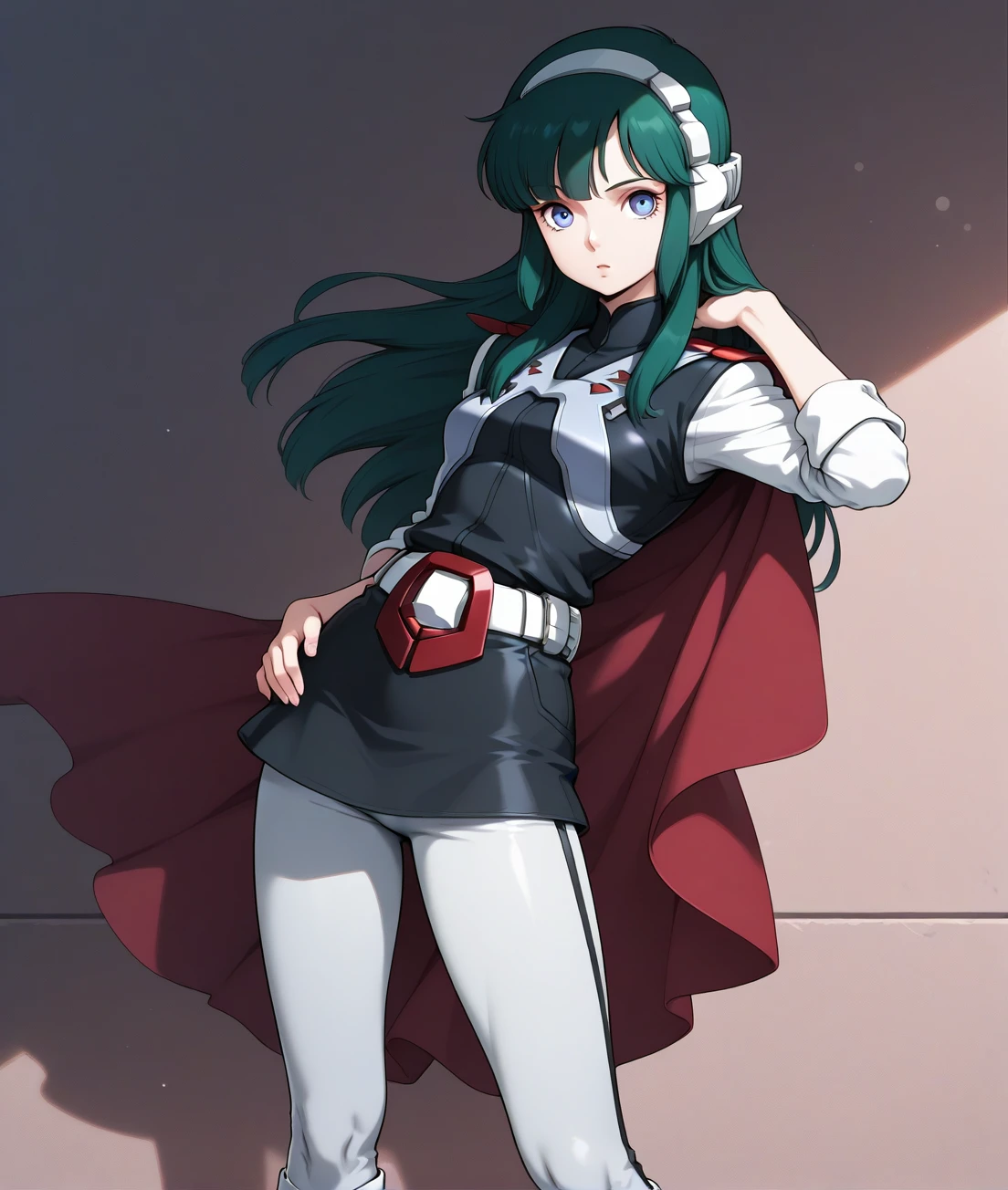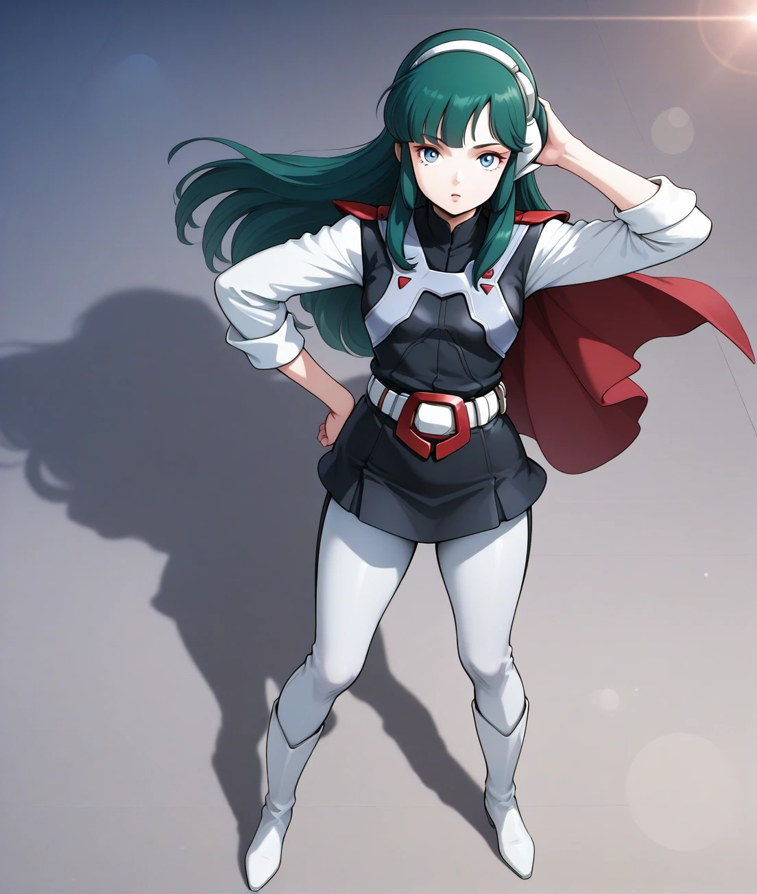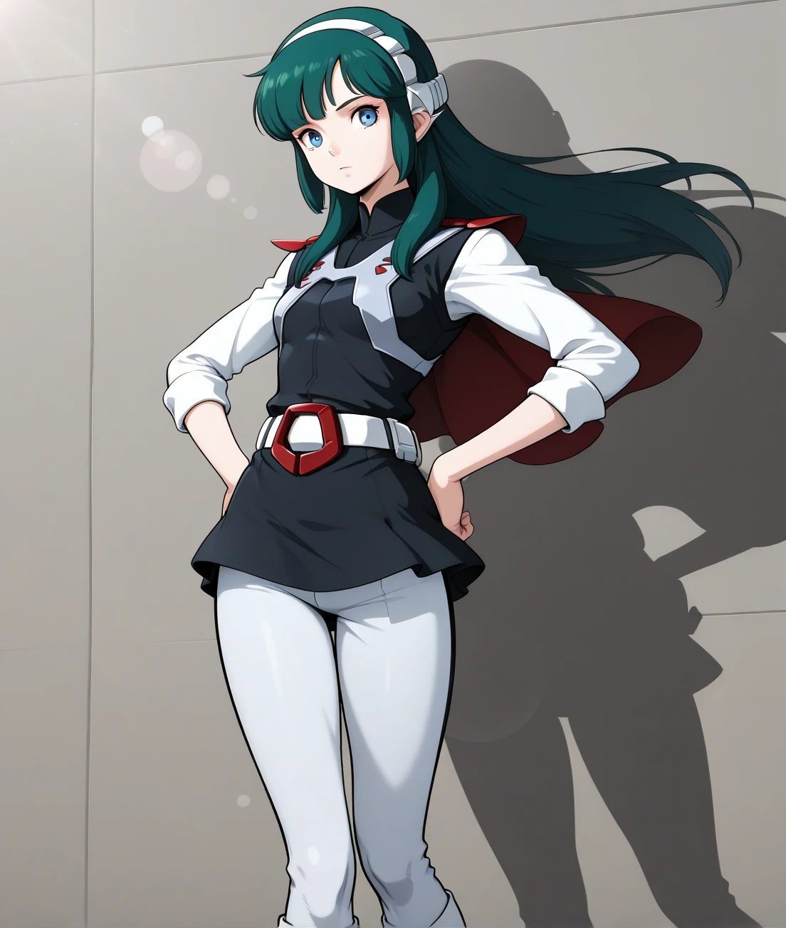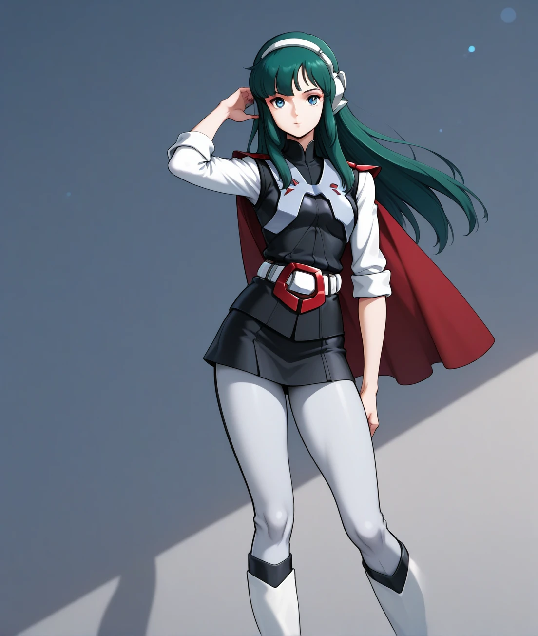 lana, long hair, green hair, belt, skirt, white boots, white pants, black uniform, red buckle, small breasts, black uniform, solo, mini skirt, short cloak, head wear, knee boots, long sleeves, white sleeves, white belt, long pants, sleeves rolled up,
