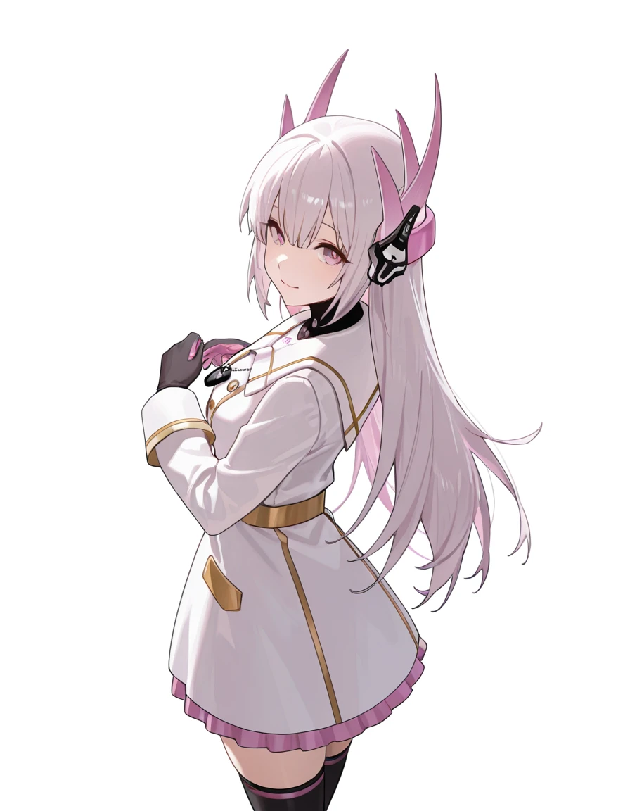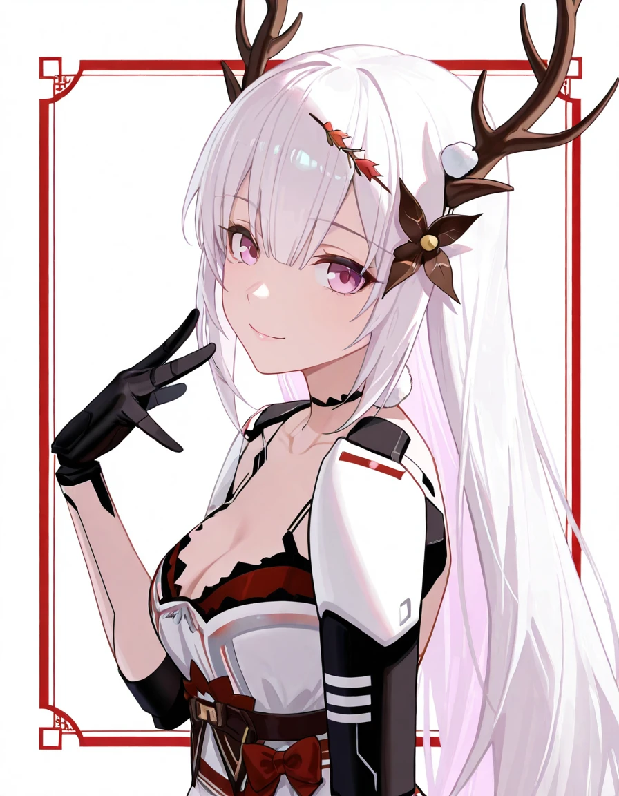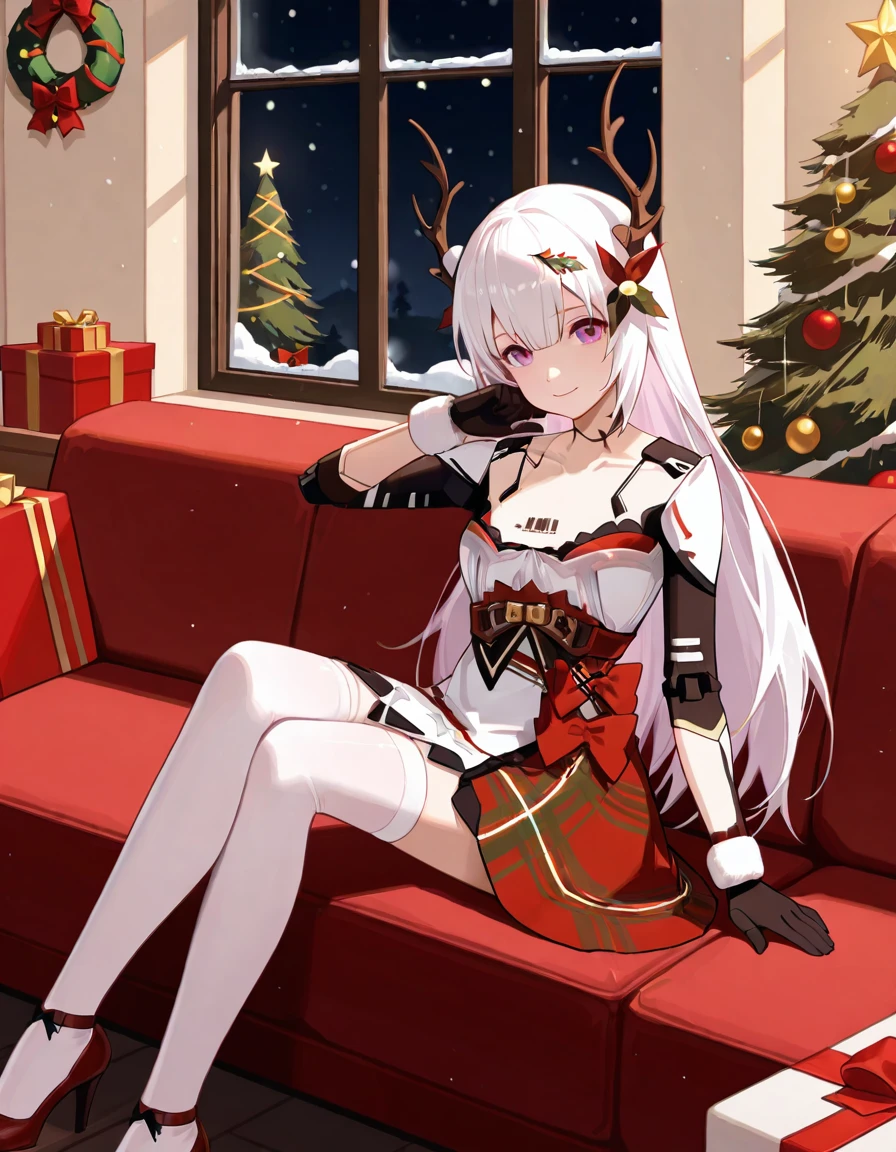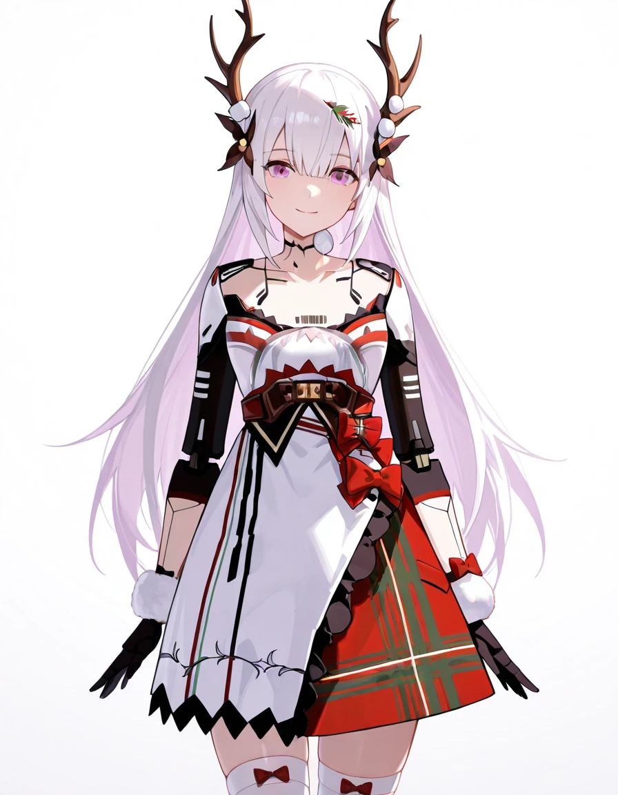 Christmas Promise, Liv, CmP_dress, CmP_neck_ornament, CmP_belt, CmP_dress_bow, CmP_skirt, CmP_hair_flower, CmP_hair_ornament, CmP_mechanical_arms, CmP_antlers, CmP_white_dress, CmP_thighhighs, CmP_high_heels, mechanical arms, CmP_barcode_tattooAgent Peacock: